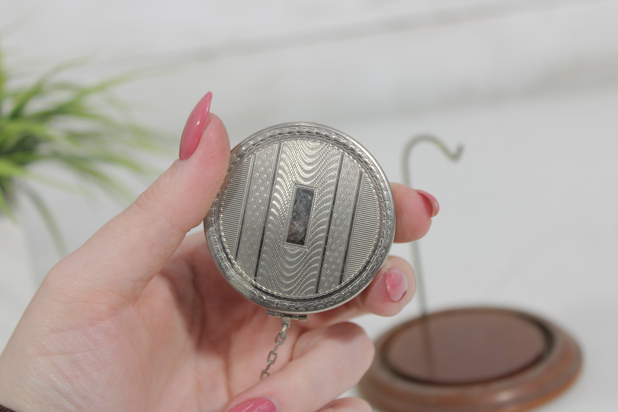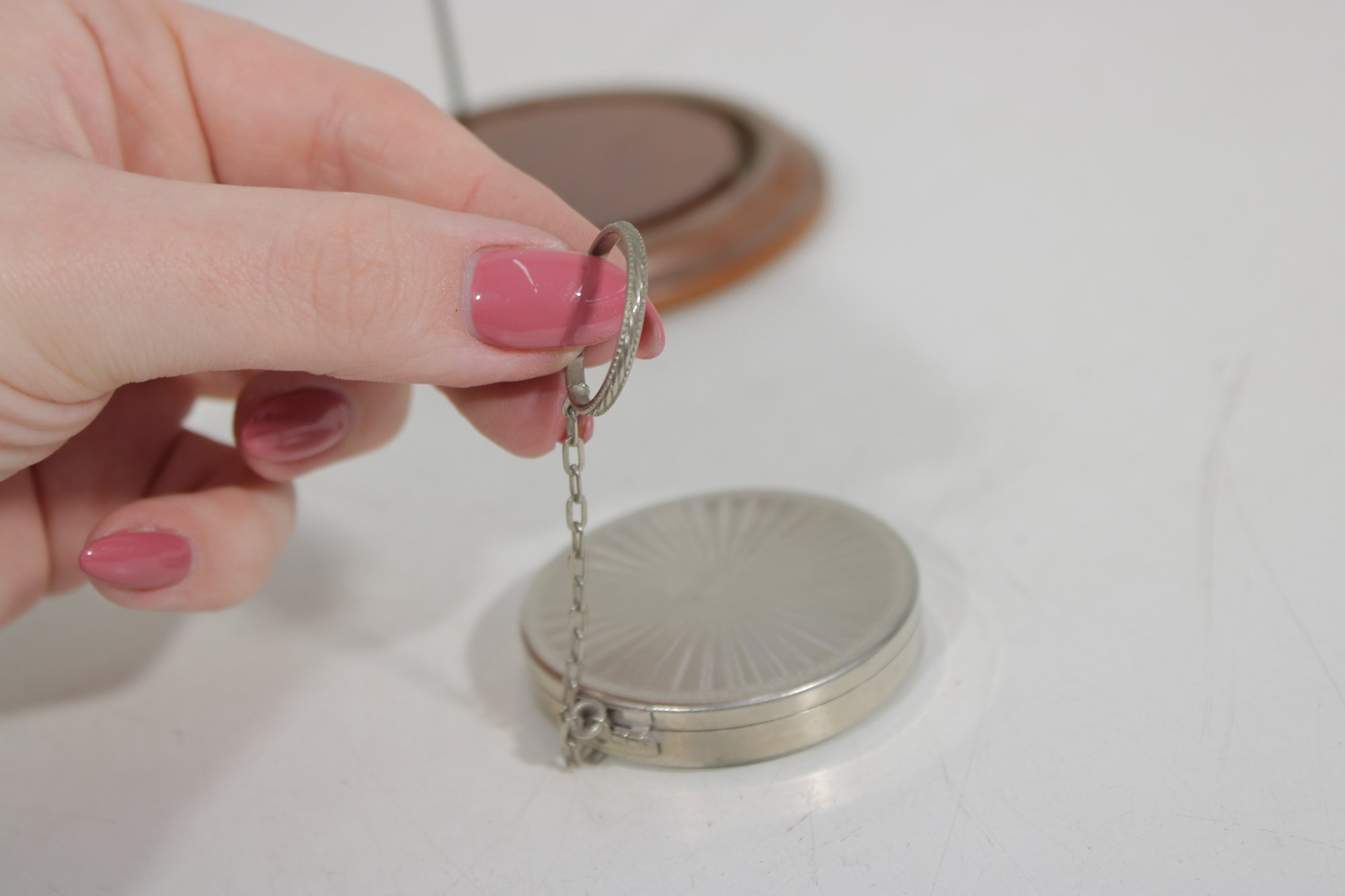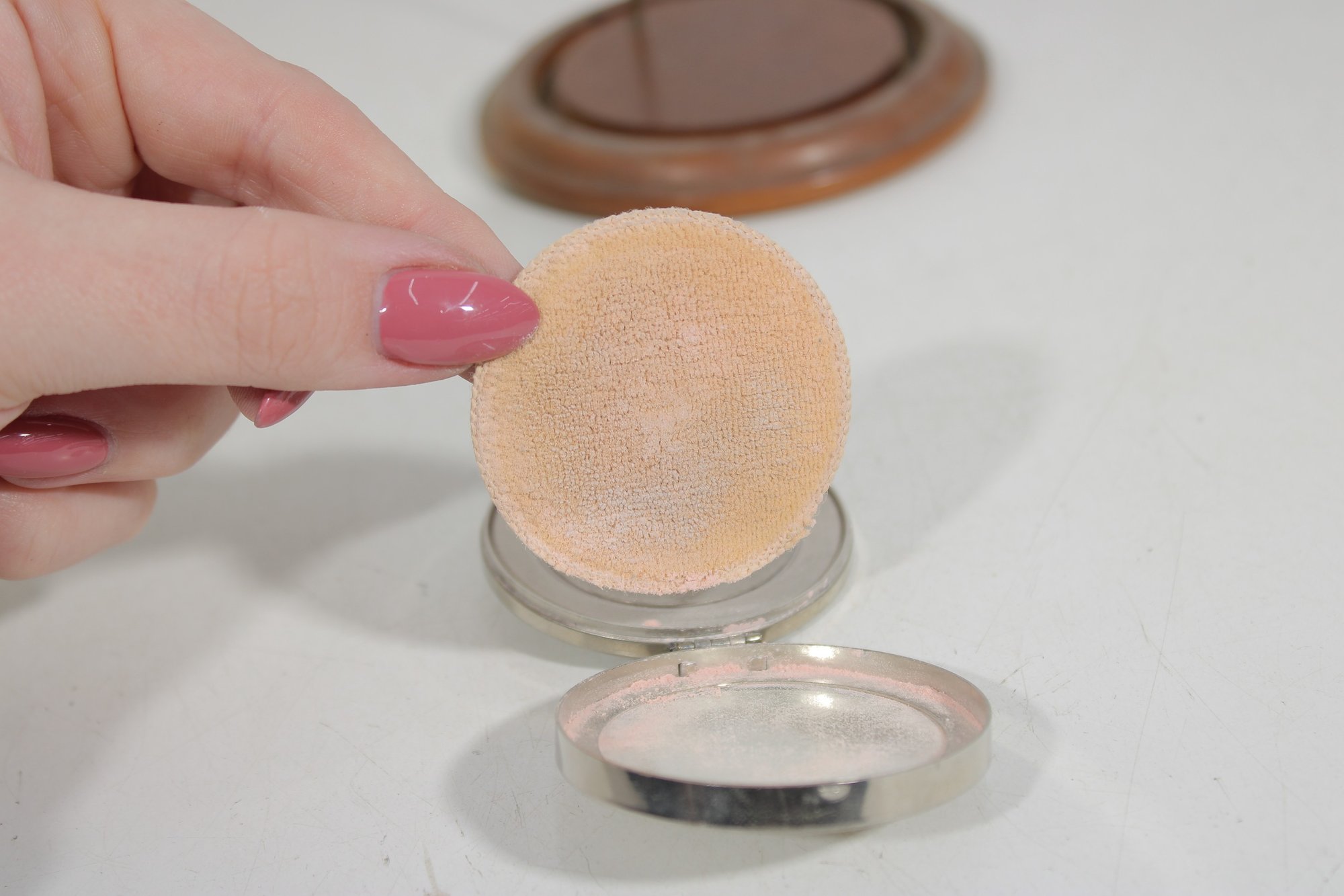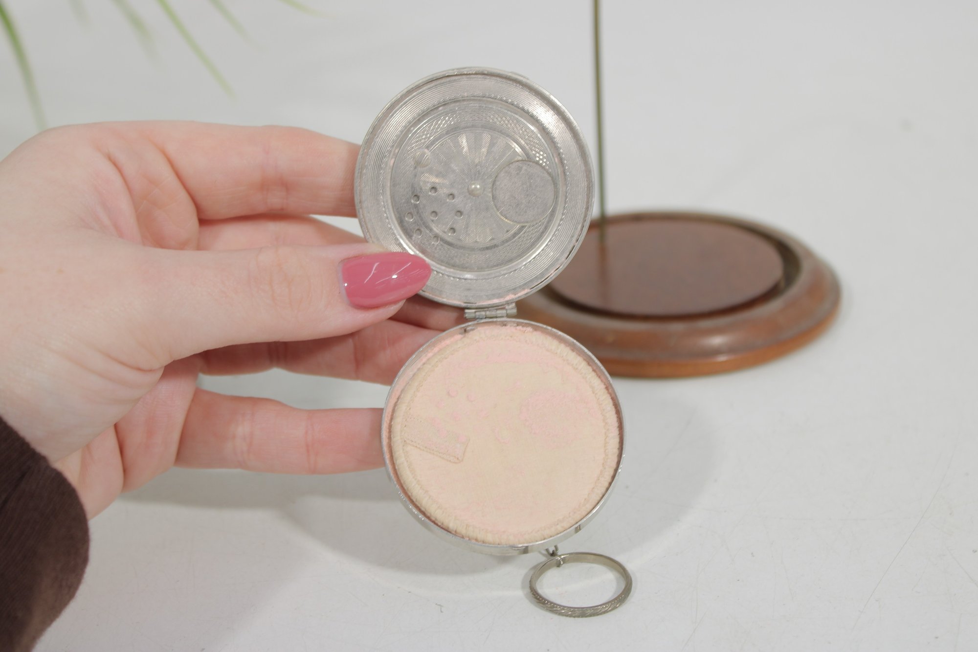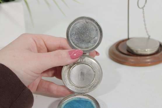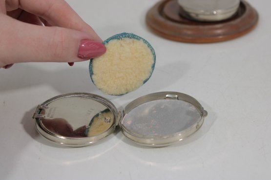 Both compacts open to reveal the original powder compartments, and one still retains its vintage powder. These are wonderful collectible pieces for Art Deco vanity displays, cosmetic history collectors, or antique compact collections.