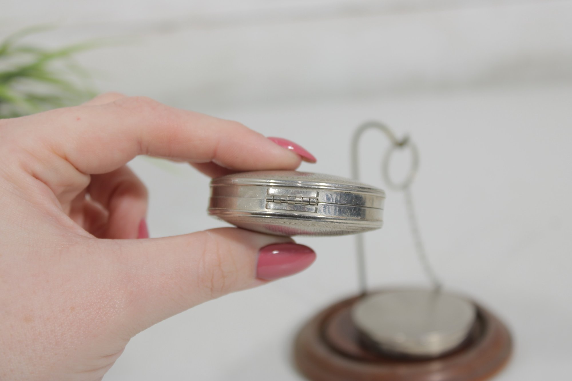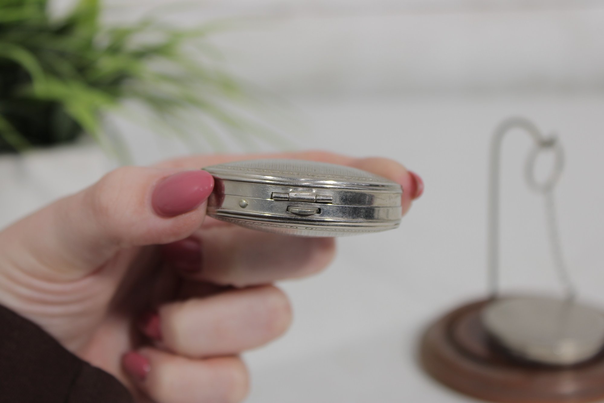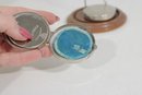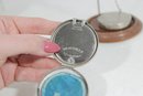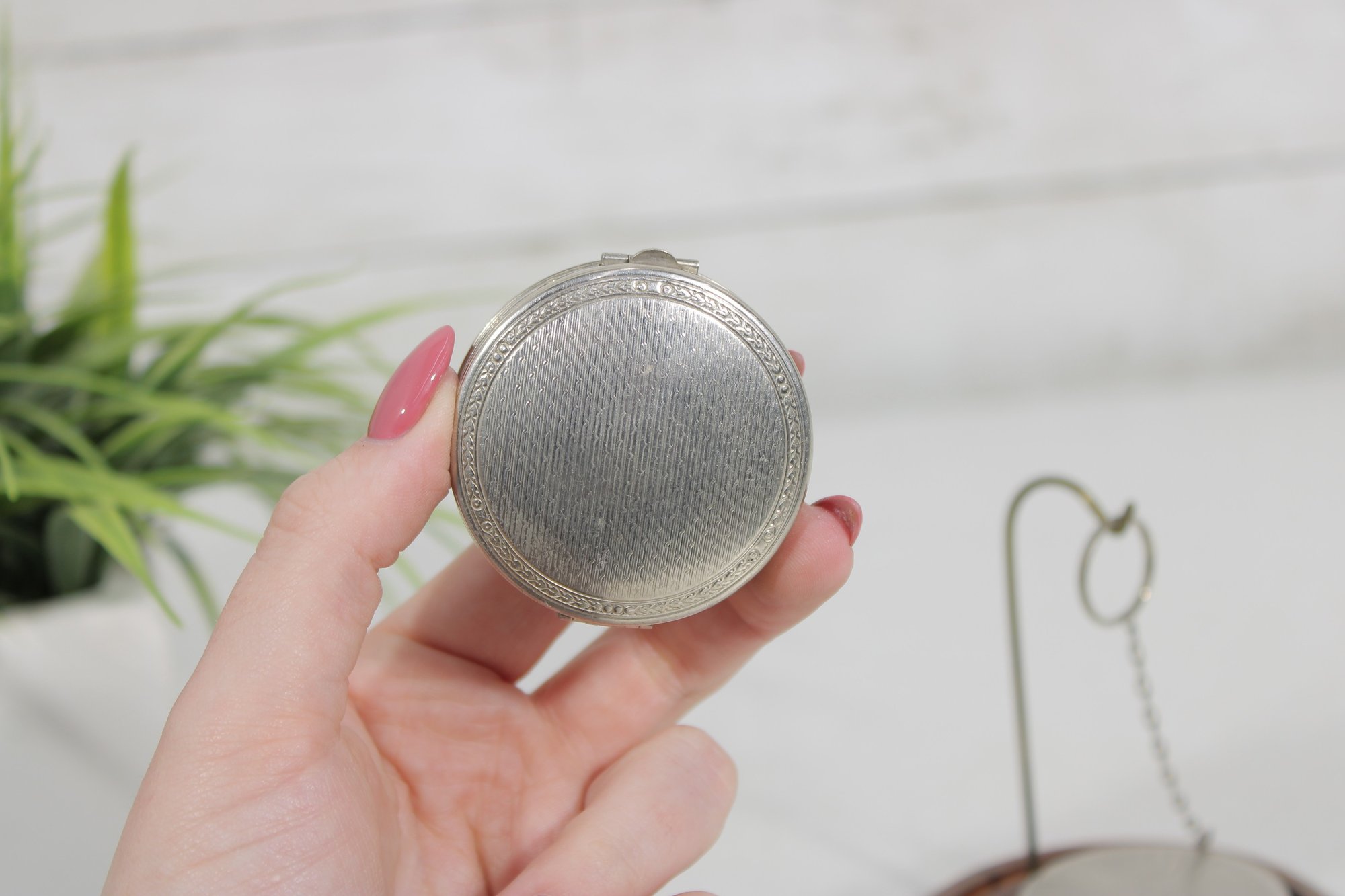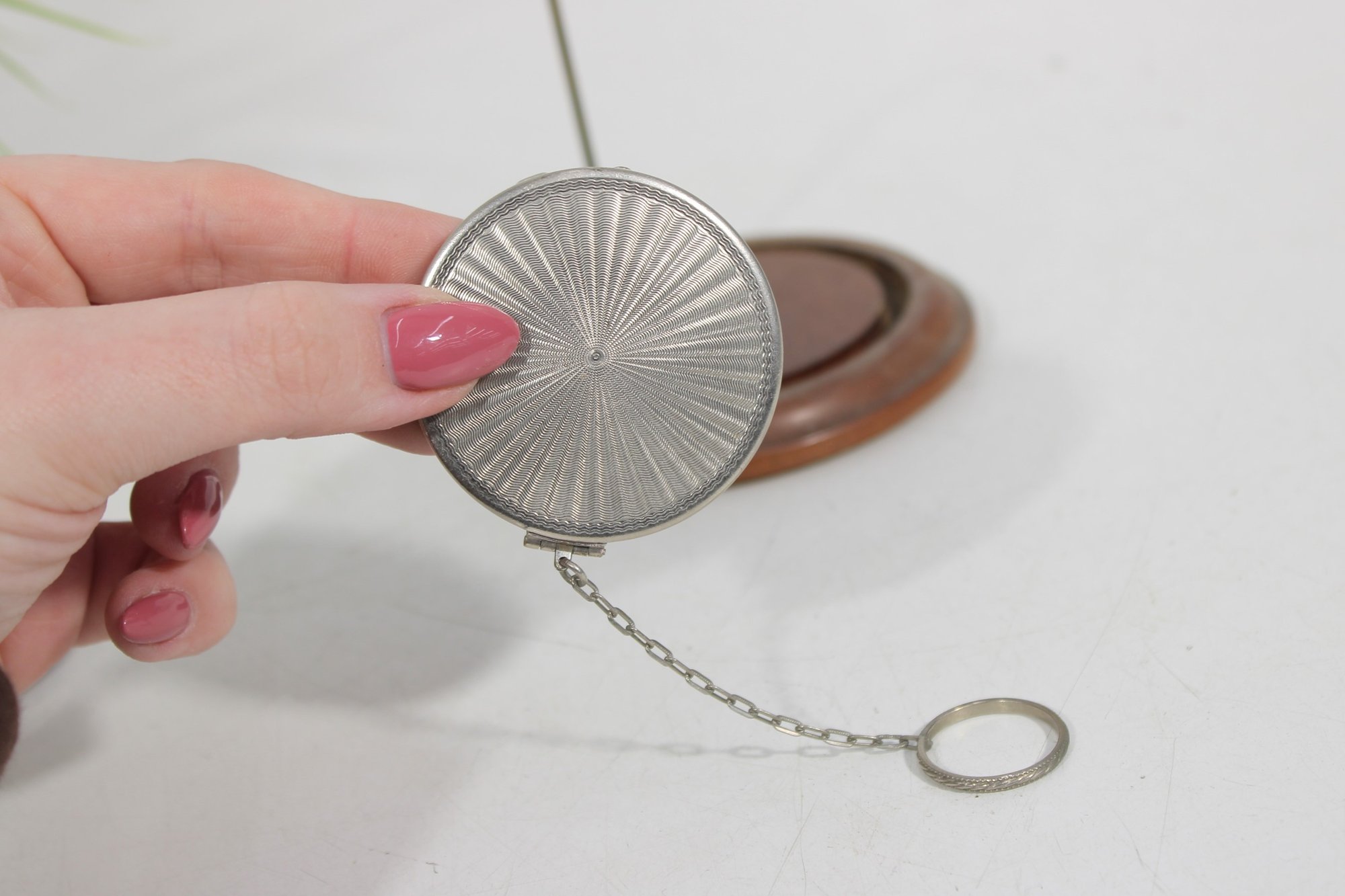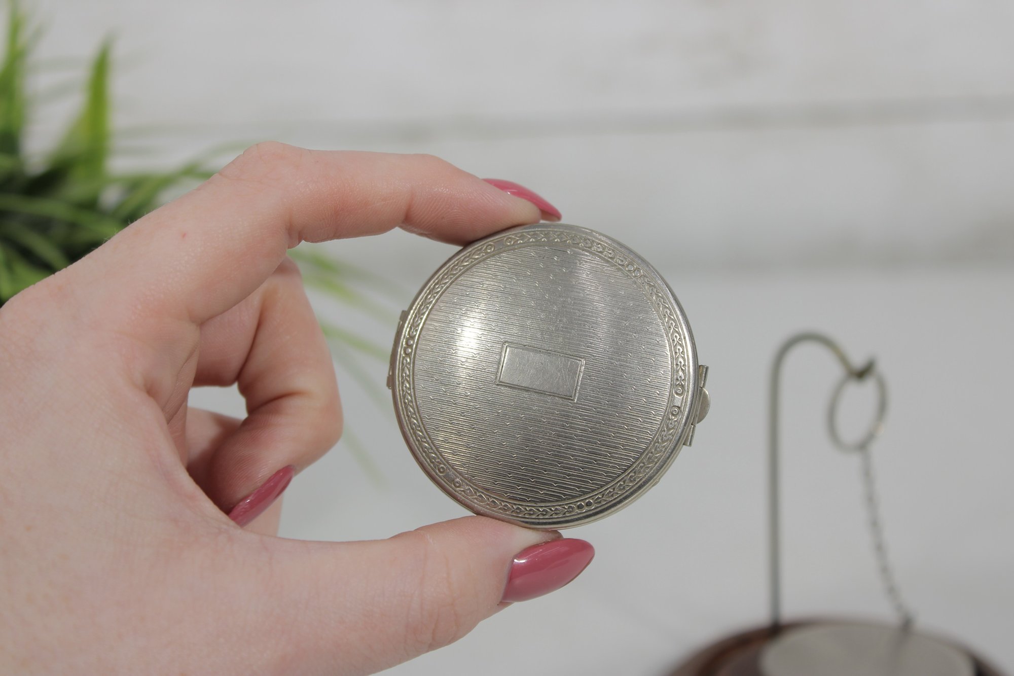 Both compacts open to reveal the original powder compartments, and one still retains its vintage powder. These are wonderful collectible pieces for Art Deco vanity displays, cosmetic history collectors, or antique compact collections.