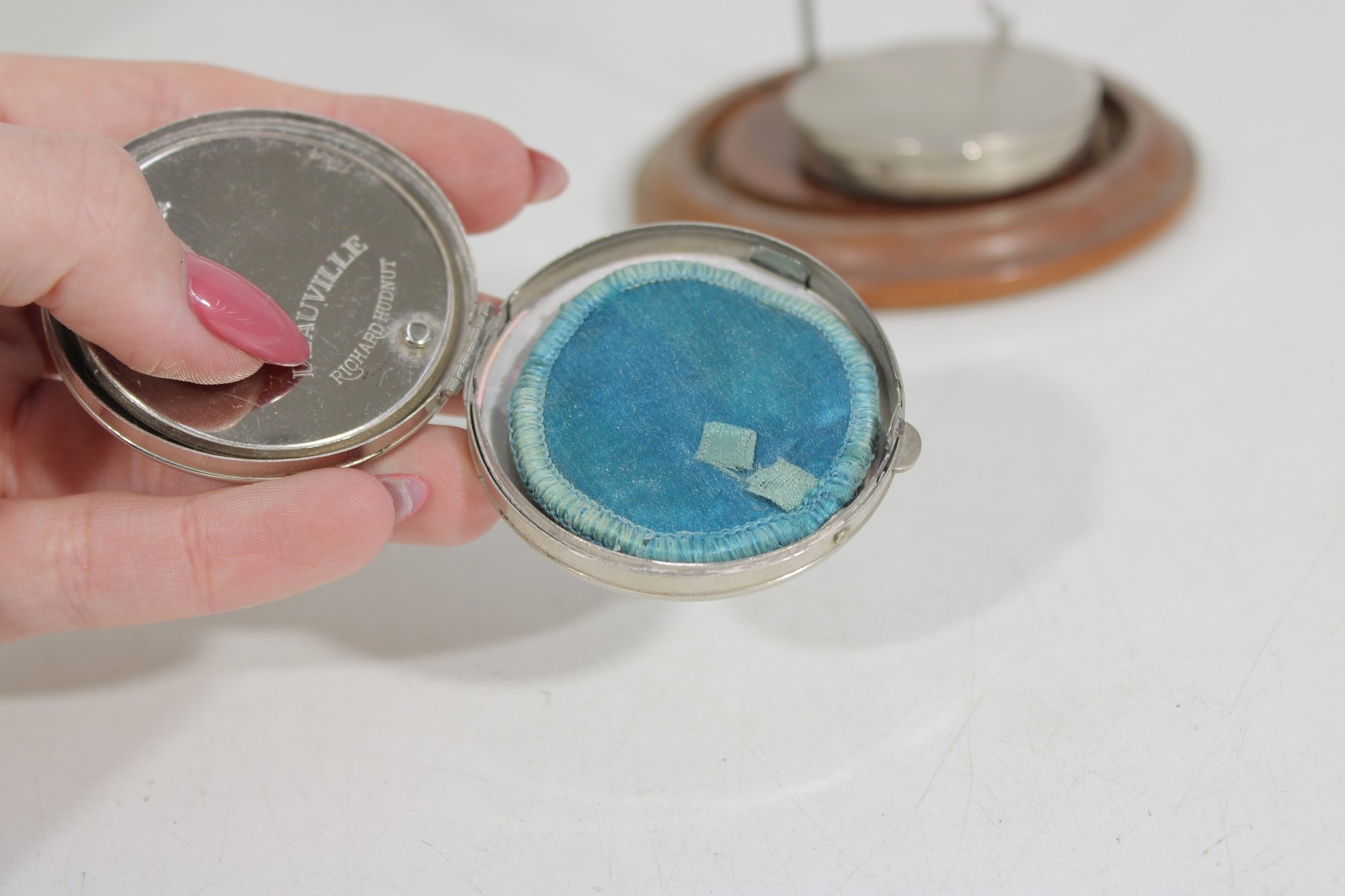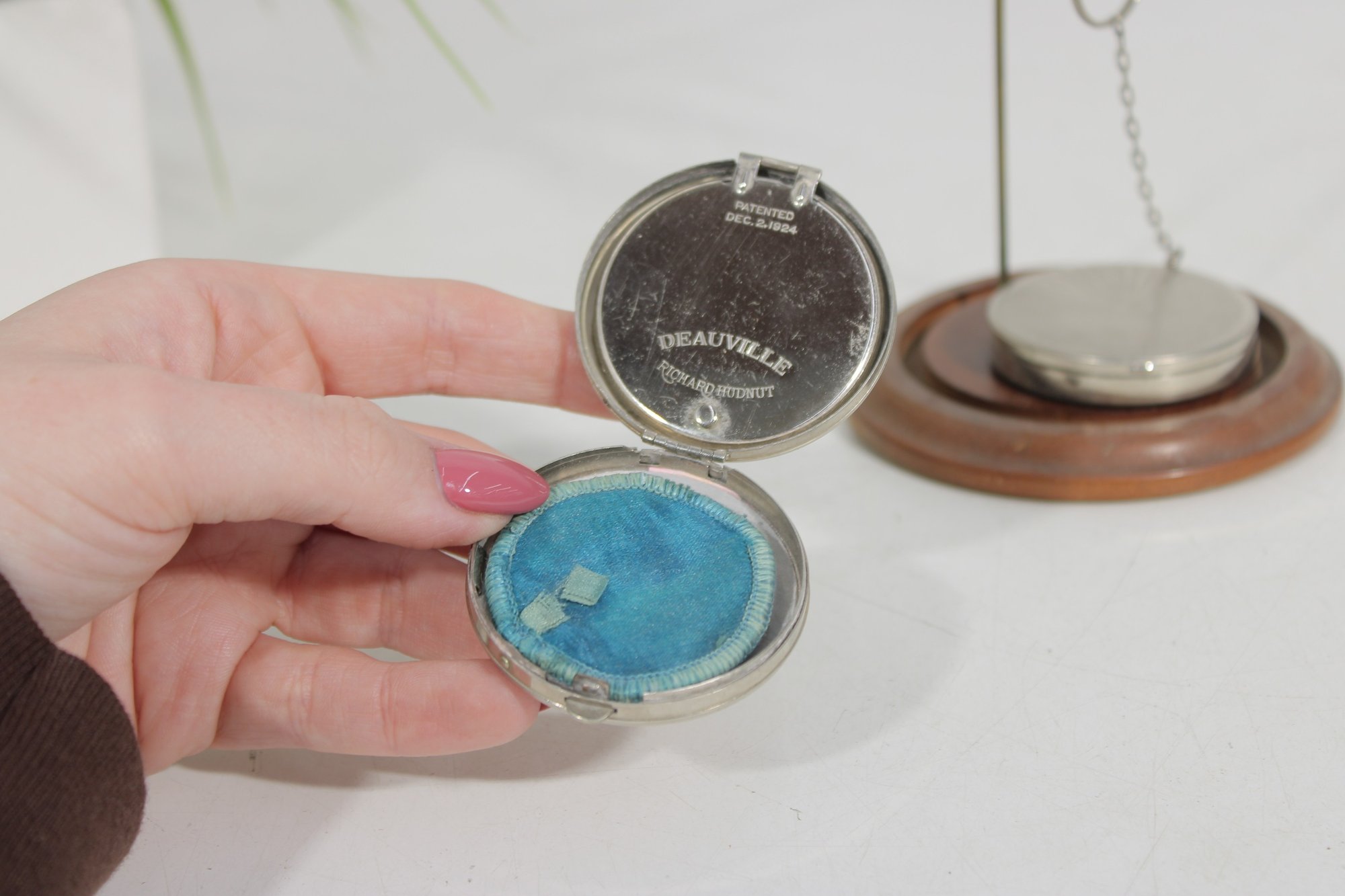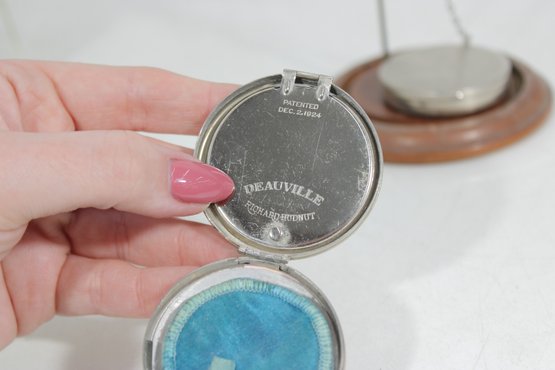 One compact includes a chain with finger ring, a popular feature of early 20th-century compacts designed for convenient use while touching up powder. The interiors are marked “Richard Hudnut – Deauville”, referencing the well-known American cosmetics brand popular in the 1920s–1940s.