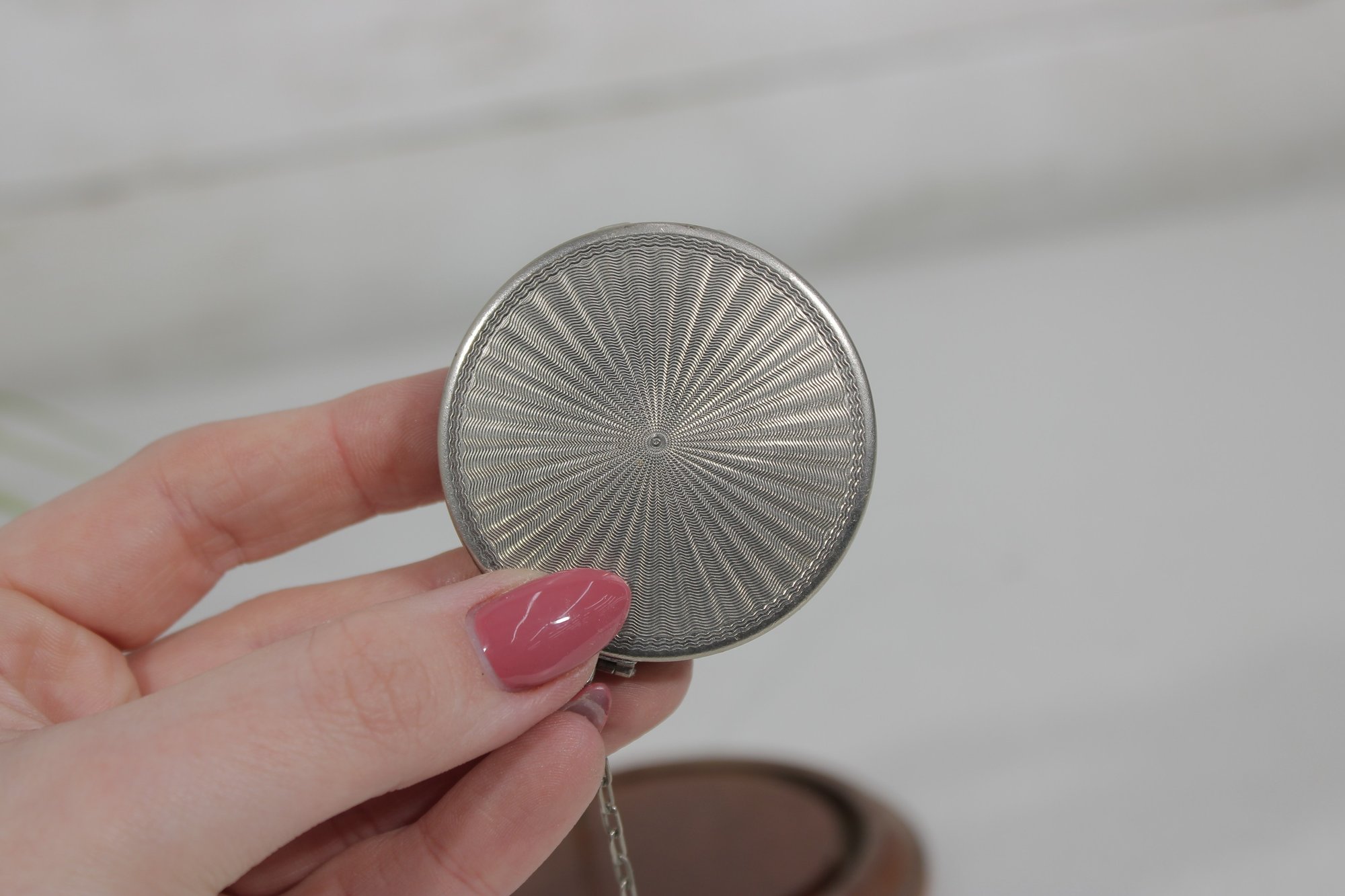 pair of vintage Art Deco powder compacts by Richard Hudnut – Deauville. These classic vanity accessories feature beautifully engraved metal cases with geometric Art Deco styling and radiating engine-turned patterns.