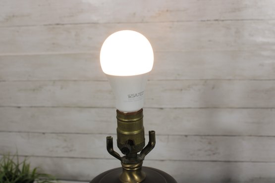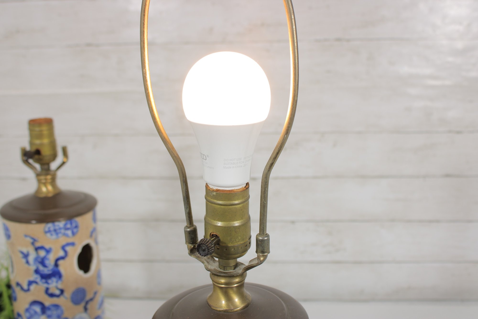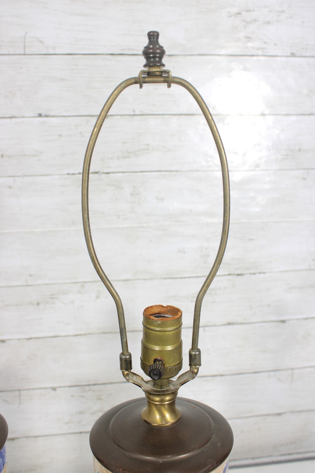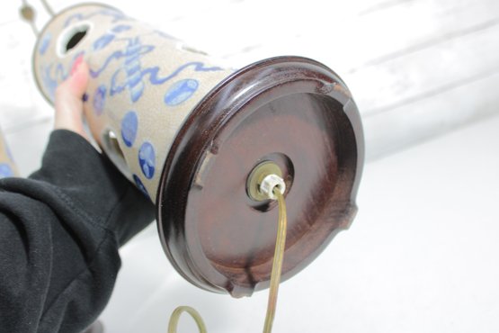 Each lamp is mounted on a dark wood base with brass hardware, giving the pair a traditional and elegant appearance. Their timeless design makes them perfect for bedside tables, living rooms, offices, or accent lighting in traditional or Asian-inspired interiors.