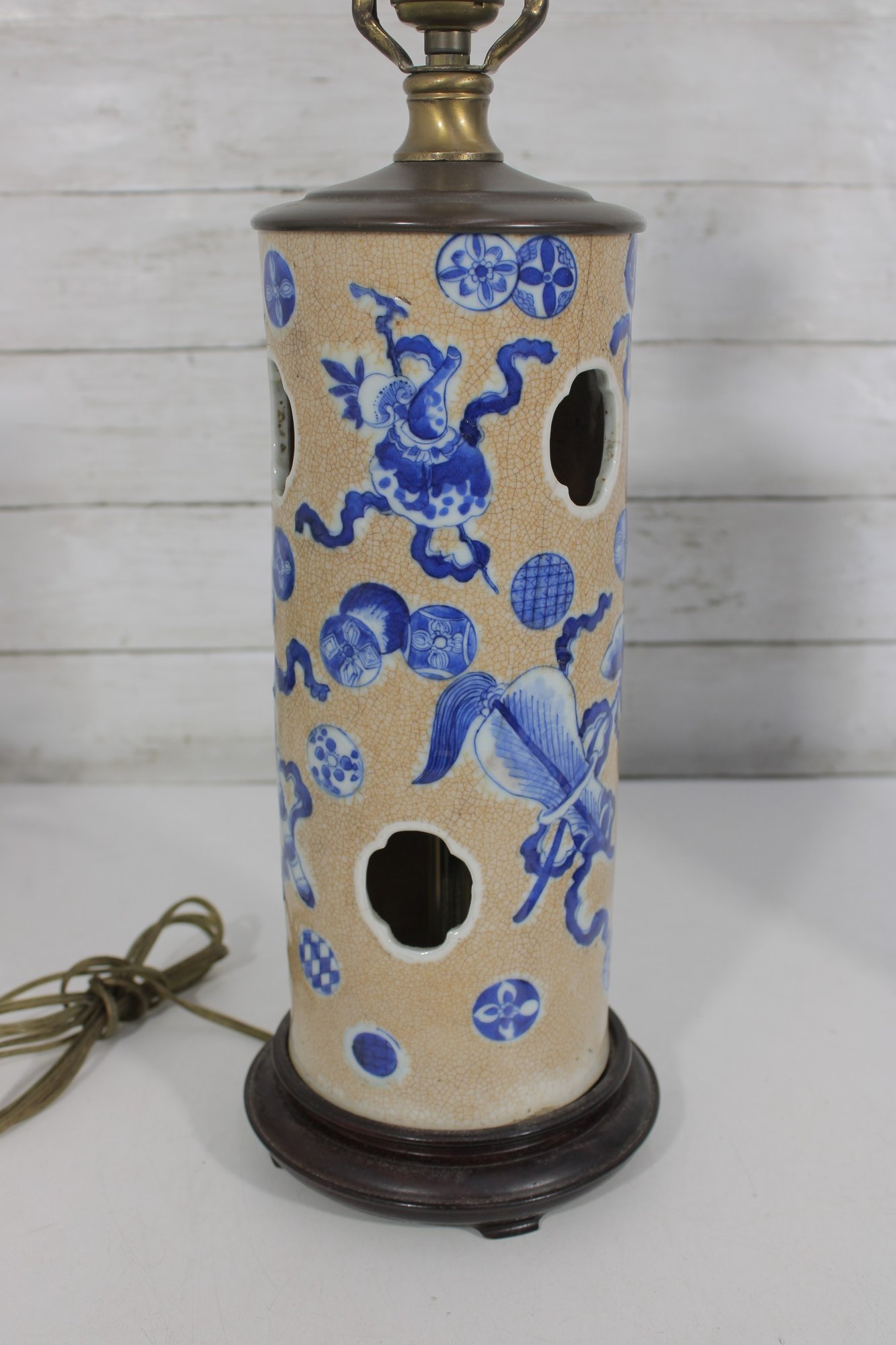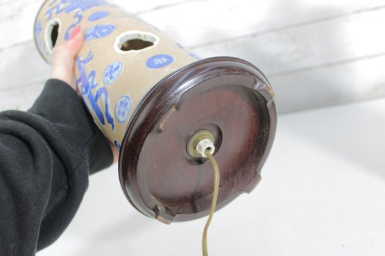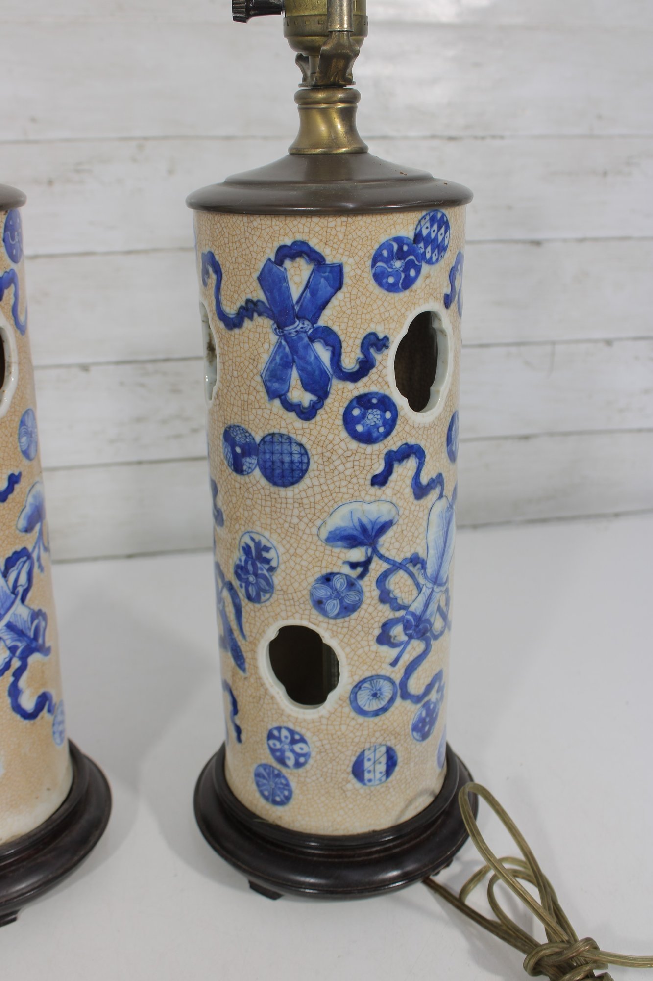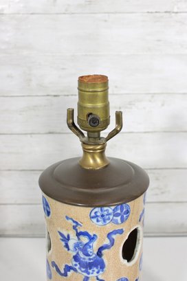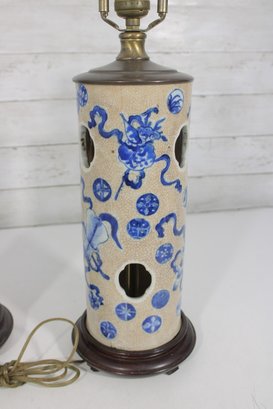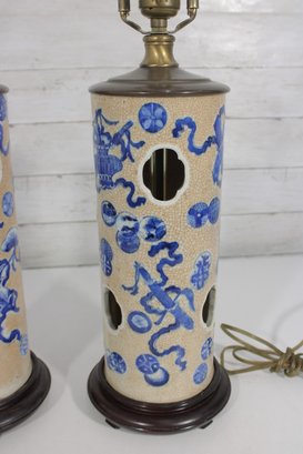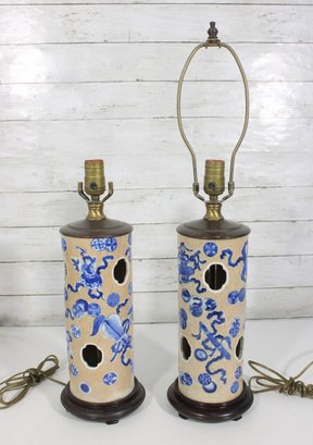 Beautiful pair of Chinese-style porcelain table lamps featuring a classic blue and white decorative motif. The cylindrical bodies are adorned with stylized floral and scrolling patterns, along with decorative pierced accents that add visual interest and character.