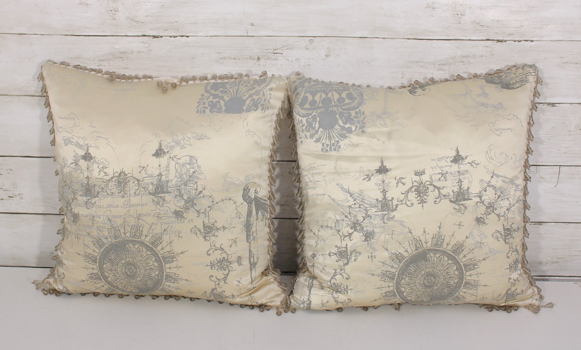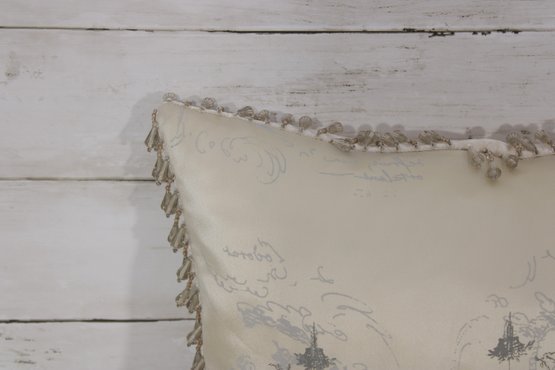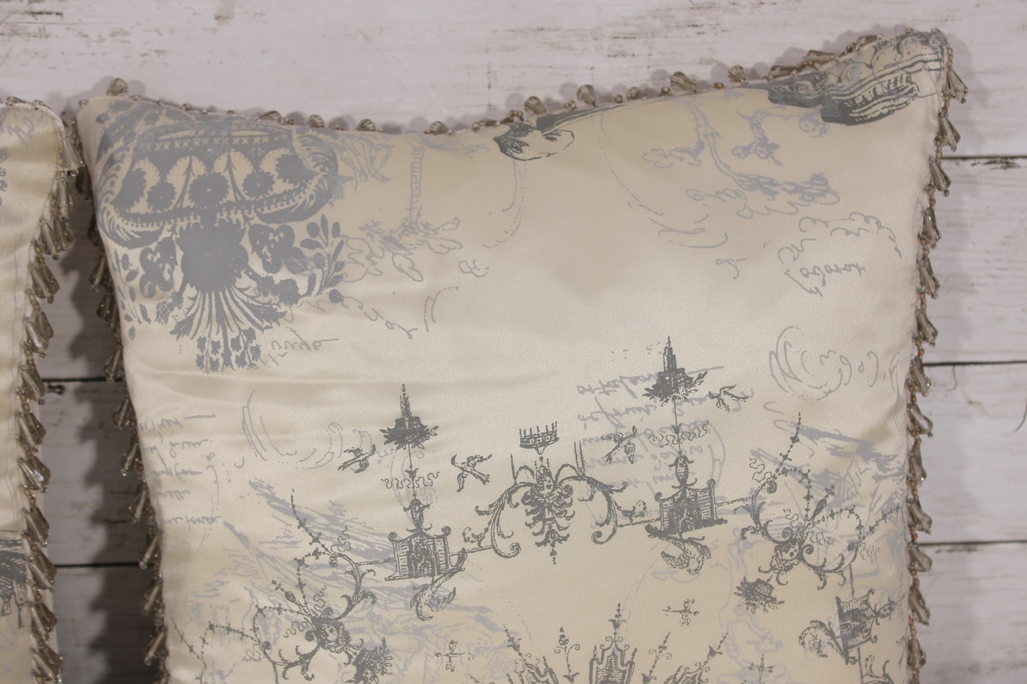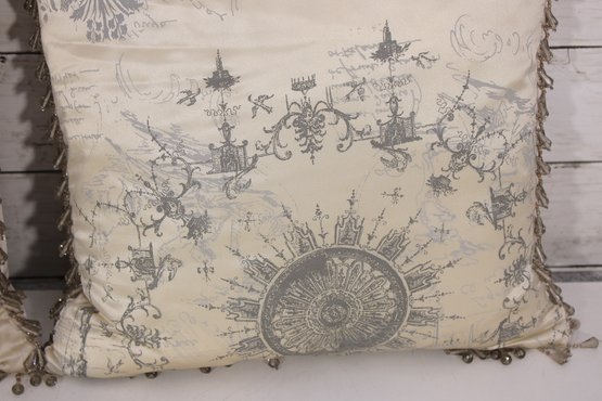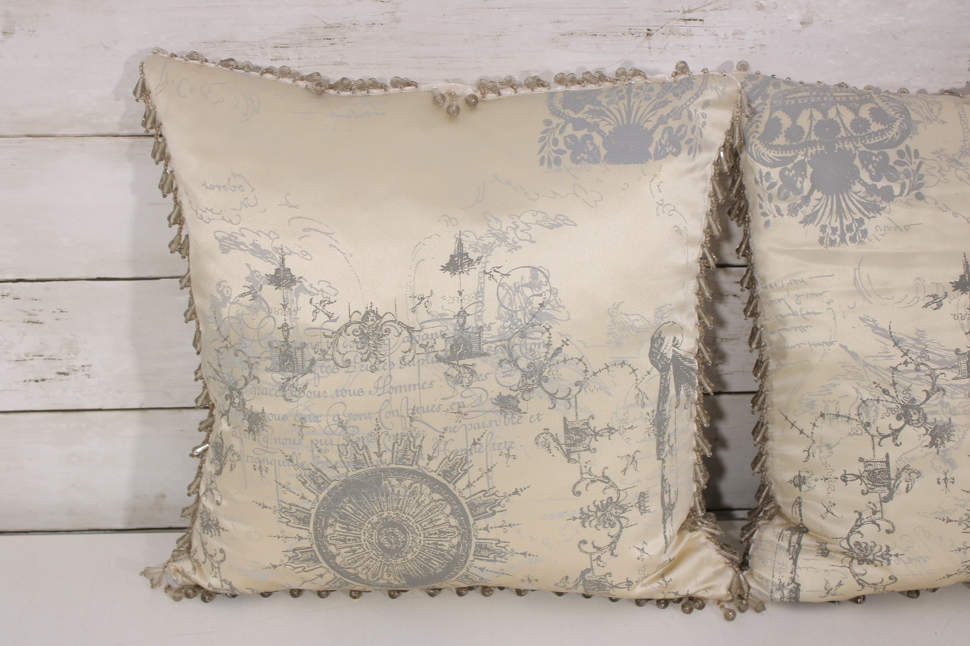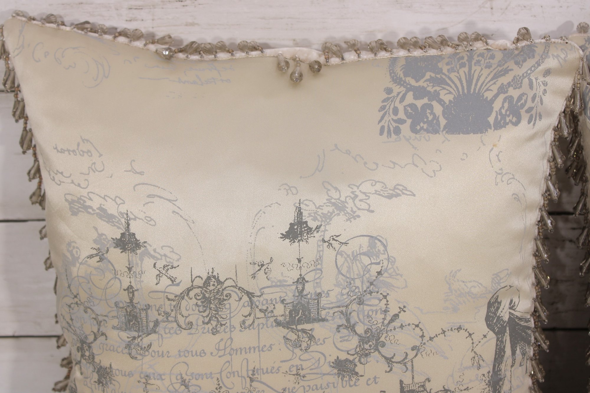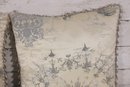 Lovely pair of decorative throw pillows featuring an elegant toile-style pattern in soft blue tones on a cream background. The detailed scenic design is complemented by fringe trim around the edges, giving the pillows a classic French country or traditional décor look.