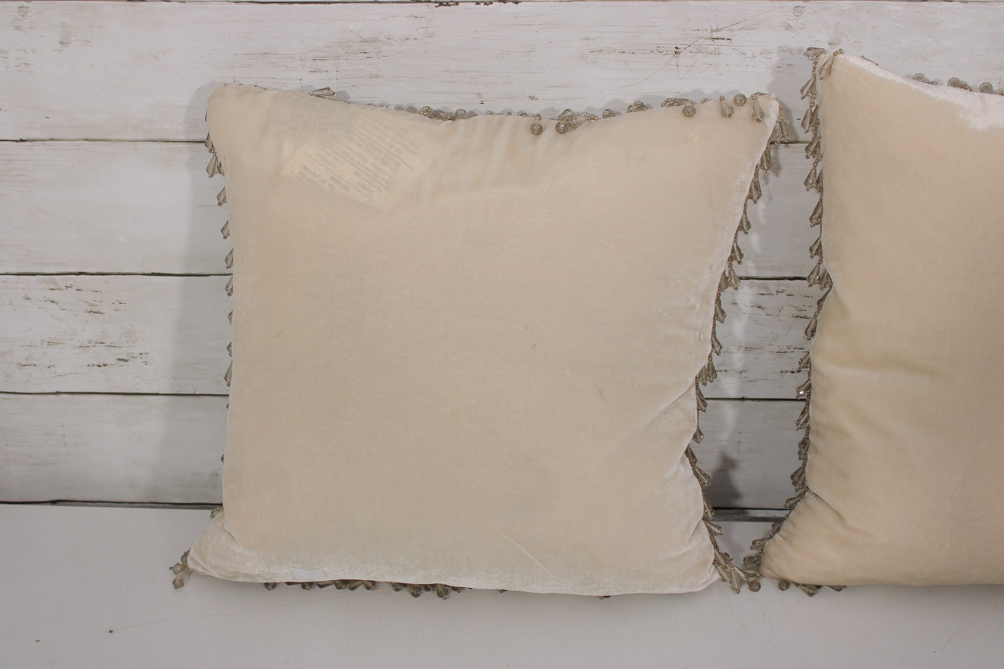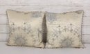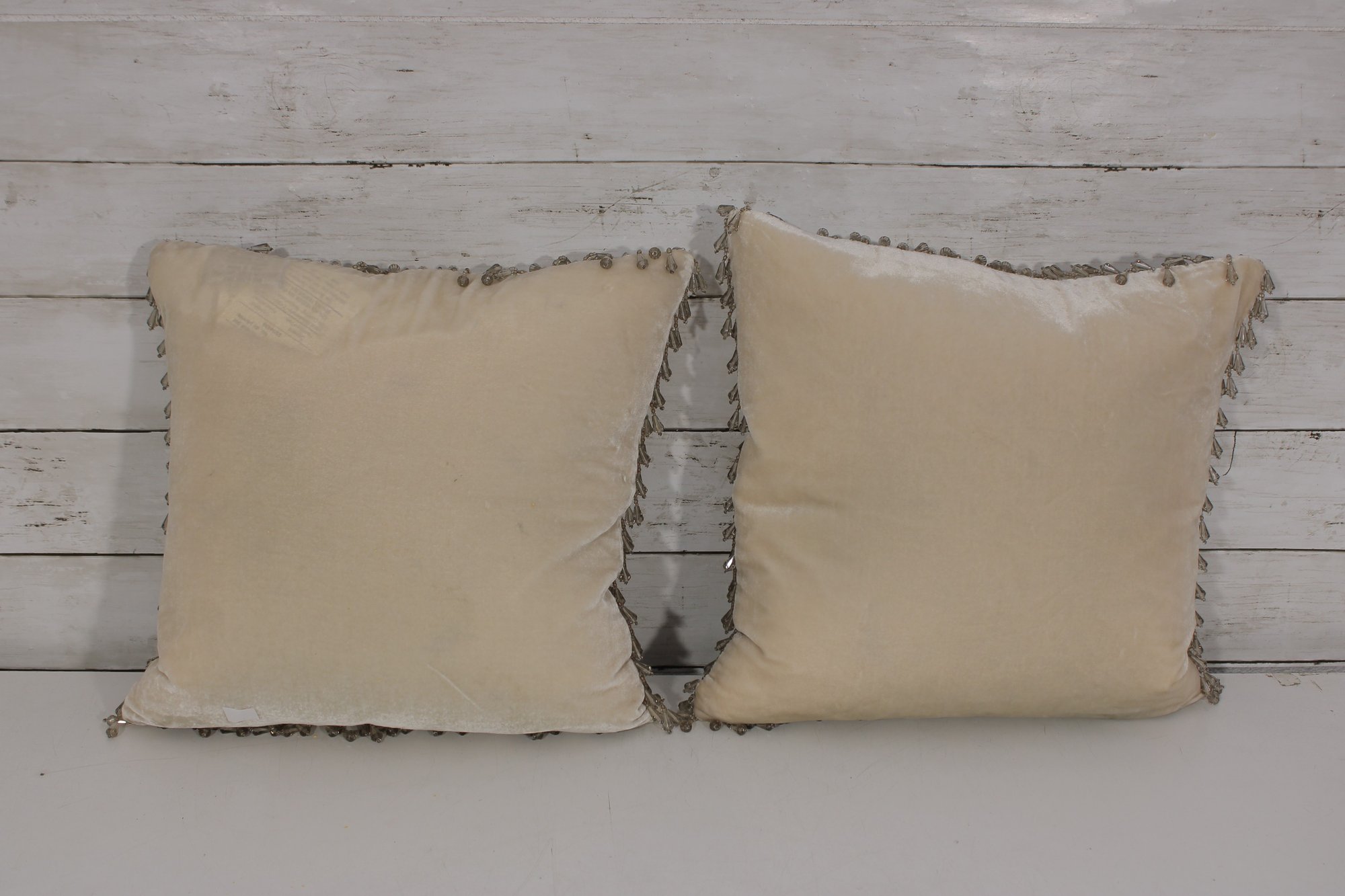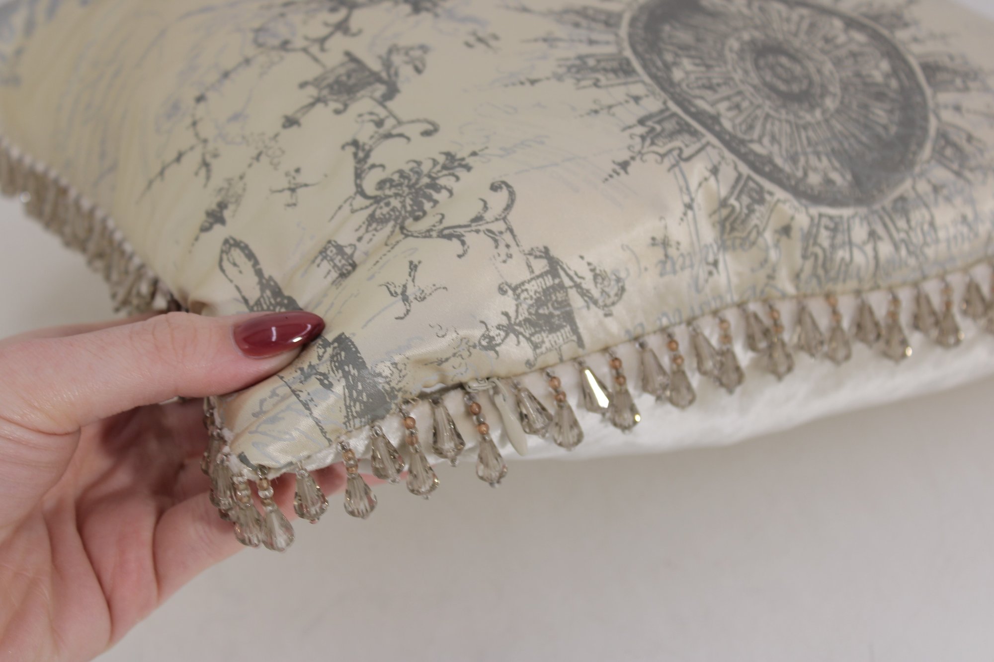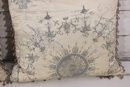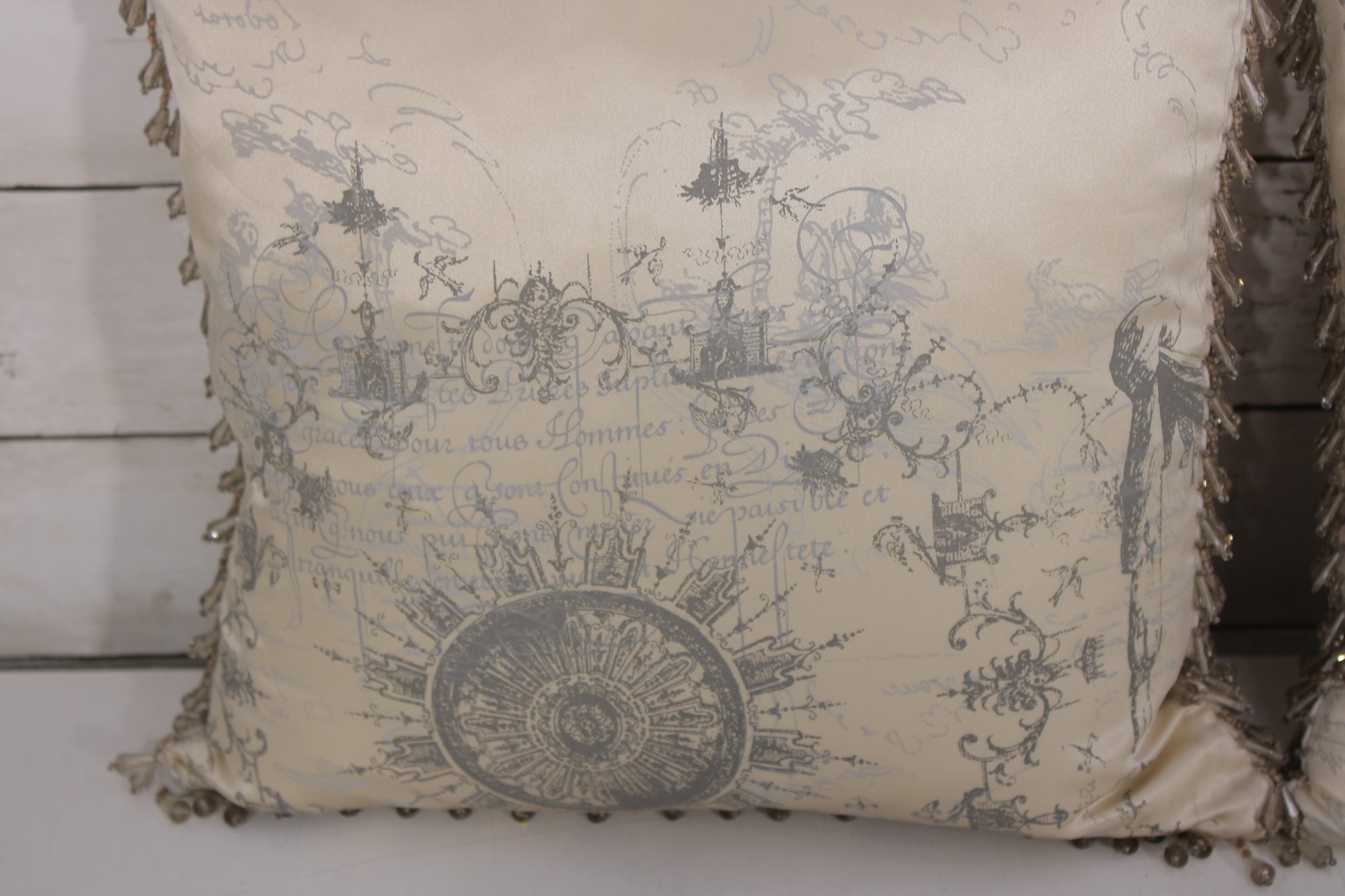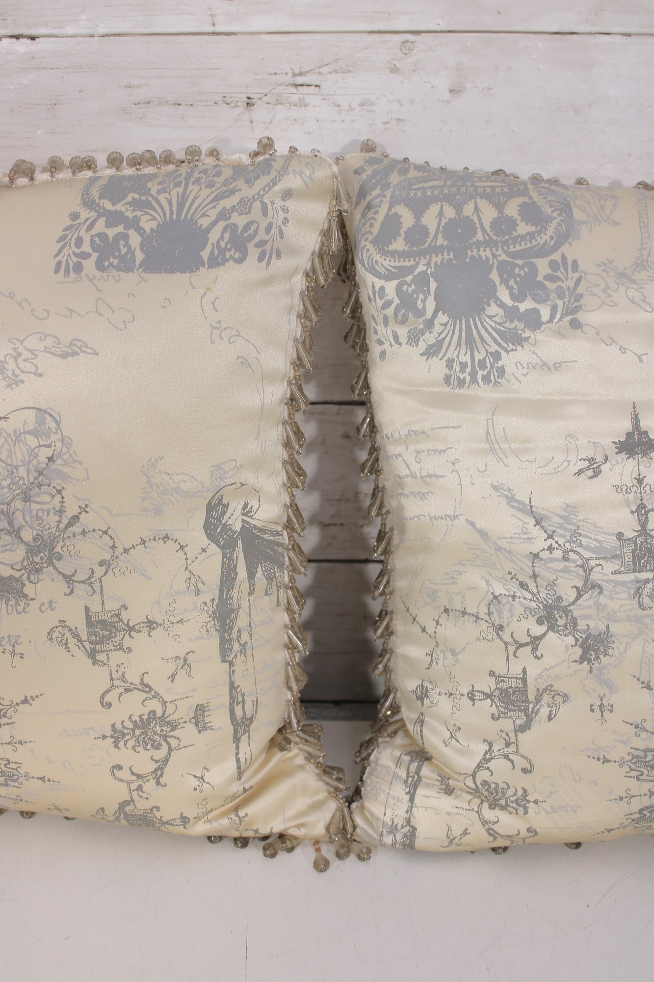 Lovely pair of decorative throw pillows featuring an elegant toile-style pattern in soft blue tones on a cream background. The detailed scenic design is complemented by fringe trim around the edges, giving the pillows a classic French country or traditional décor look.
