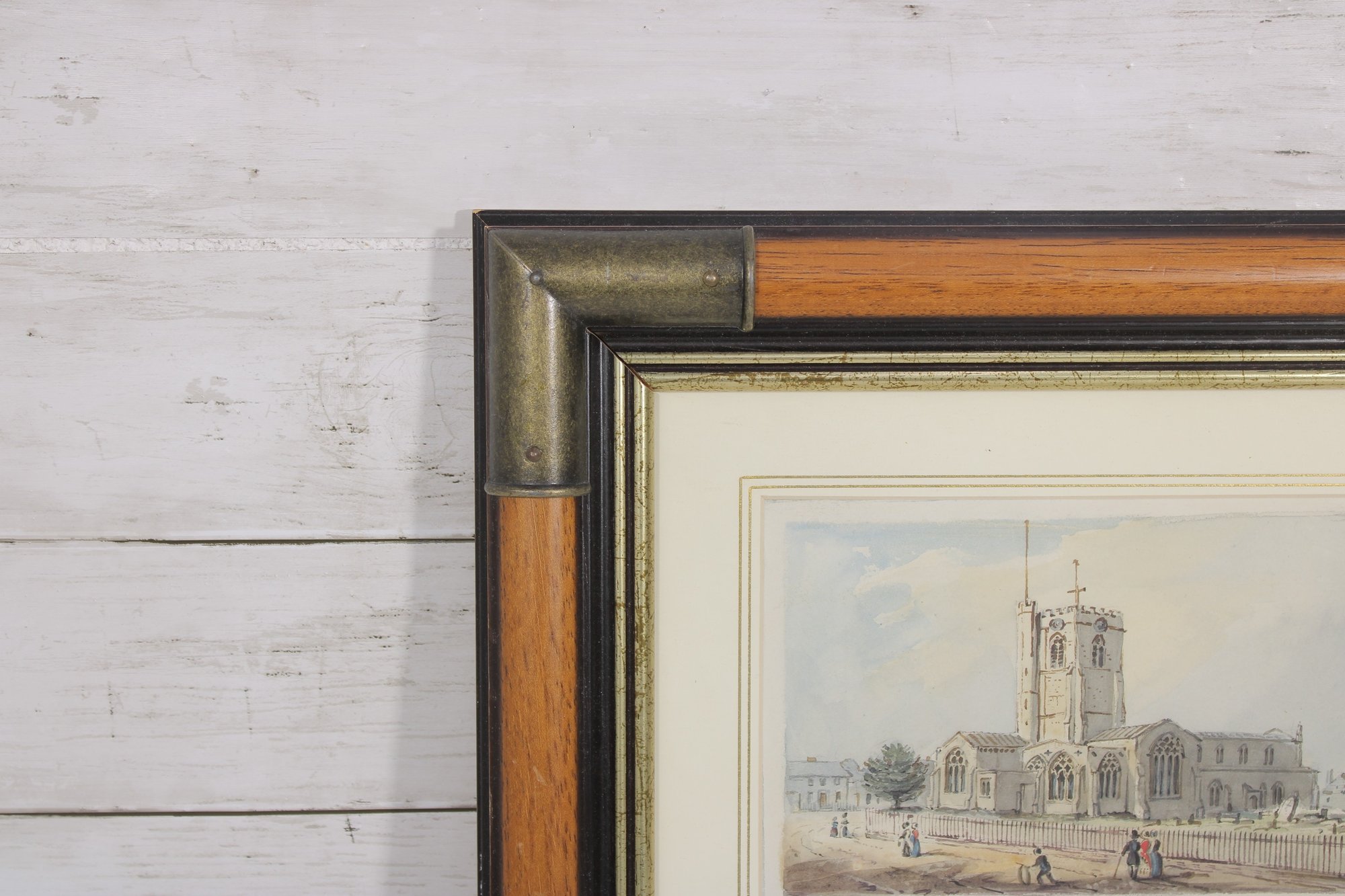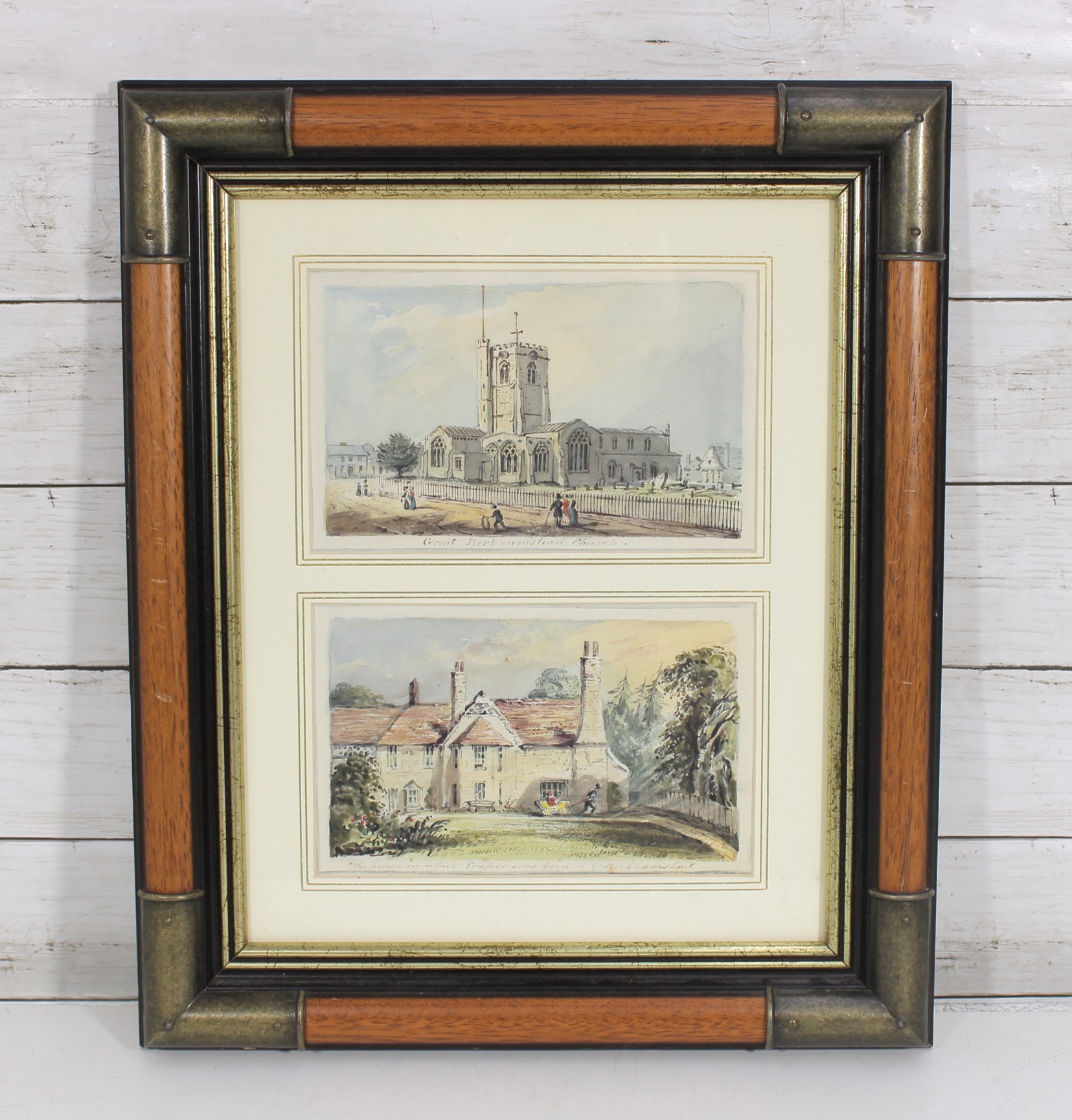 The two prints are mounted together in a double mat presentation and housed in a decorative frame with wood accents and metallic corners, creating an elegant display suitable for traditional interiors.