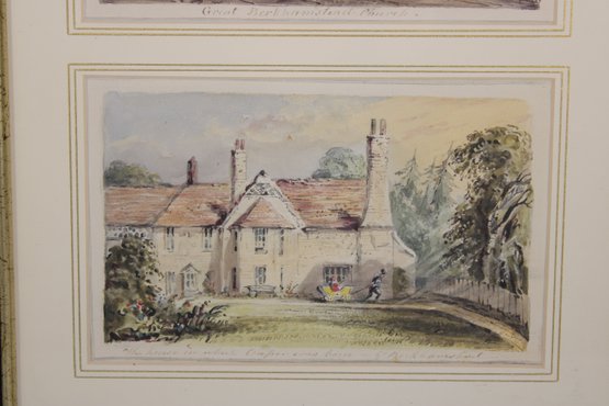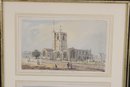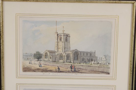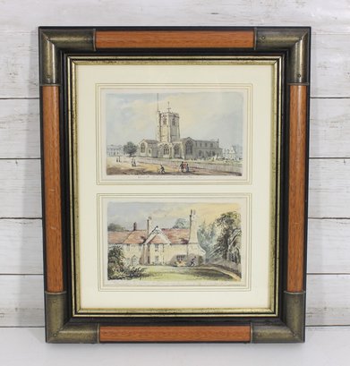 A nicely framed pair of Doyle’s English prints featuring charming architectural scenes of traditional English buildings. The prints depict a historic church with surrounding village figures and a classic English cottage with landscaped grounds, both rendered in soft watercolor-style tones.