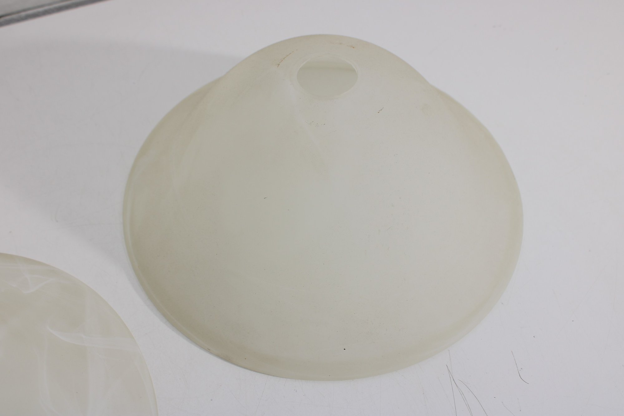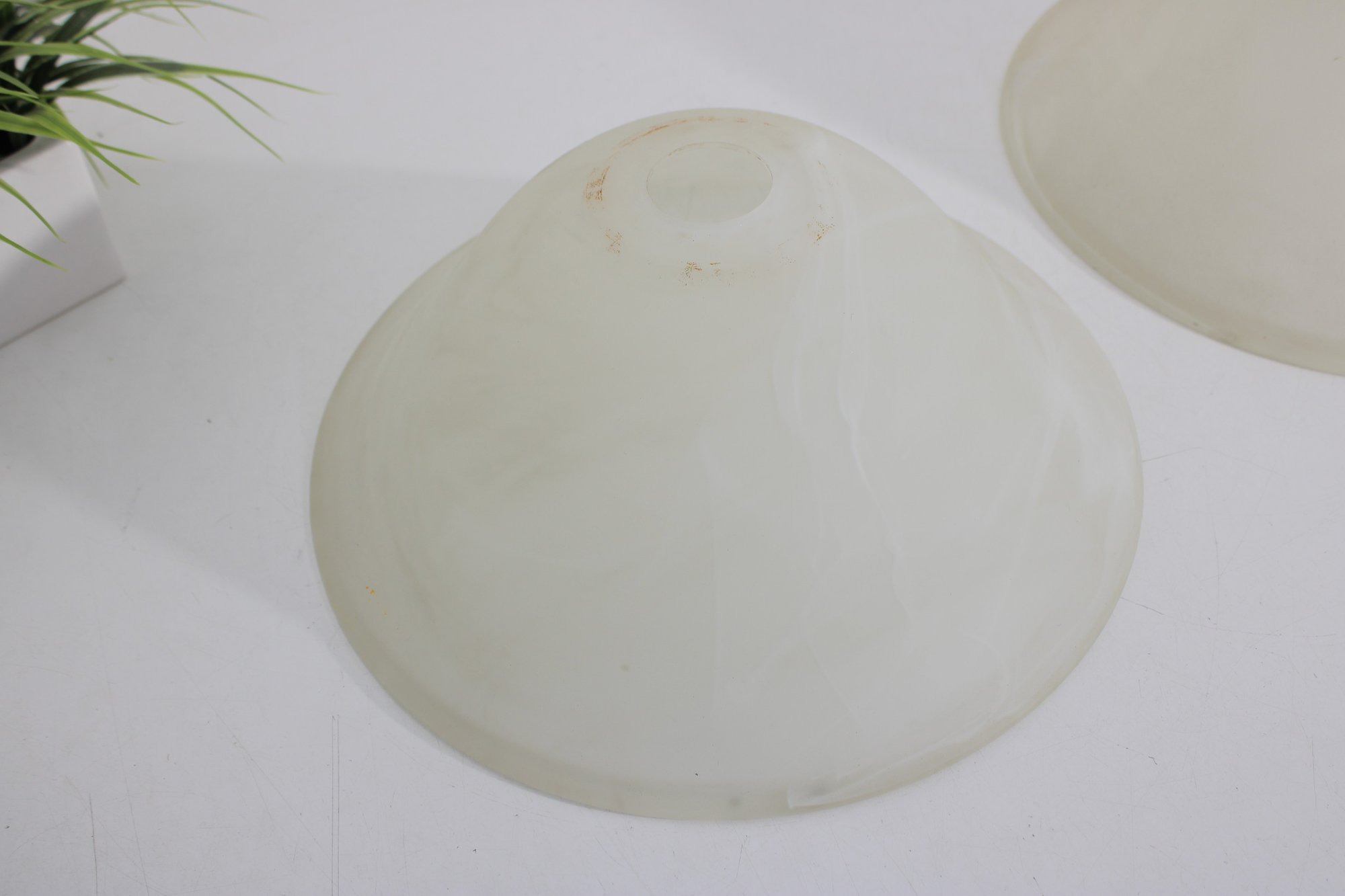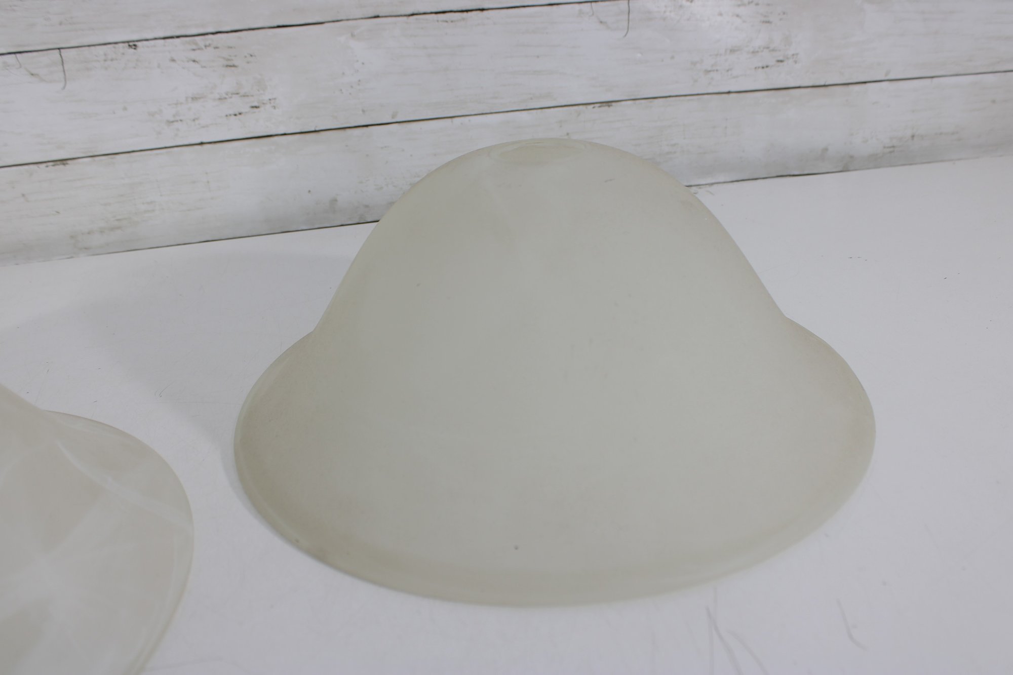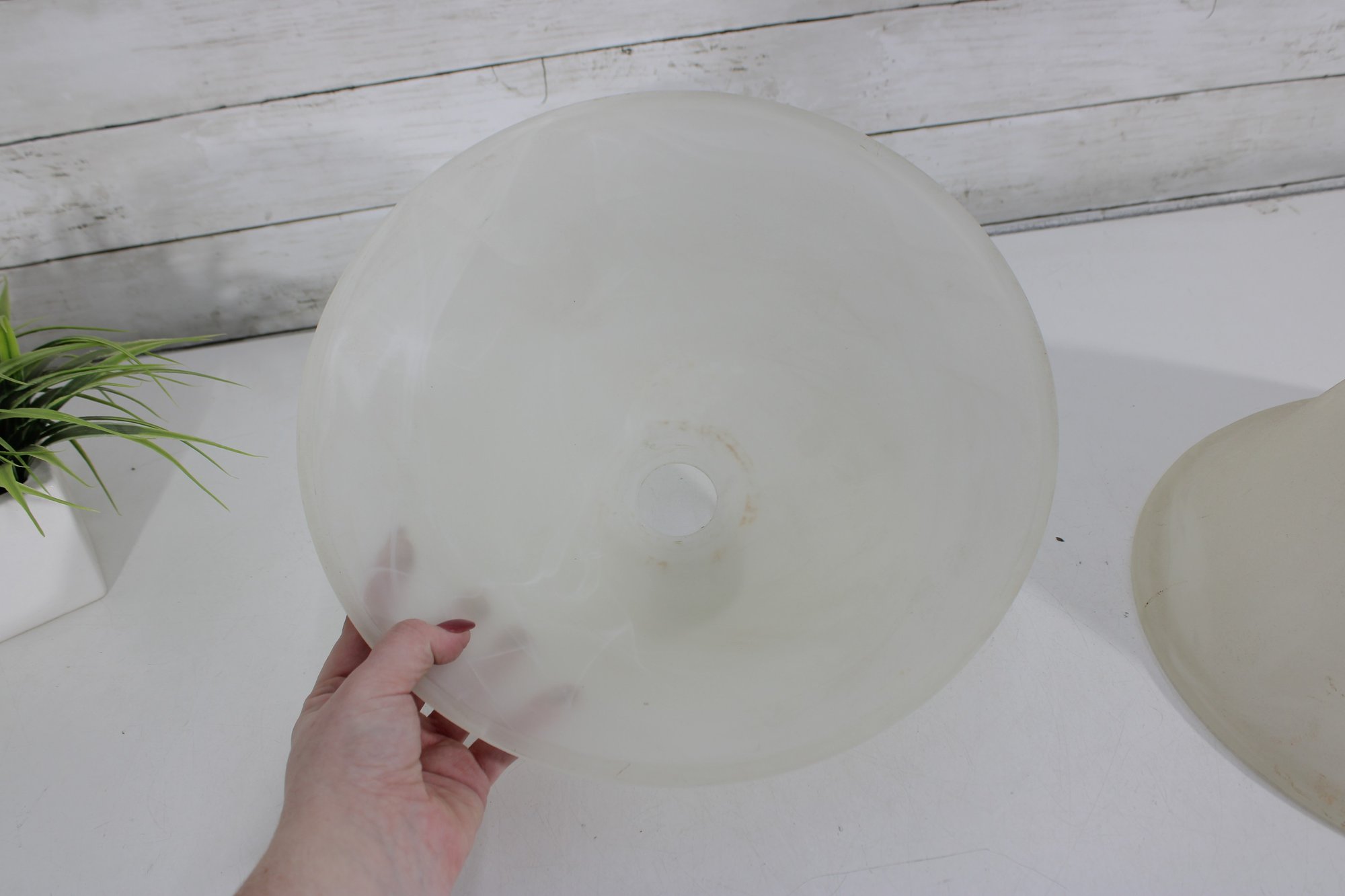 Set of two frosted glass dome lamp shades featuring a soft white finish with subtle swirl patterning that creates a warm, diffused glow when illuminated. These versatile replacement shades have a classic rounded profile that complements both vintage and contemporary lighting fixtures.