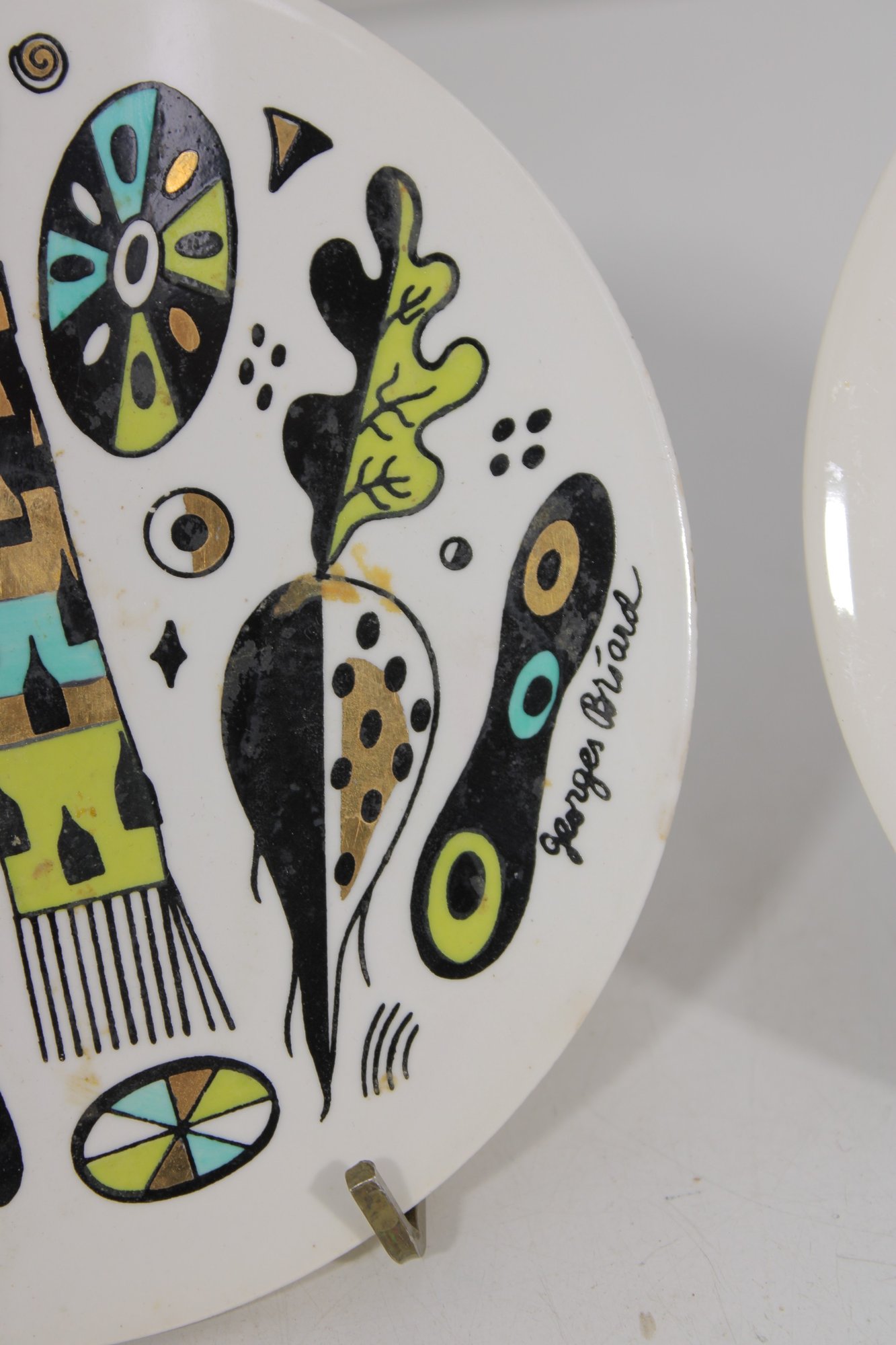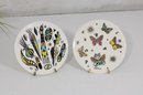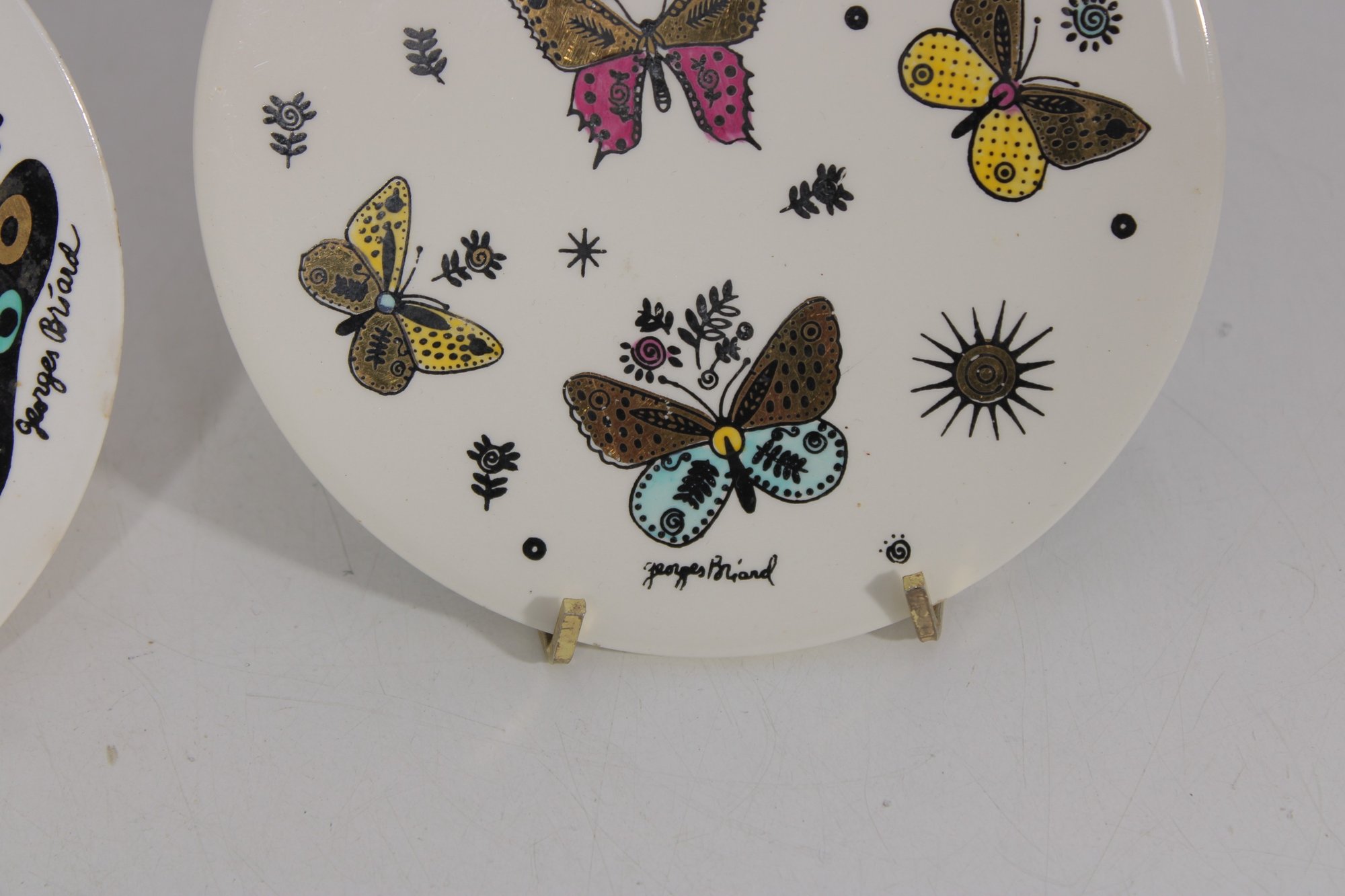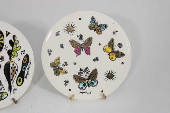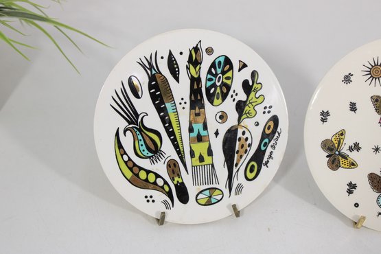 Fantastic pair of Mid-Century Modern Georges Briard ceramic trivets, featuring two iconic and vibrant designs. One showcases a bold abstract fruit/vegetable motif, while the other displays a lively butterfly pattern accented with starburst elements—both hallmarks of Briard’s signature style.