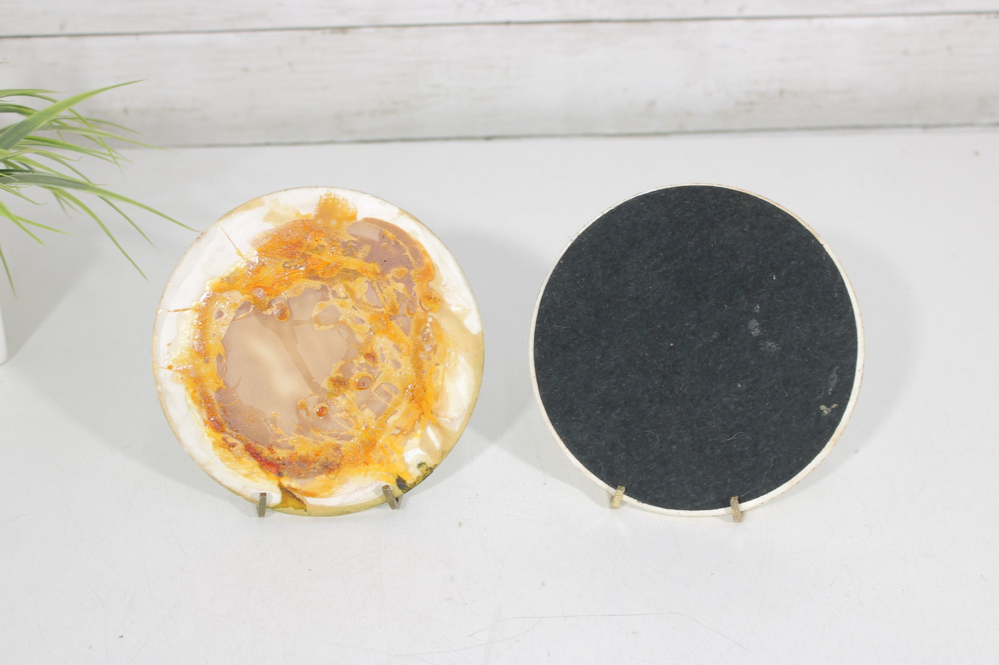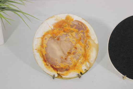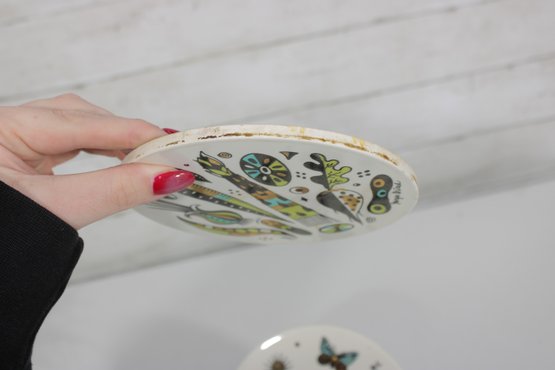 These colorful pieces are set on ceramic bases with heat-resistant backing, making them perfect as trivets, hot plates, or decorative wall accents. The designs are bright, playful, and unmistakably MCM.
