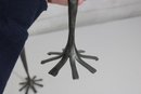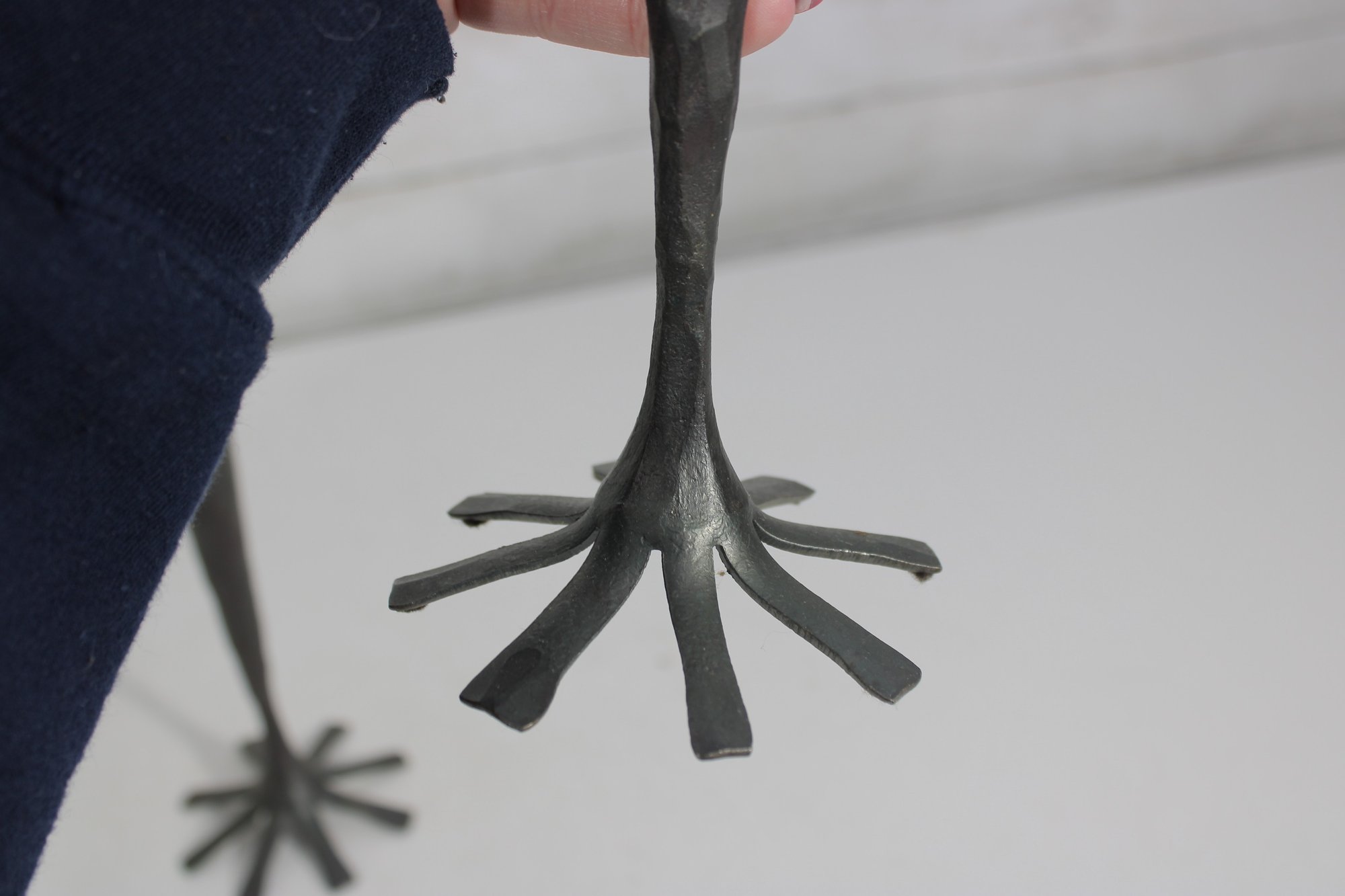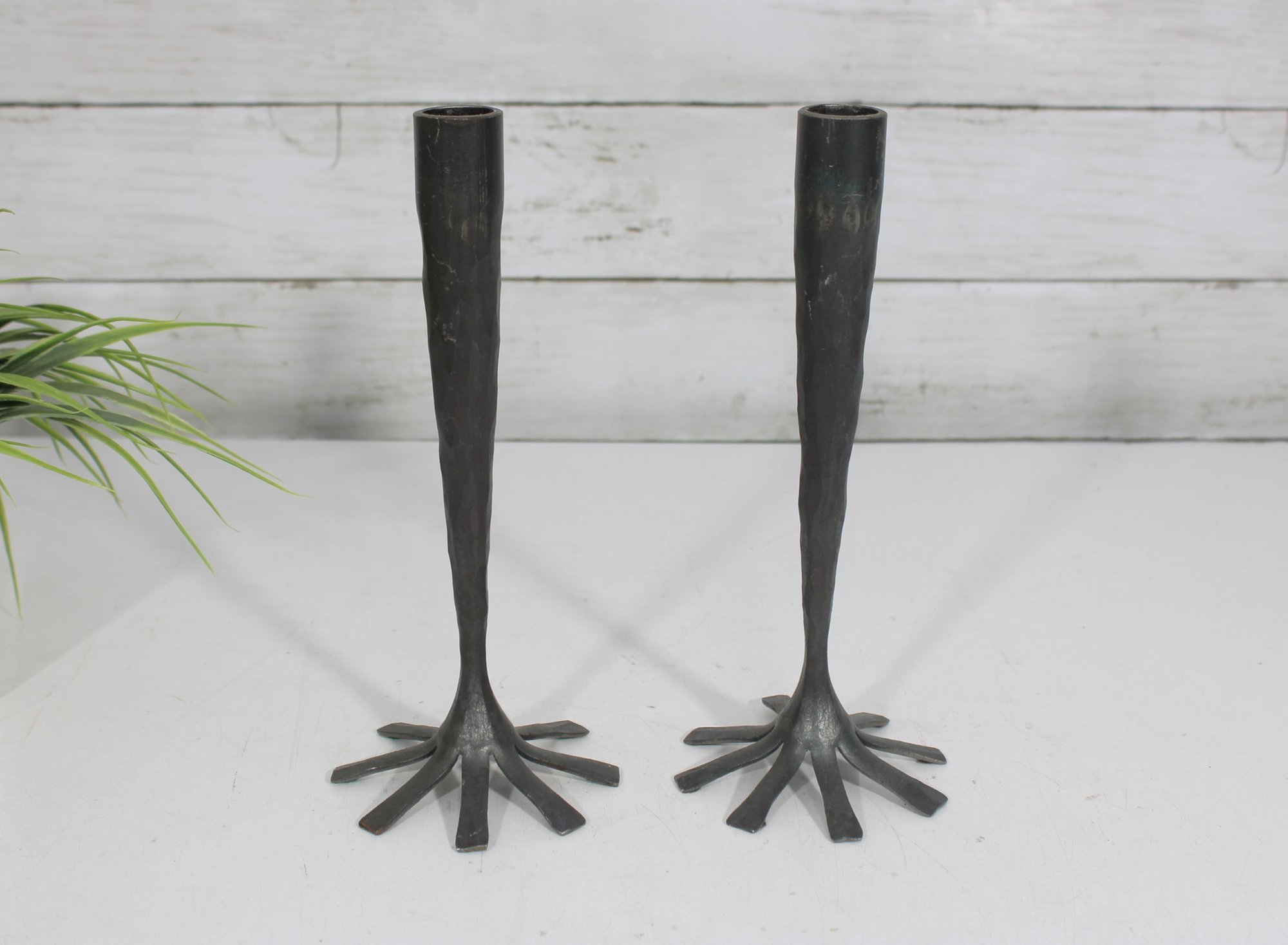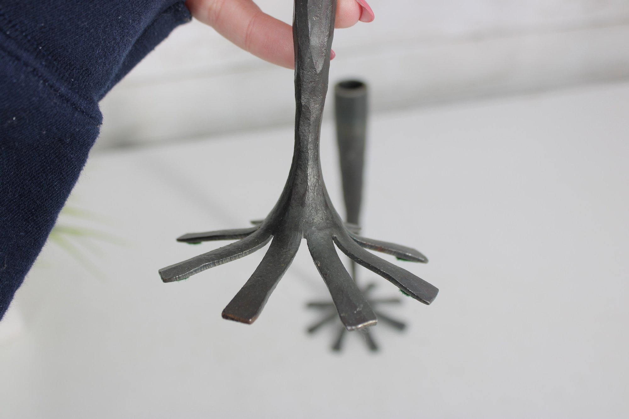 Striking pair of hammered black iron candlesticks featuring a unique organic, branch-like base design. These sculptural holders have a tapered stem and a radial “root” style base, giving them a bold Brutalist or mid-century modern aesthetic.