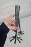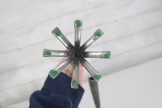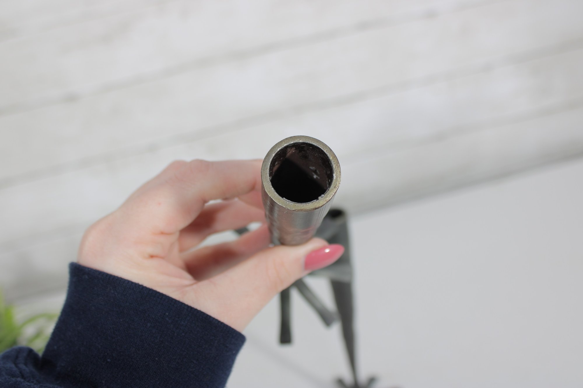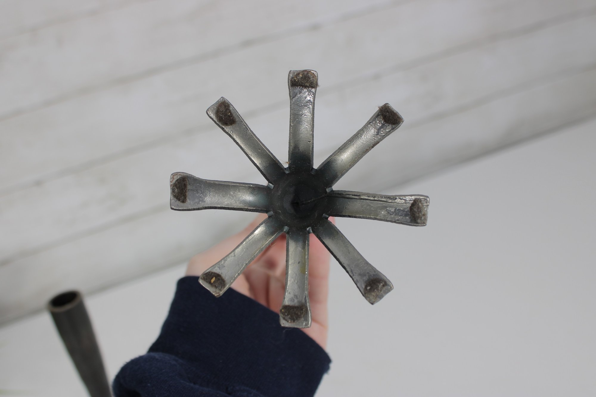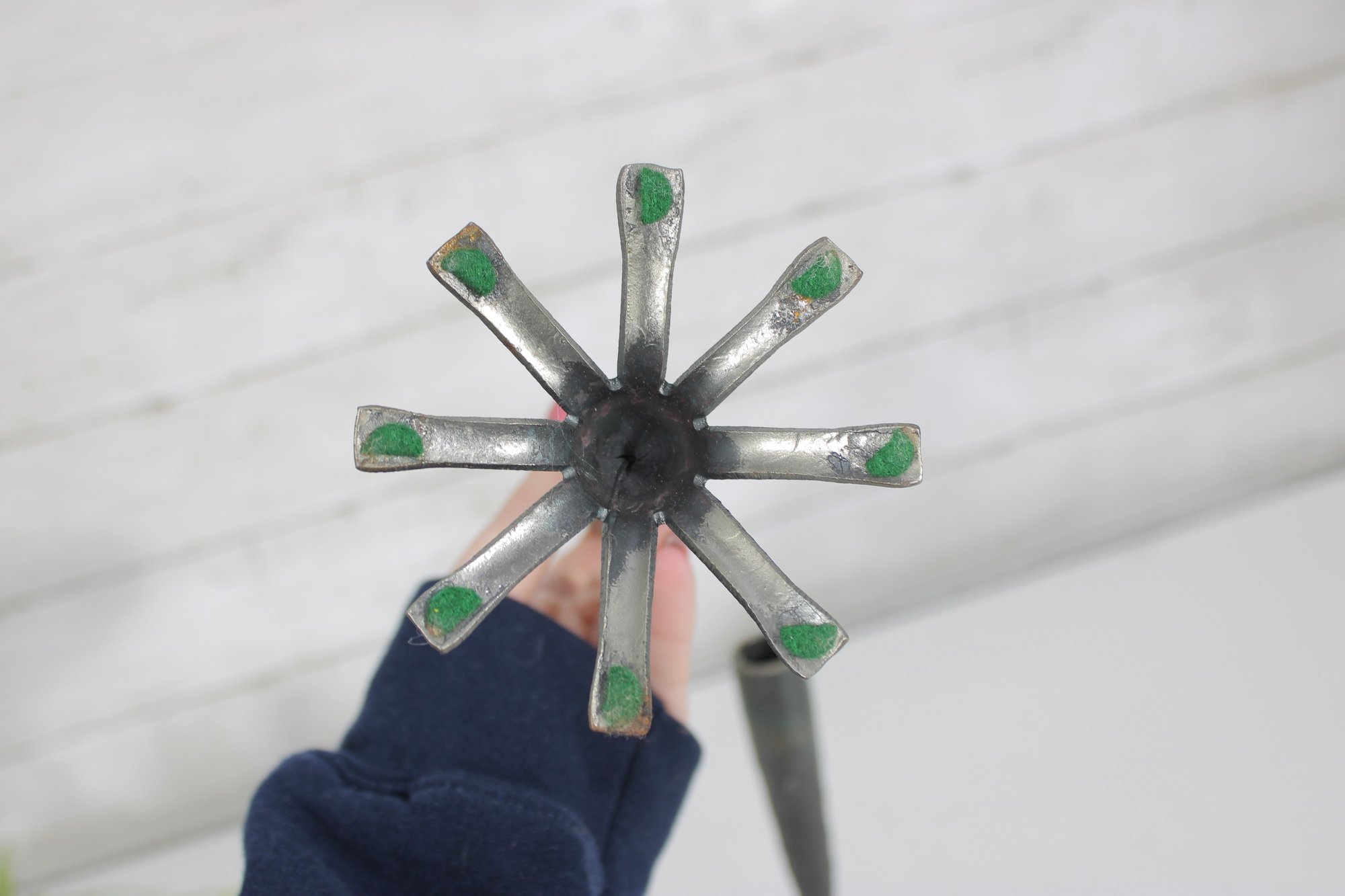Striking pair of hammered black iron candlesticks featuring a unique organic, branch-like base design. These sculptural holders have a tapered stem and a radial “root” style base, giving them a bold Brutalist or mid-century modern aesthetic.