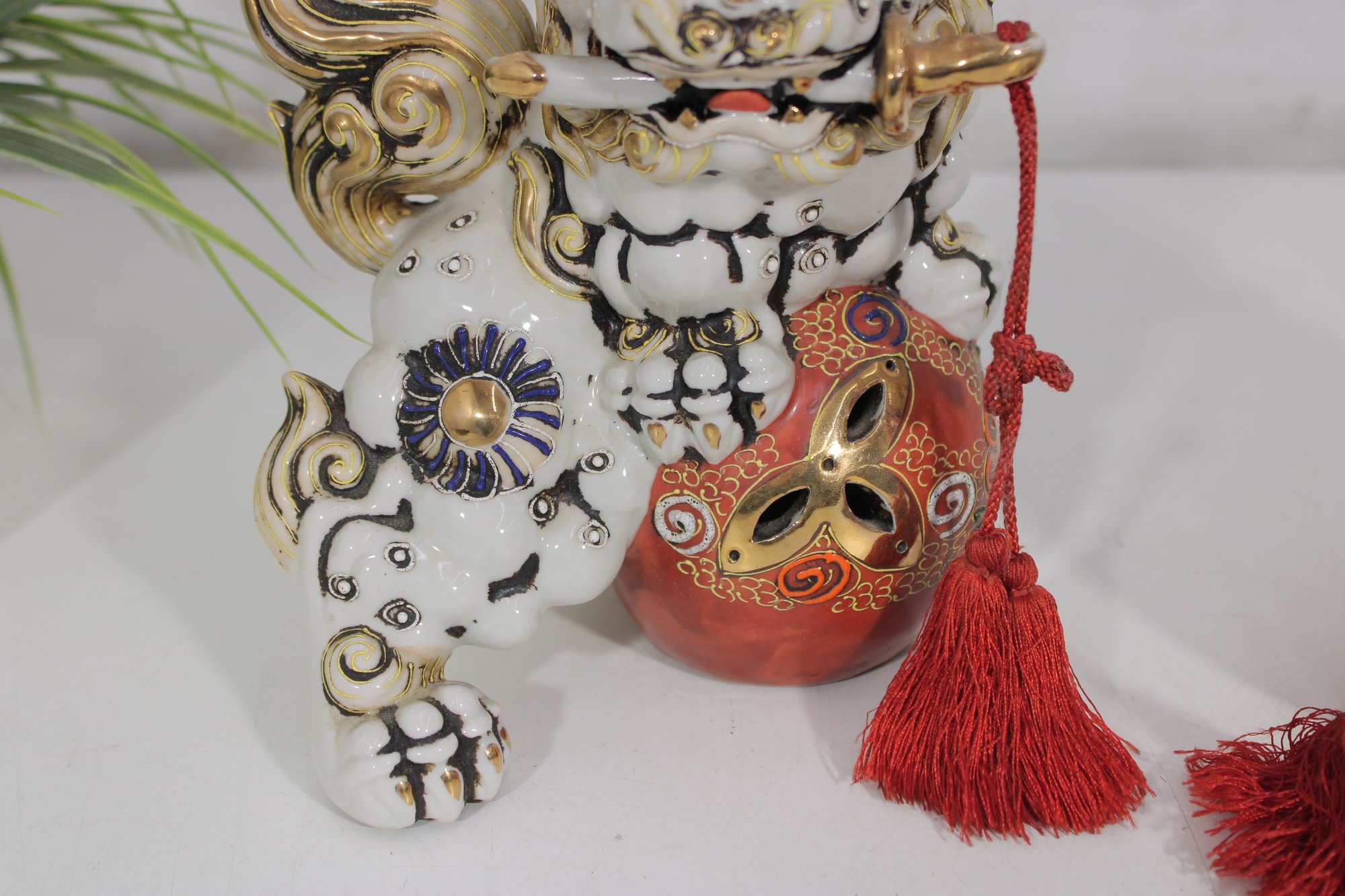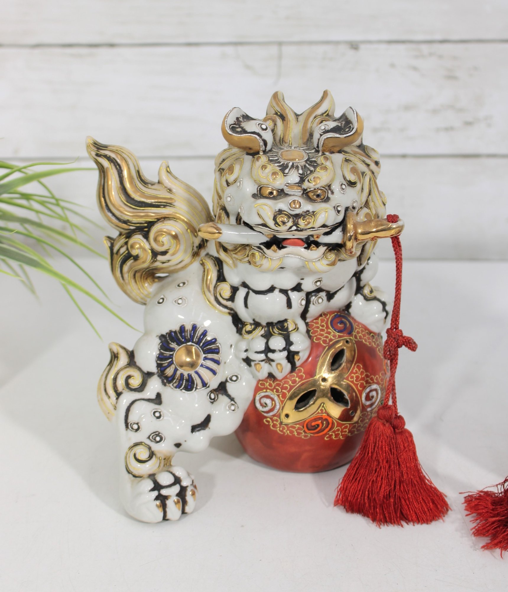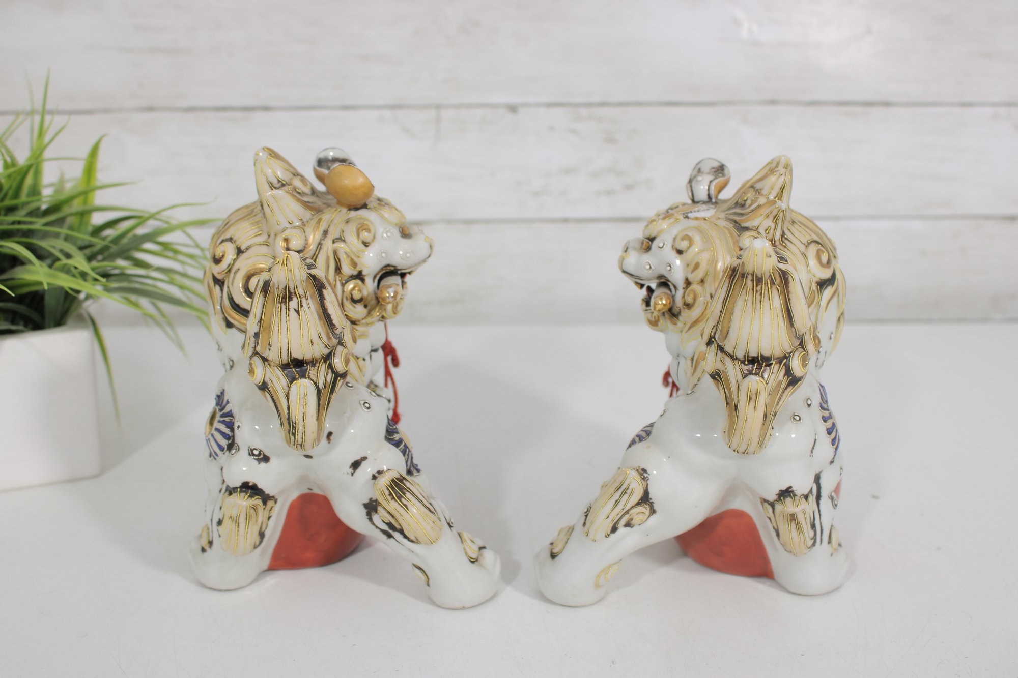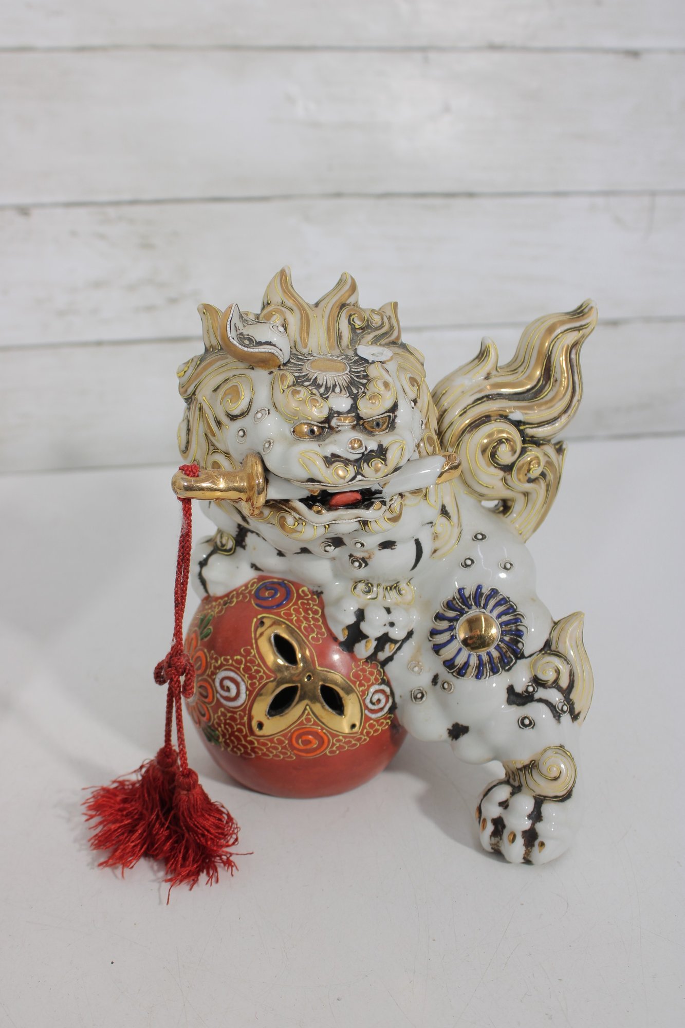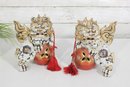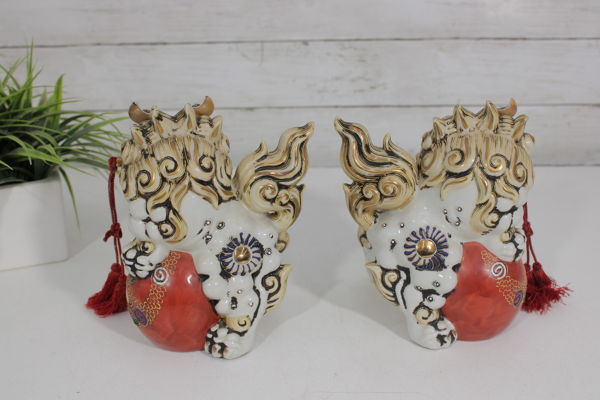 Each lion features detailed expressions, ornate scrollwork, and decorative elements including tassels and patterned accents, showcasing classic Kutani craftsmanship.