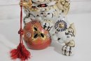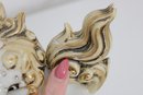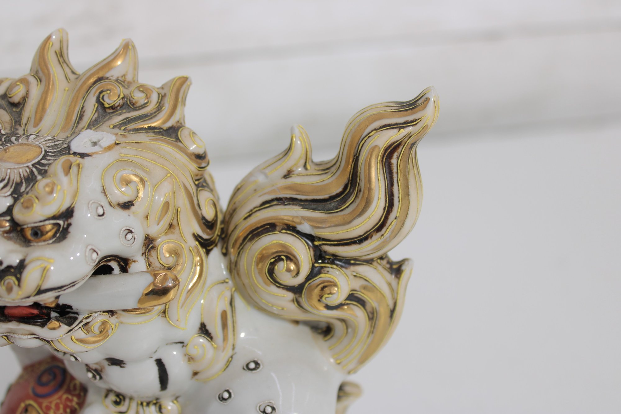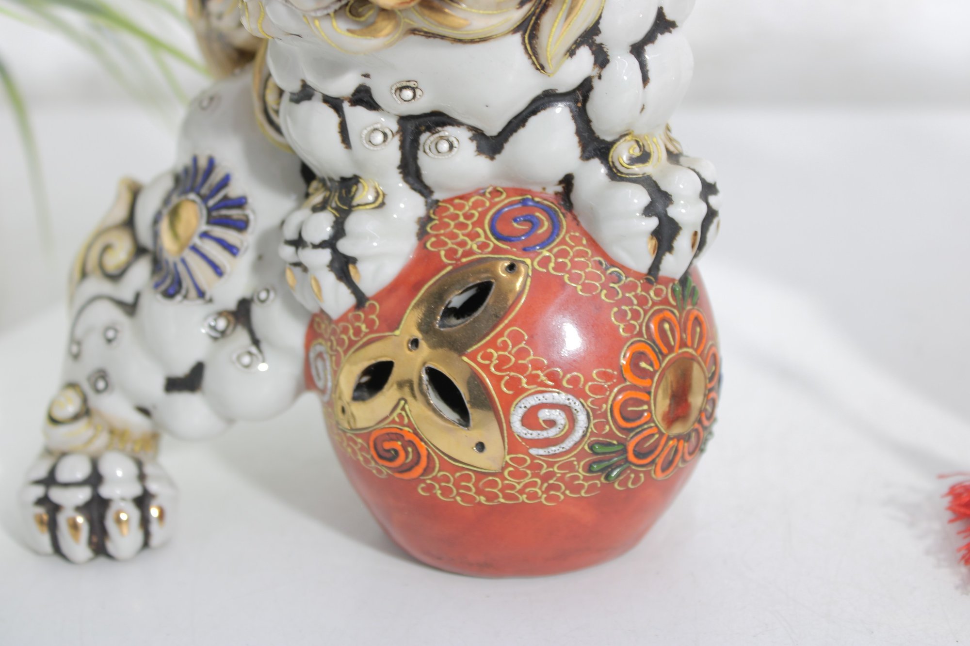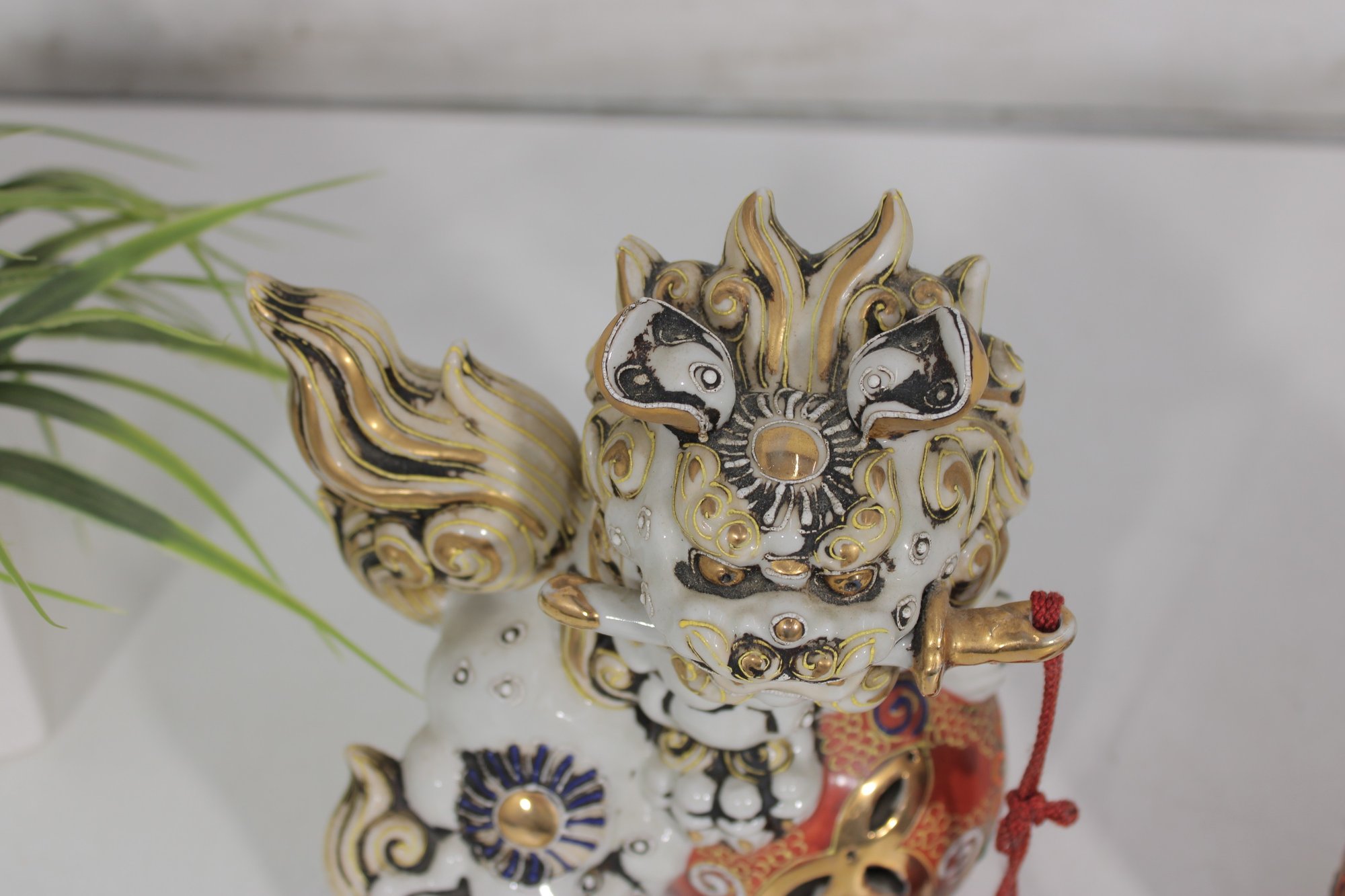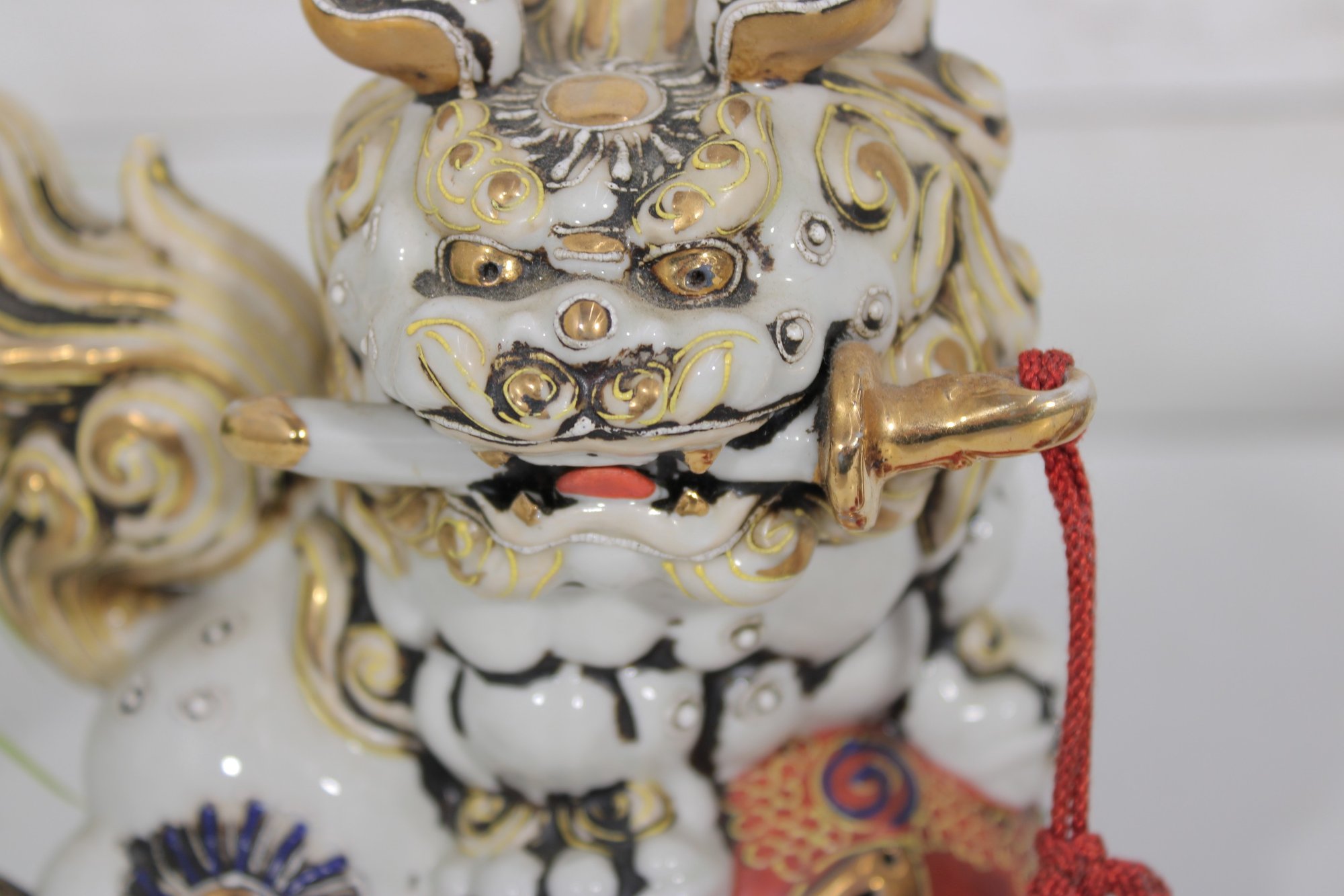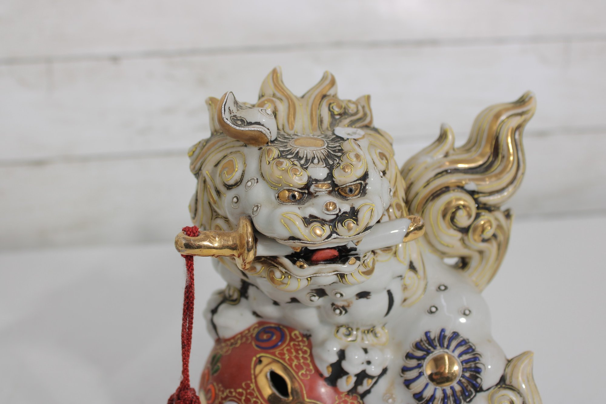 Each lion features detailed expressions, ornate scrollwork, and decorative elements including tassels and patterned accents, showcasing classic Kutani craftsmanship.