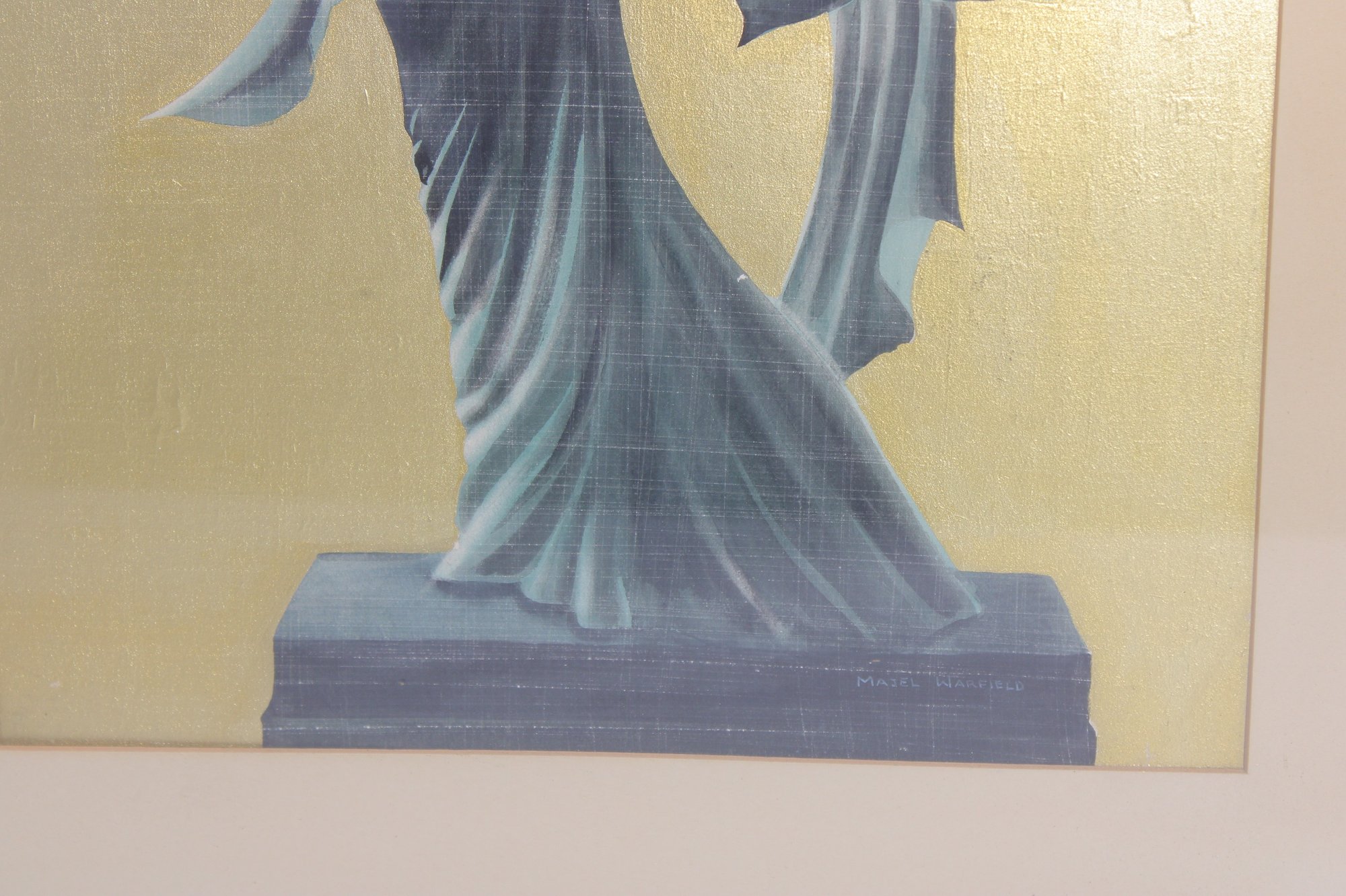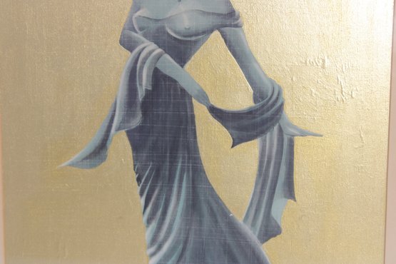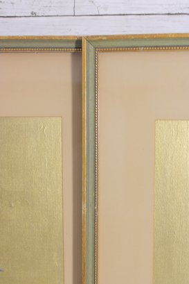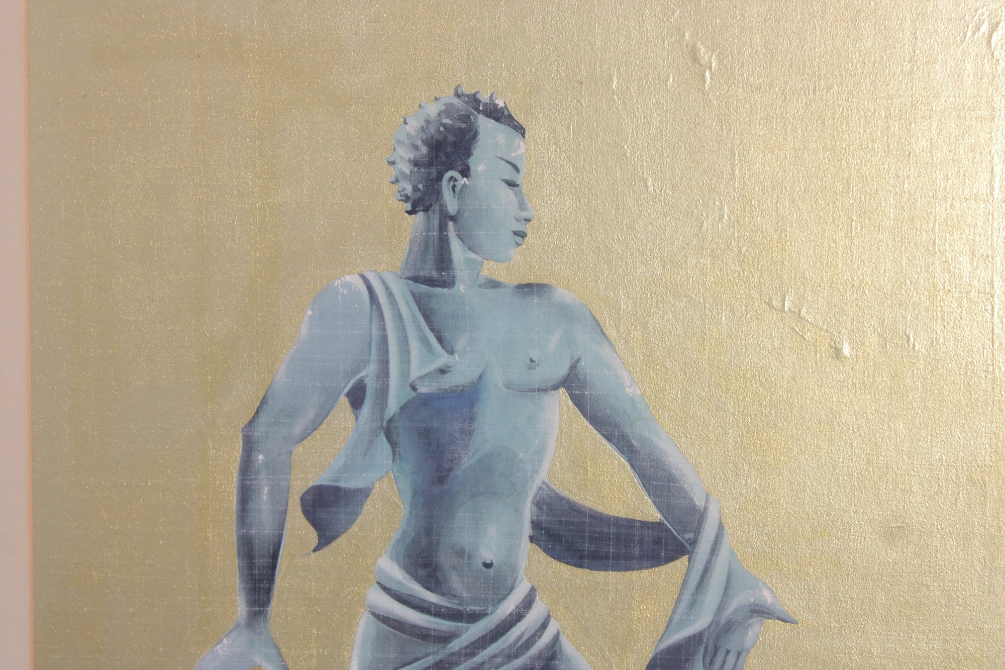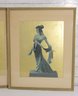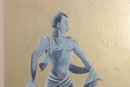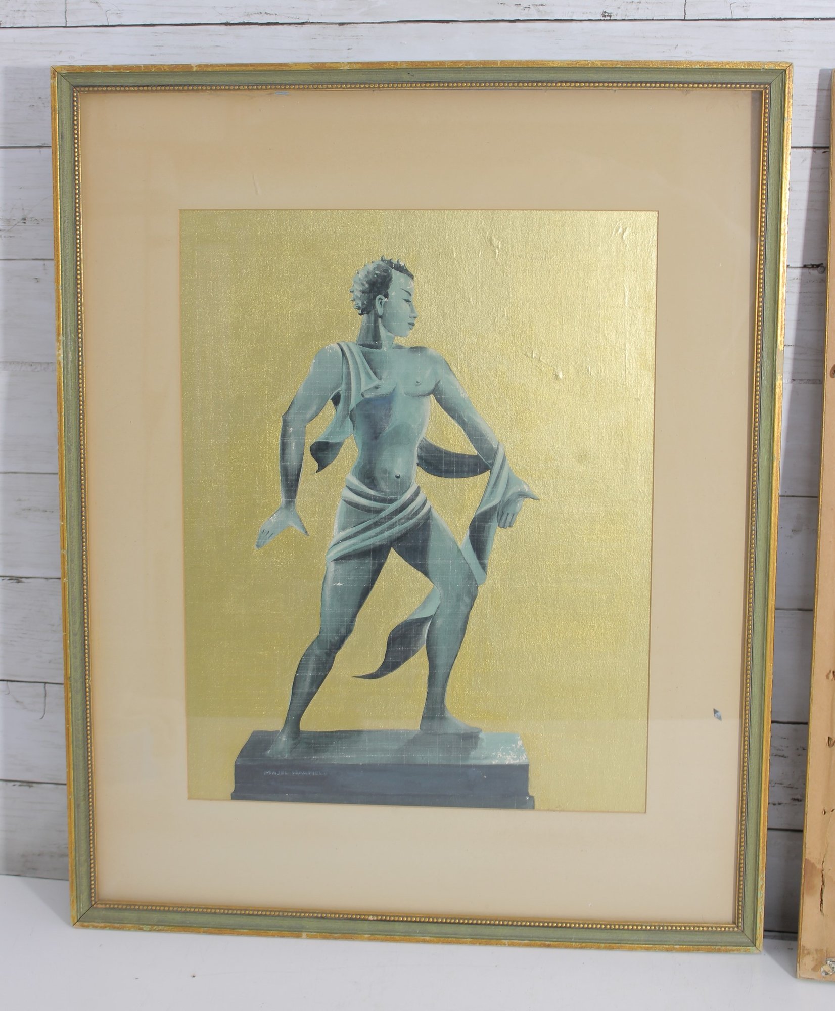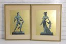 a striking pair of framed prints by Majel Warfield, featuring elegant classical-style figures set against luminous gold foil backgrounds. One piece depicts a male figure in a dynamic pose, while the other features a graceful draped female figureātogether creating a balanced and sophisticated set.