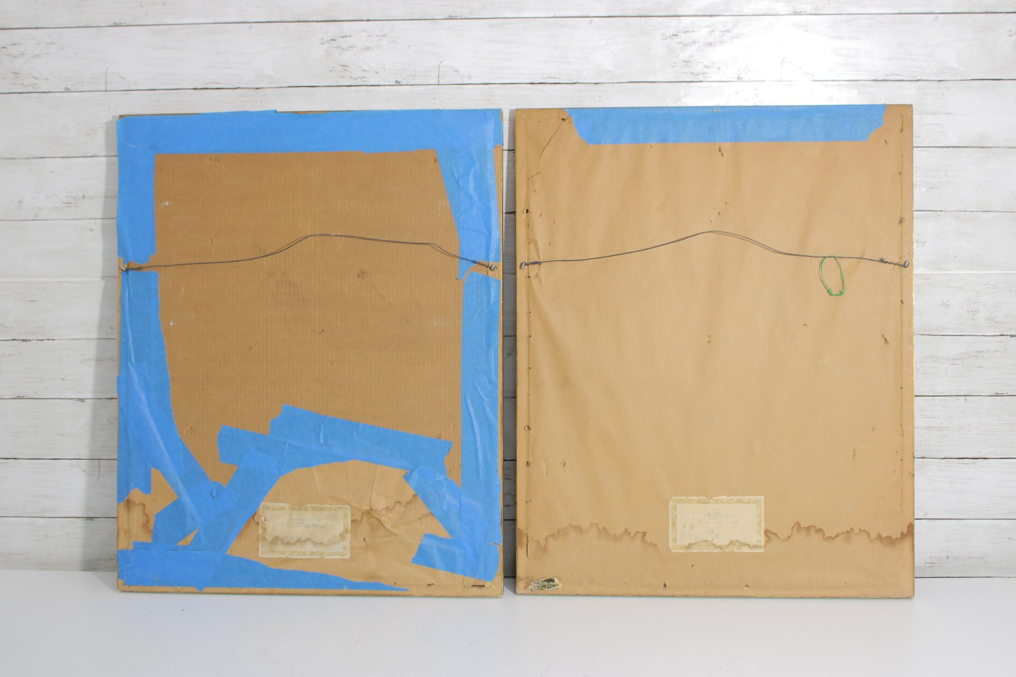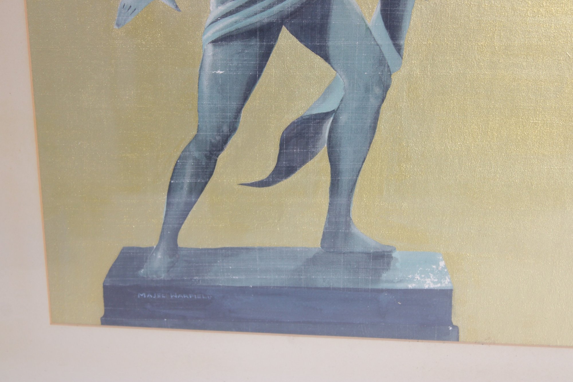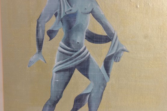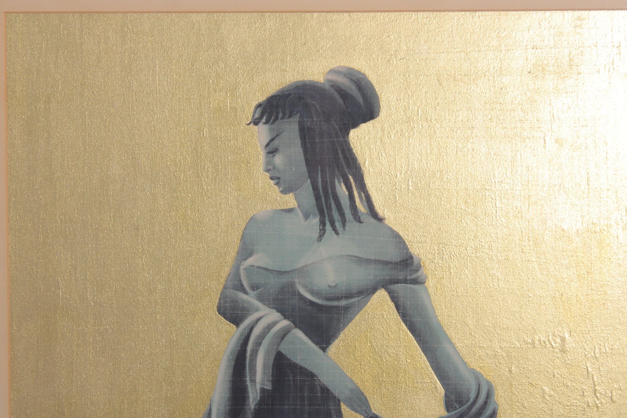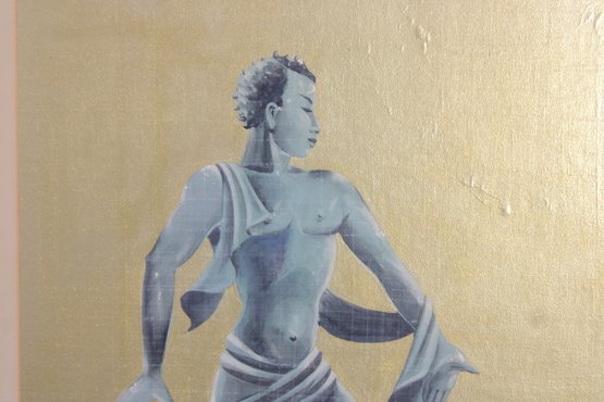 a striking pair of framed prints by Majel Warfield, featuring elegant classical-style figures set against luminous gold foil backgrounds. One piece depicts a male figure in a dynamic pose, while the other features a graceful draped female figureātogether creating a balanced and sophisticated set.