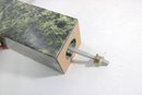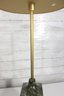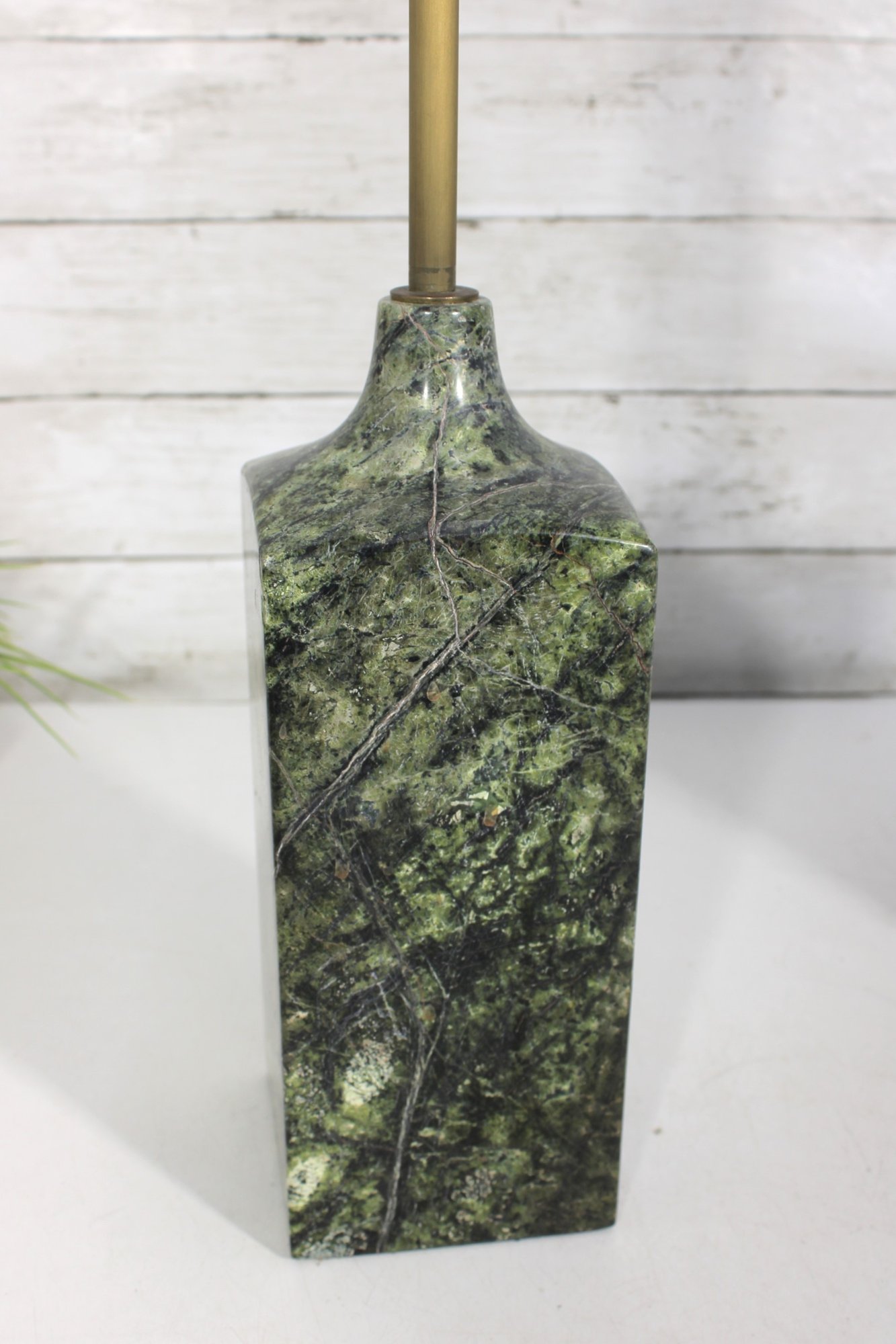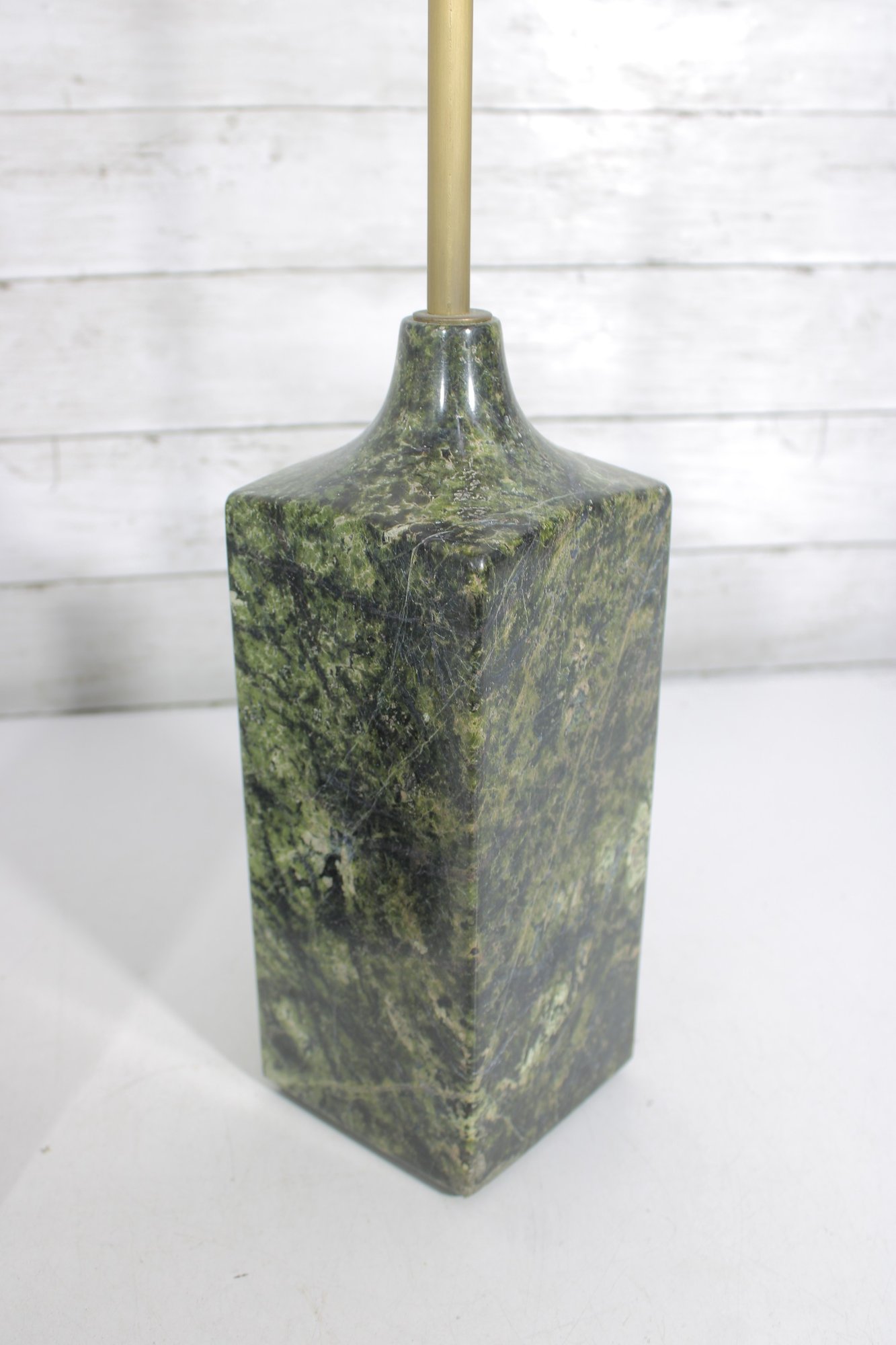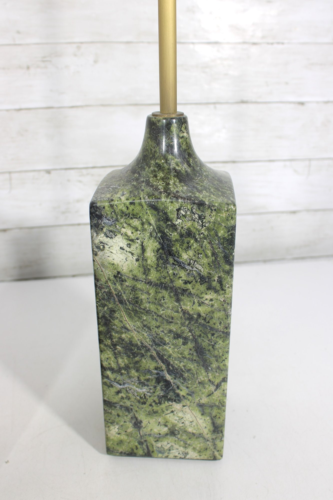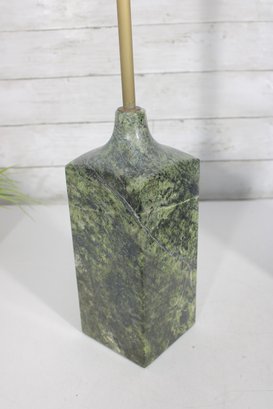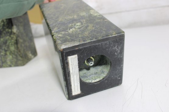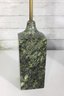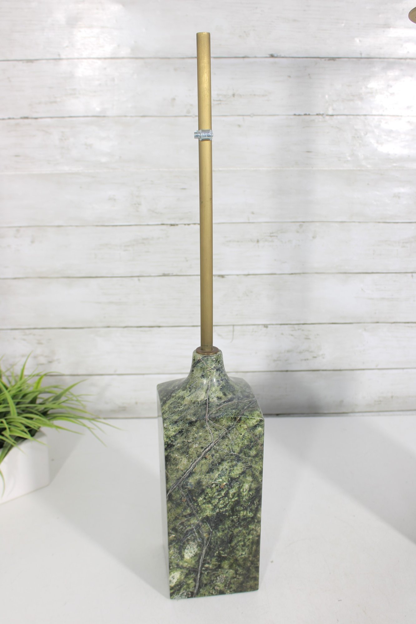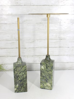The bases are crafted from solid green stone with natural marbling, giving each piece a unique look. The brass stems are adjustable in height, allowing flexibility in use.