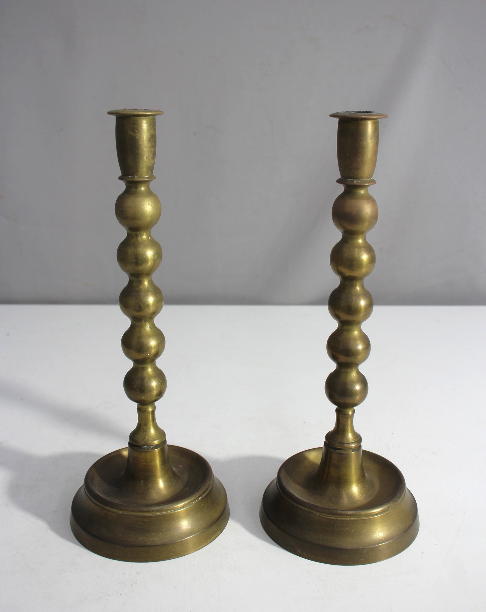 pair of vintage brass candlesticks stands at an impressive 12 inches tall, featuring a classic column design with stacked spherical accents. The sturdy bases are lined with green felt to protect surfaces, making them as practical as they are stylish. Their timeless appeal makes them perfect for traditional or modern décor.