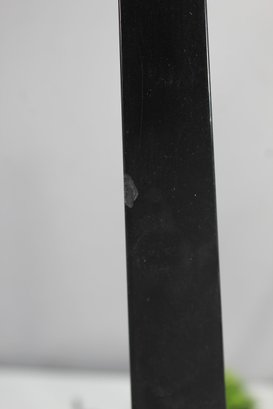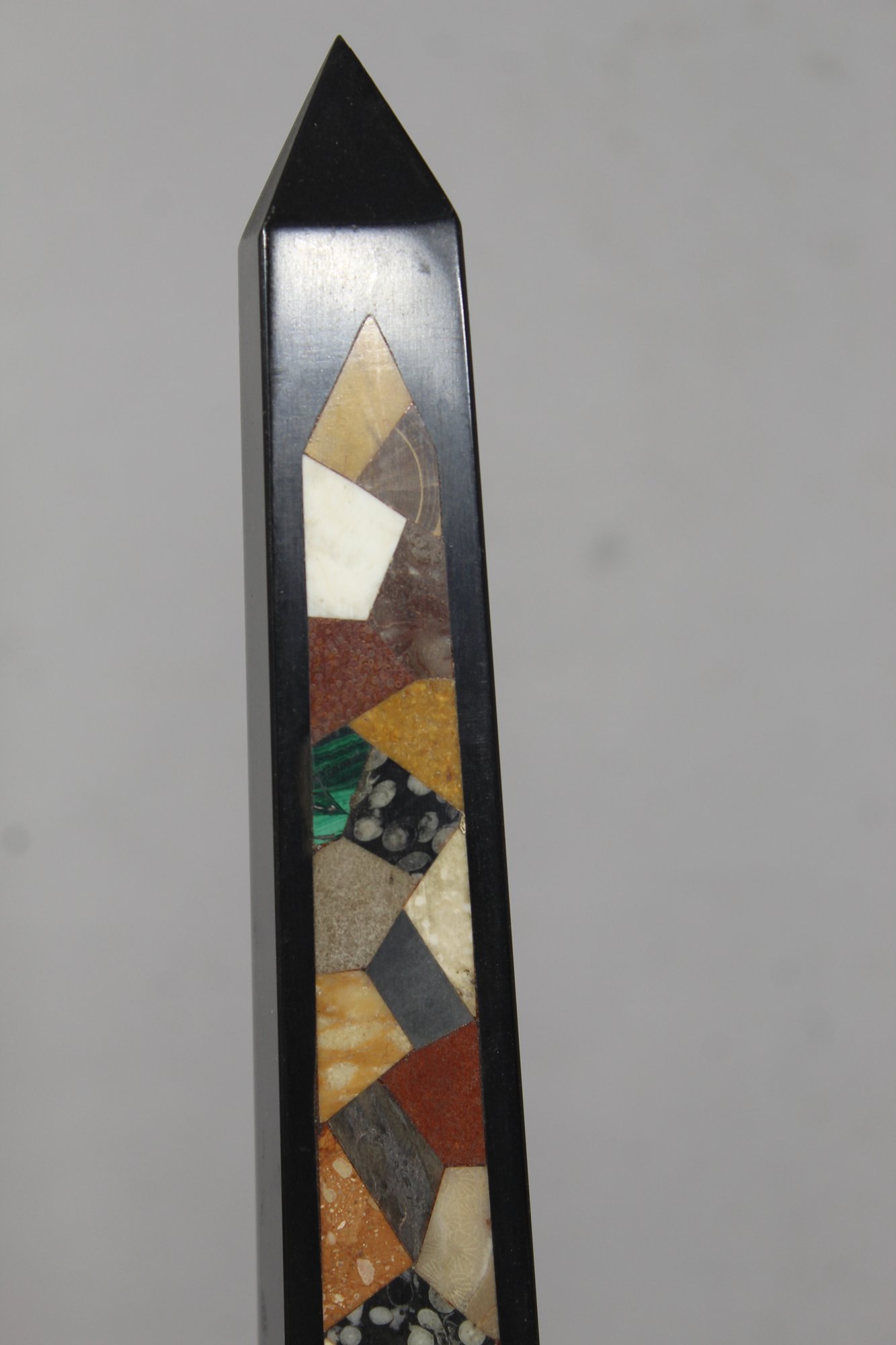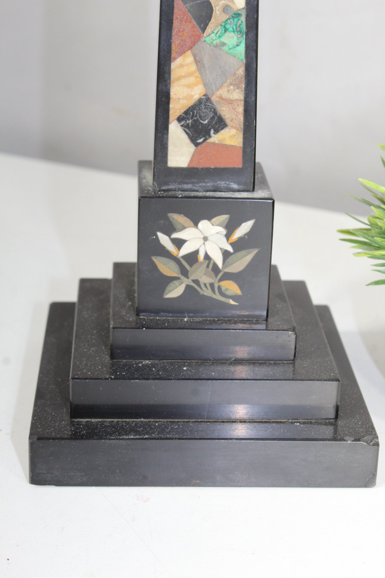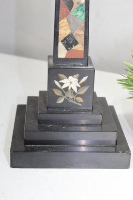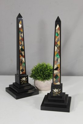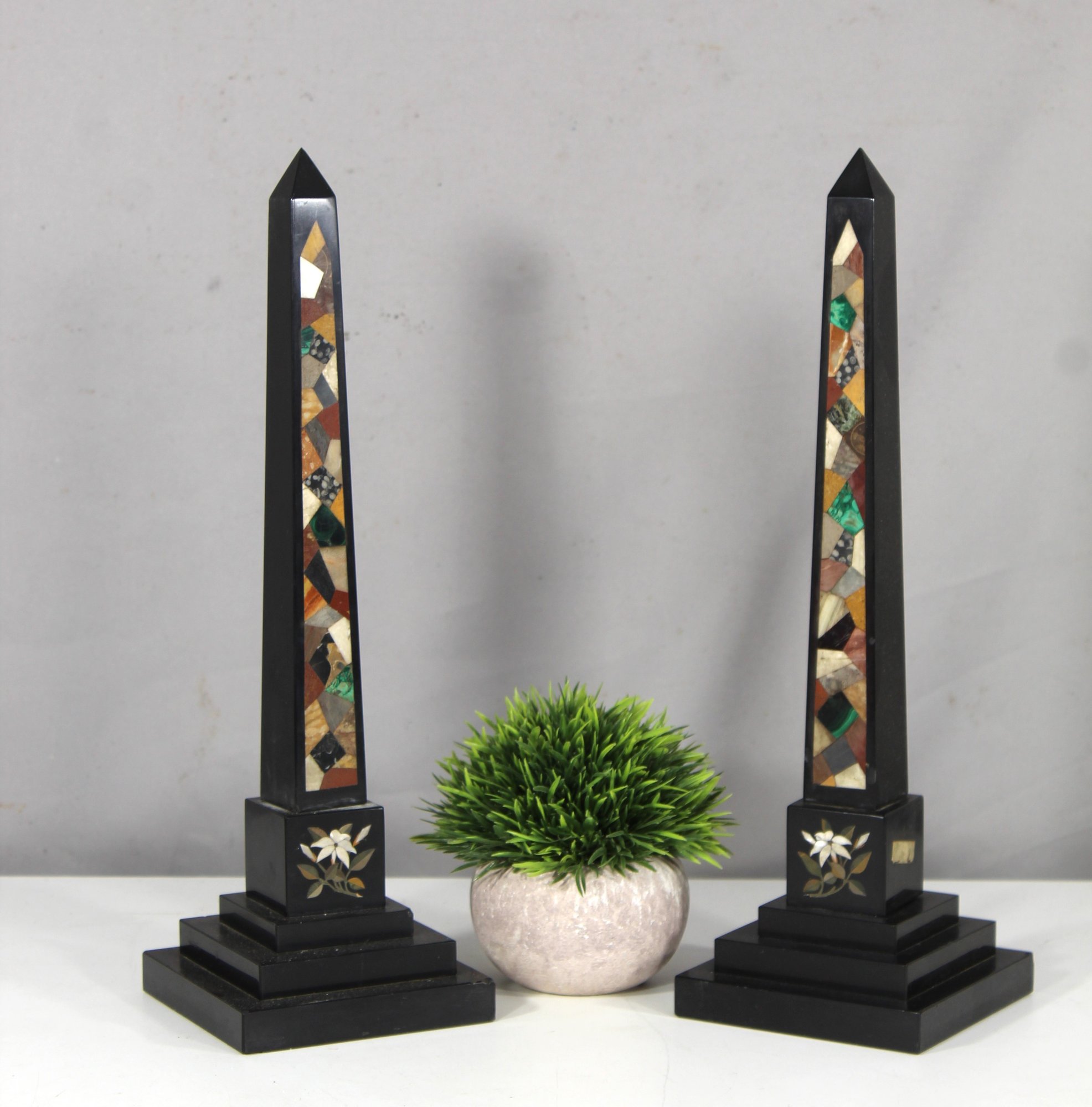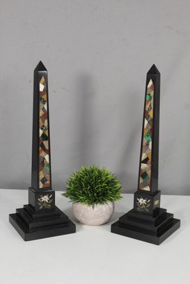 This striking pair of black marble obelisks stands 14 inches tall and features stunning inlaid stone accents. Each obelisk is adorned with a colorful geometric mosaic of semi-precious stones along the front and a delicate floral inlay on the base, combining timeless elegance with intricate craftsmanship.