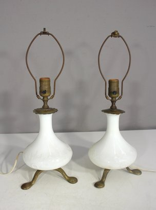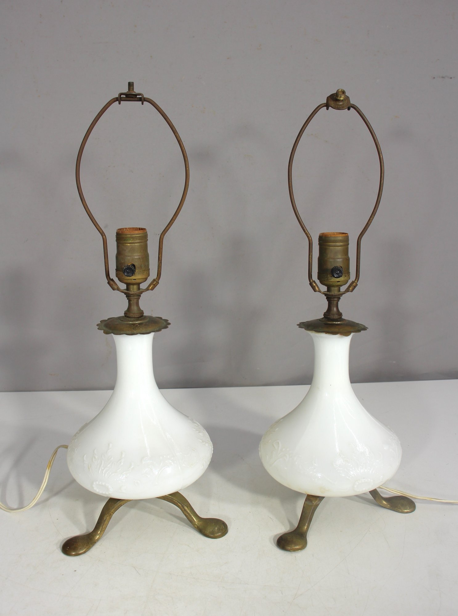 pair of vintage milk glass table lamps, standing 19 inches tall. These elegant lamps feature a beautifully shaped white milk glass body with delicate embossed floral detailing, supported by an ornate brass tripod base. The brass fittings and harp holders showcase a charming patina, adding to their antique appeal.