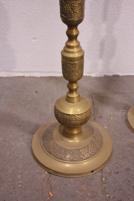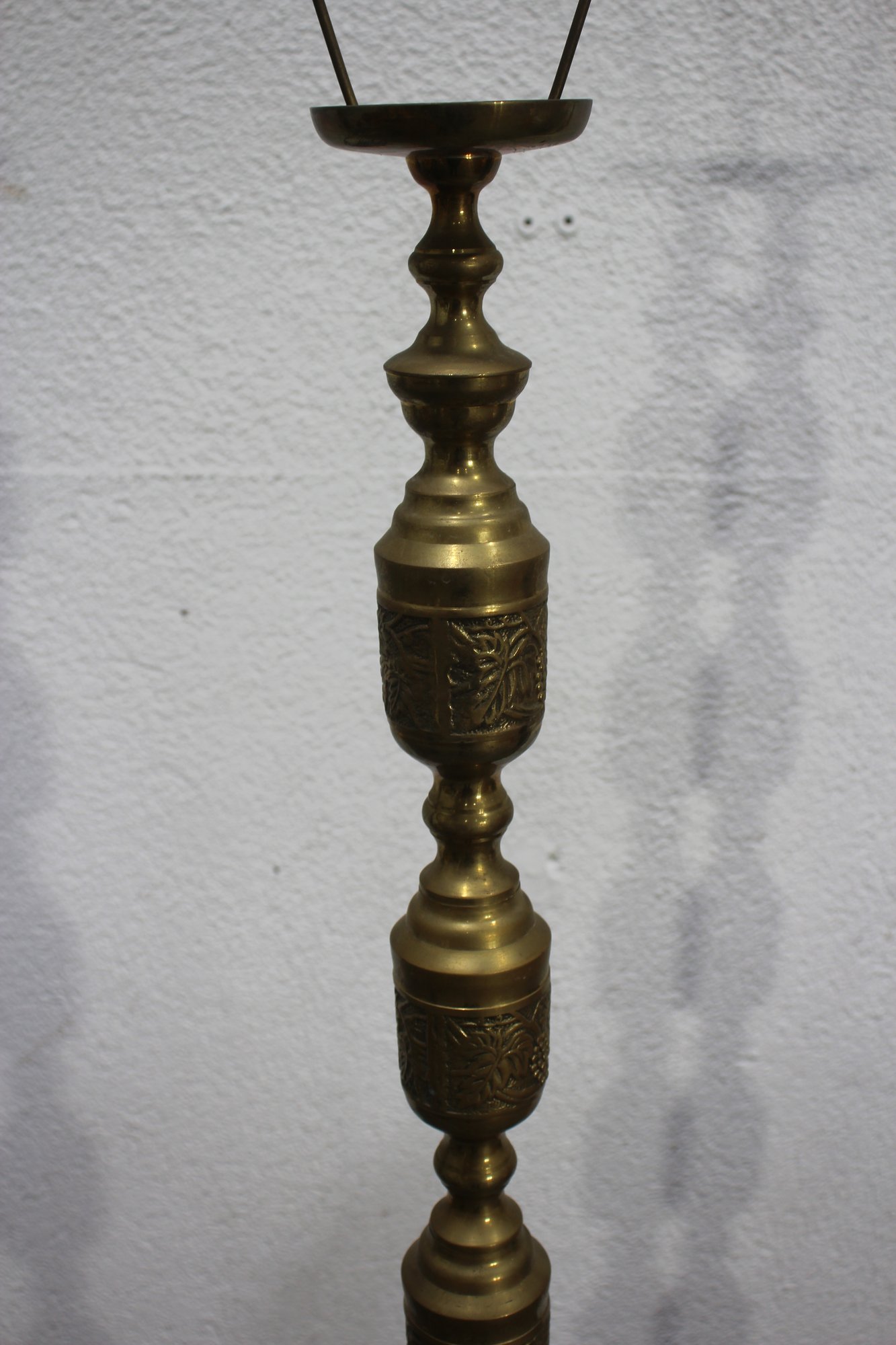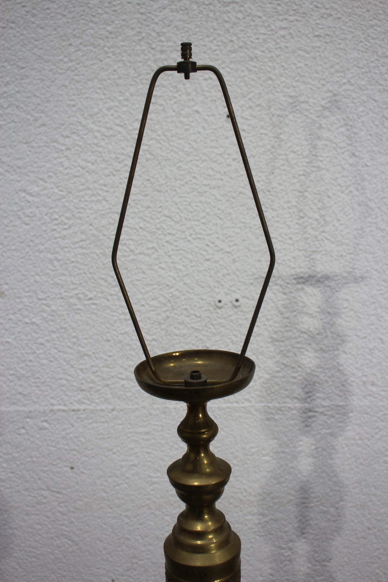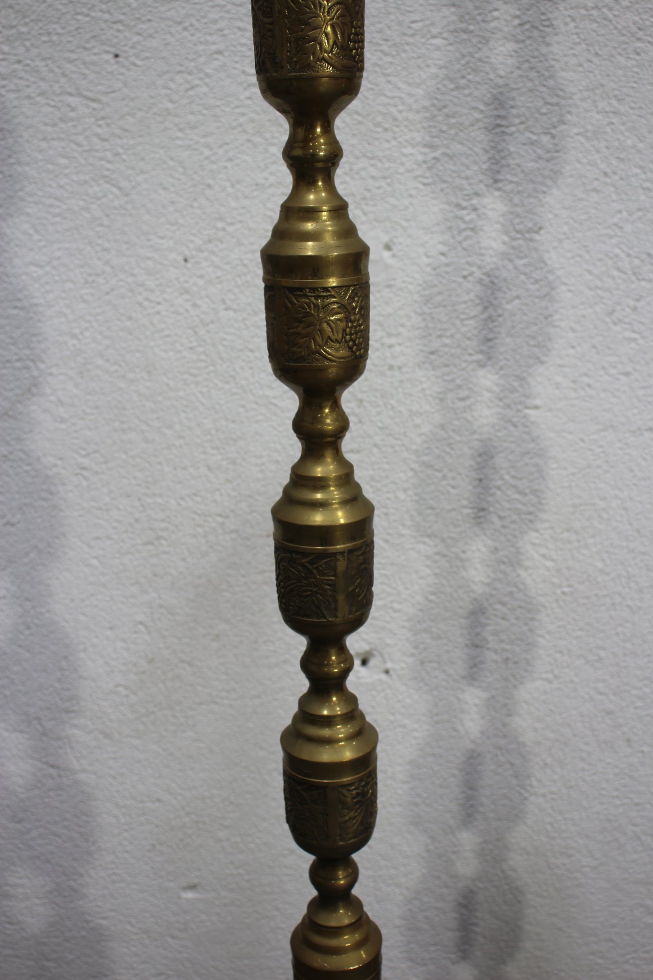 This stunning pair of Mid-Century Modern Japanese brass floor lamps from the 1960s showcases exquisite craftsmanship and cultural artistry. Each lamp features beautifully embossed enamel detailing inspired by Egyptian and Middle Eastern motifs, making them unique statement pieces. Their tall, elegant design and gleaming brass finish reflect the timeless appeal of MCM decor, blending sophistication with global inspiration.