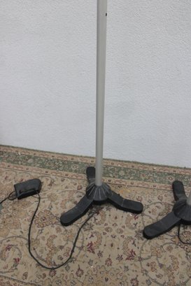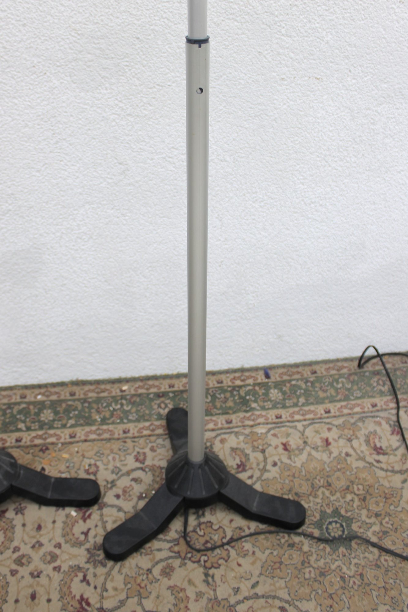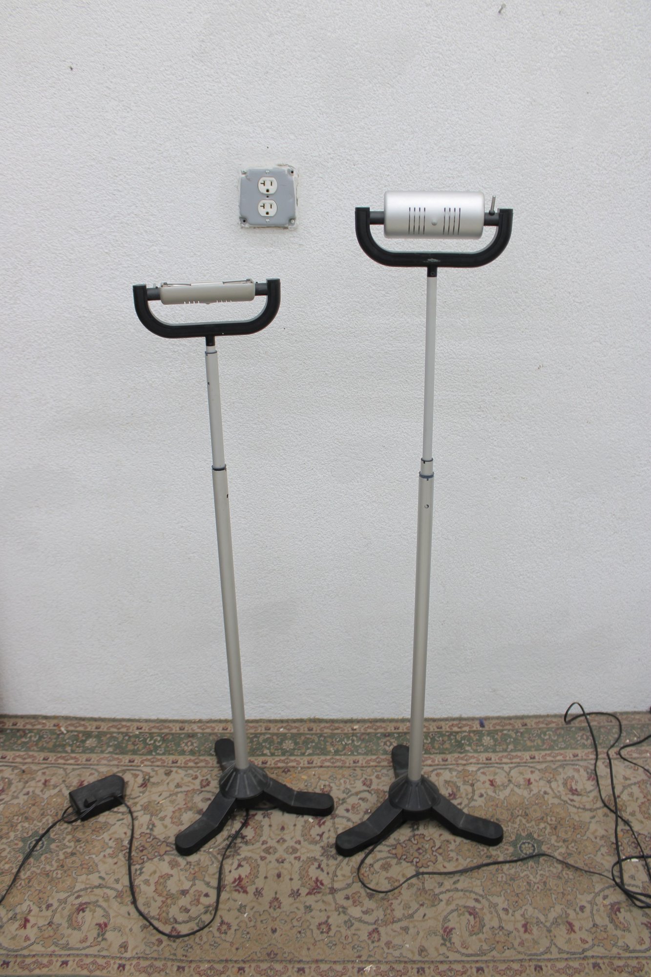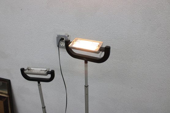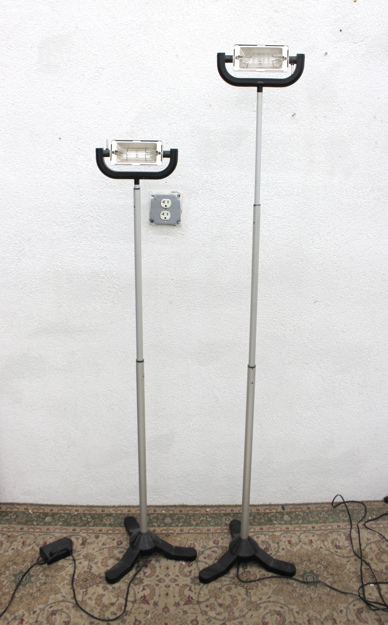 Functional pair of adjustable floor lamps featuring a clean, industrial design reminiscent of medical or exam lighting. Each lamp is mounted on a sturdy tripod base with adjustable height poles and rectangular light heads framed by black accents.