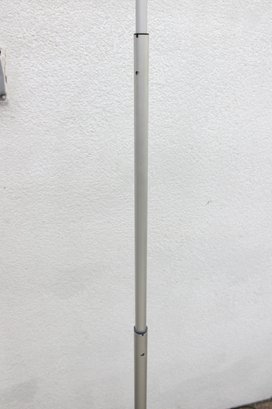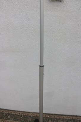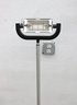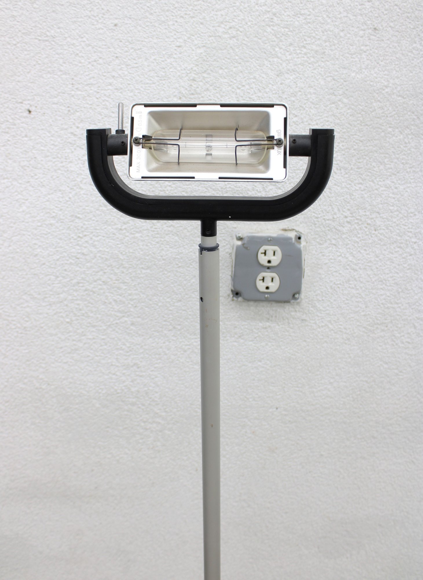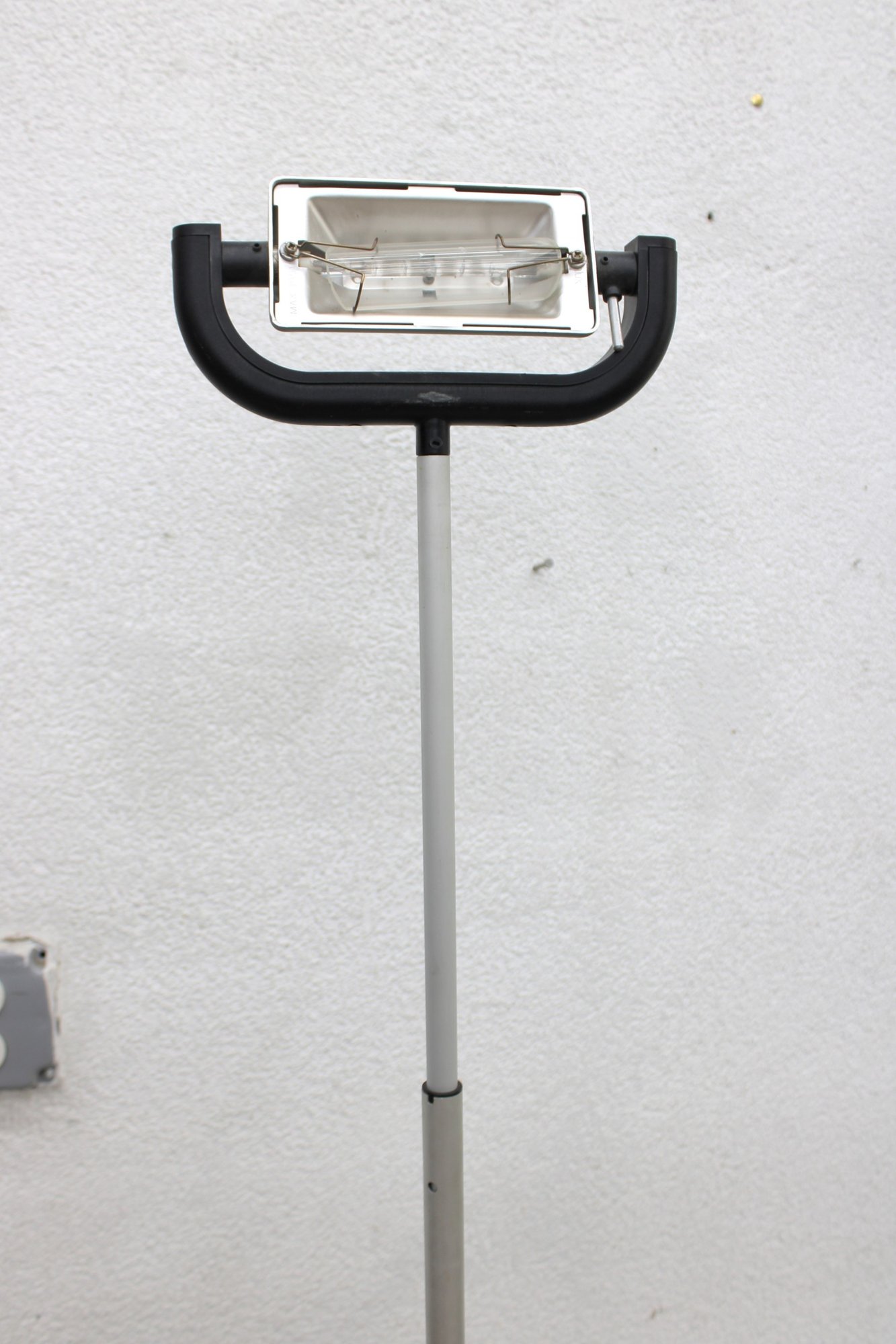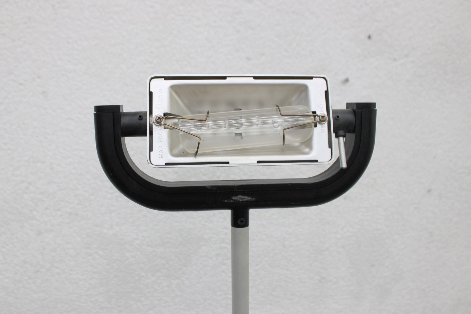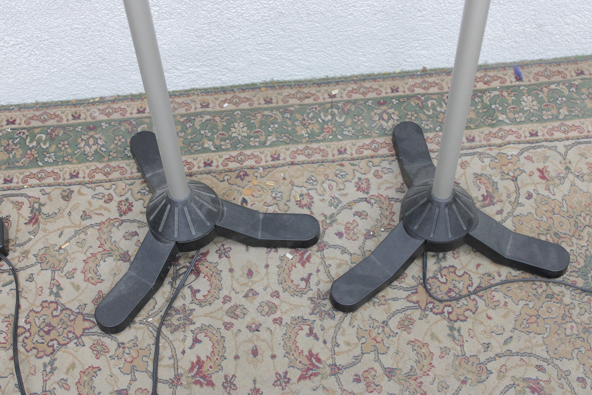 Functional pair of adjustable floor lamps featuring a clean, industrial design reminiscent of medical or exam lighting. Each lamp is mounted on a sturdy tripod base with adjustable height poles and rectangular light heads framed by black accents.