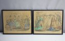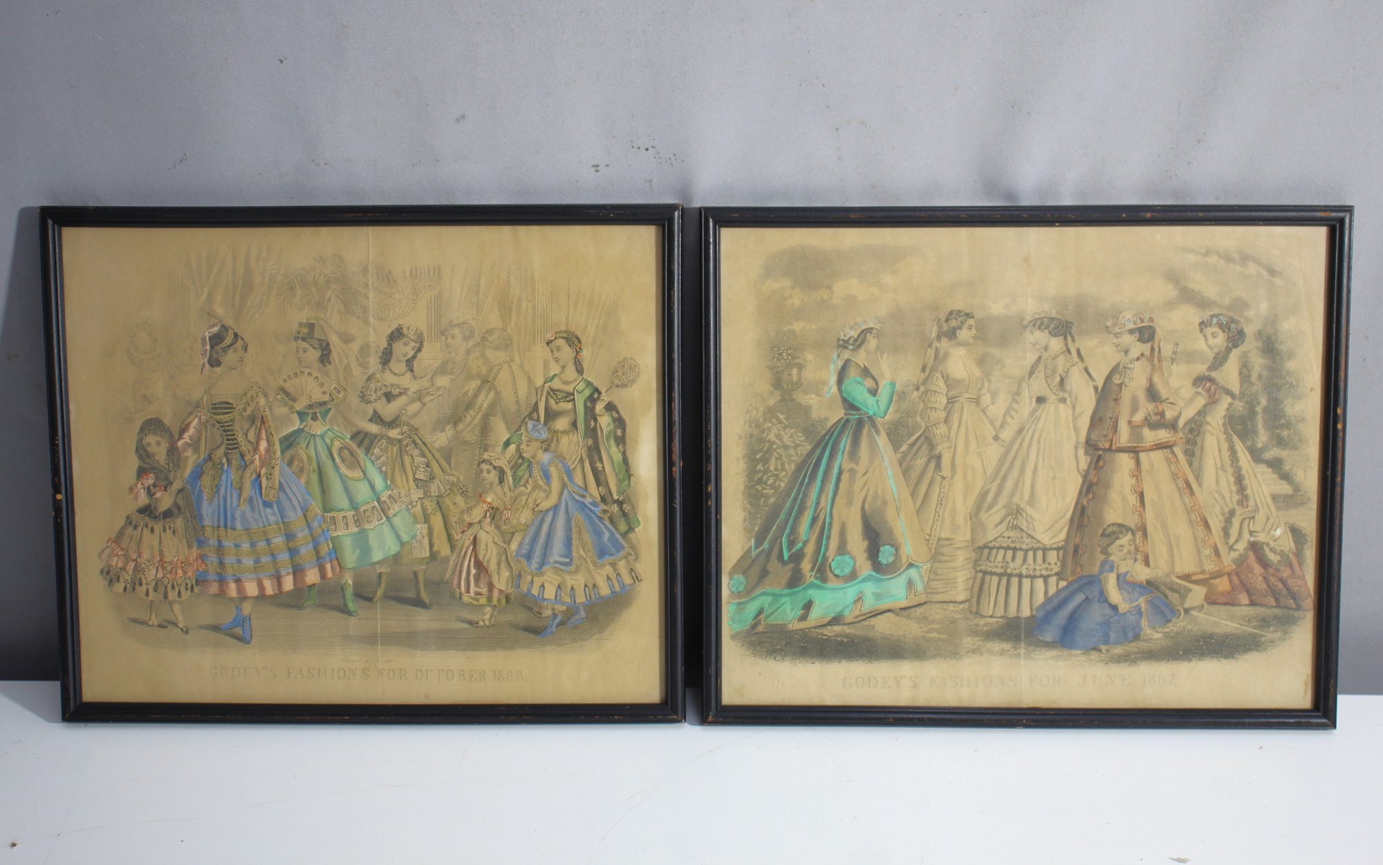 This pair of antique fashion lithographs from Godey’s Lady’s Book beautifully captures 19th-century women's and children's fashion. The first print, labeled "Godey's Fashions for October 1858," depicts a lively scene featuring women and young girls in vibrant, detailed dresses adorned with ribbons and ruffles. The second print, "Godey's Fashions for June 1857," showcases elegantly dressed women in formal attire, illustrating the sophisticated style of the era.