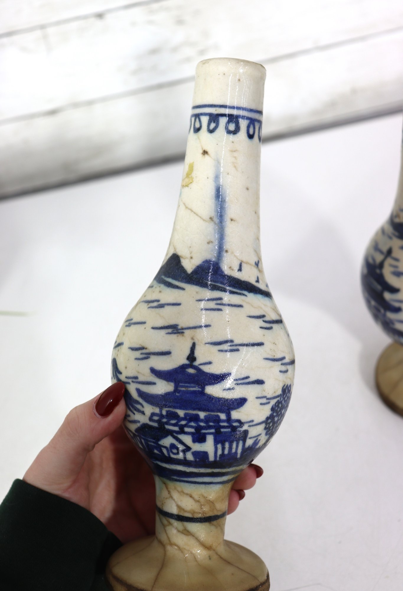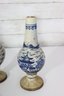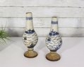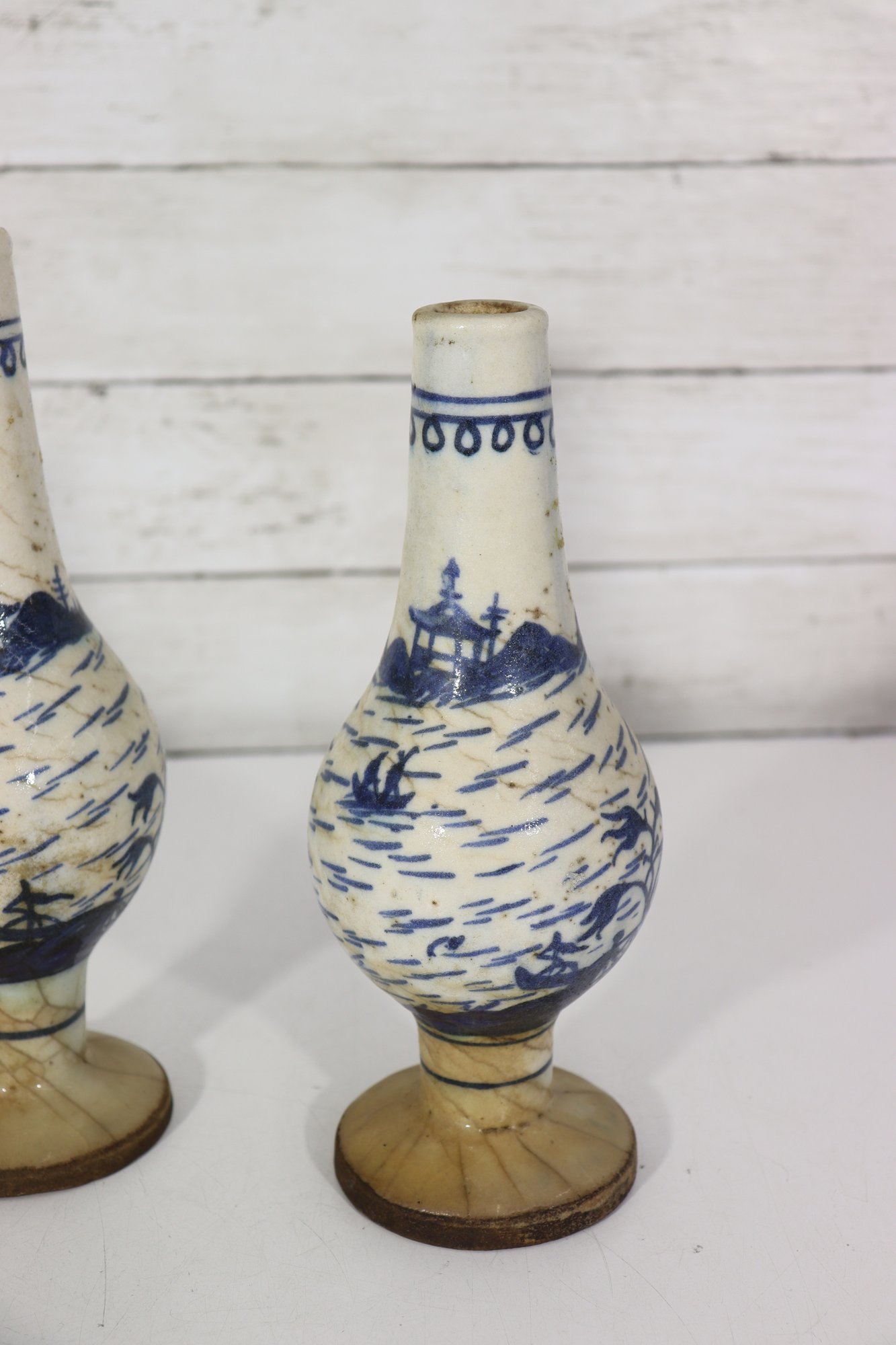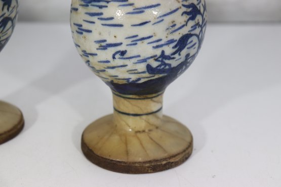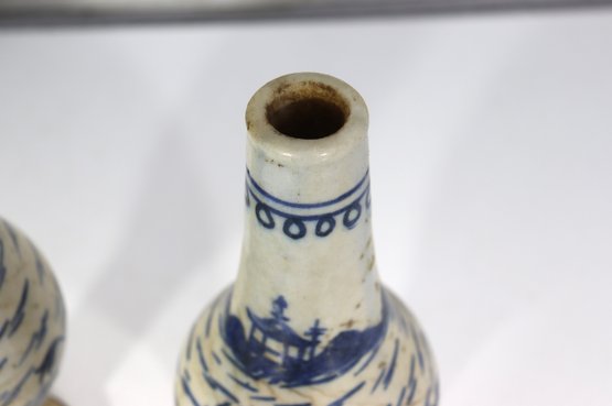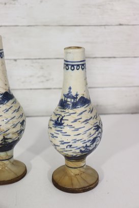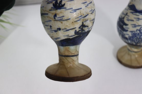 Attractive pair of antique decorative vases featuring a classic blue and white hand-painted scenic motif. Each vase displays stylized landscape imagery with figures, boats, and flowing brushwork, giving them a charming, traditional appearance.