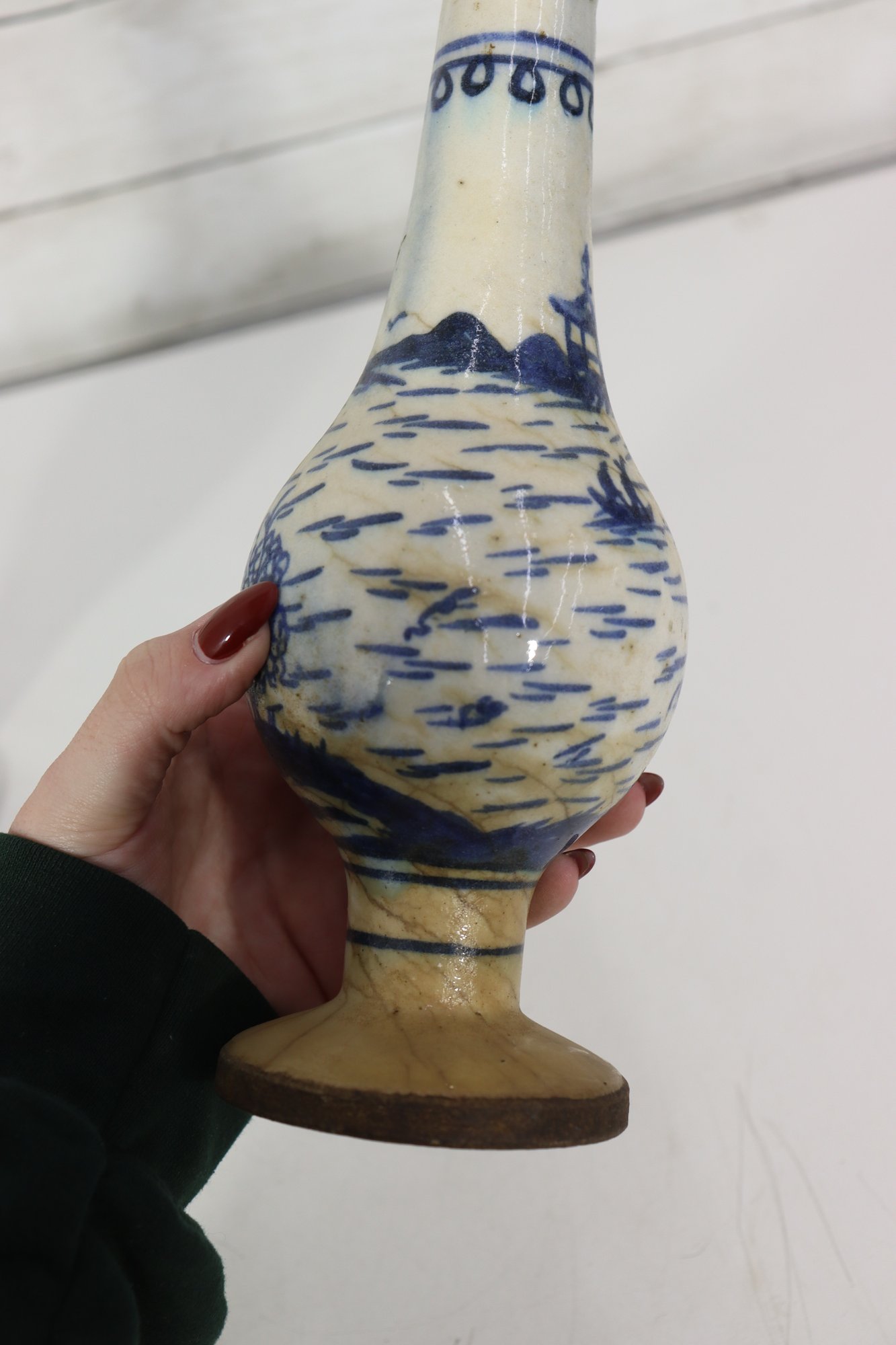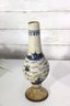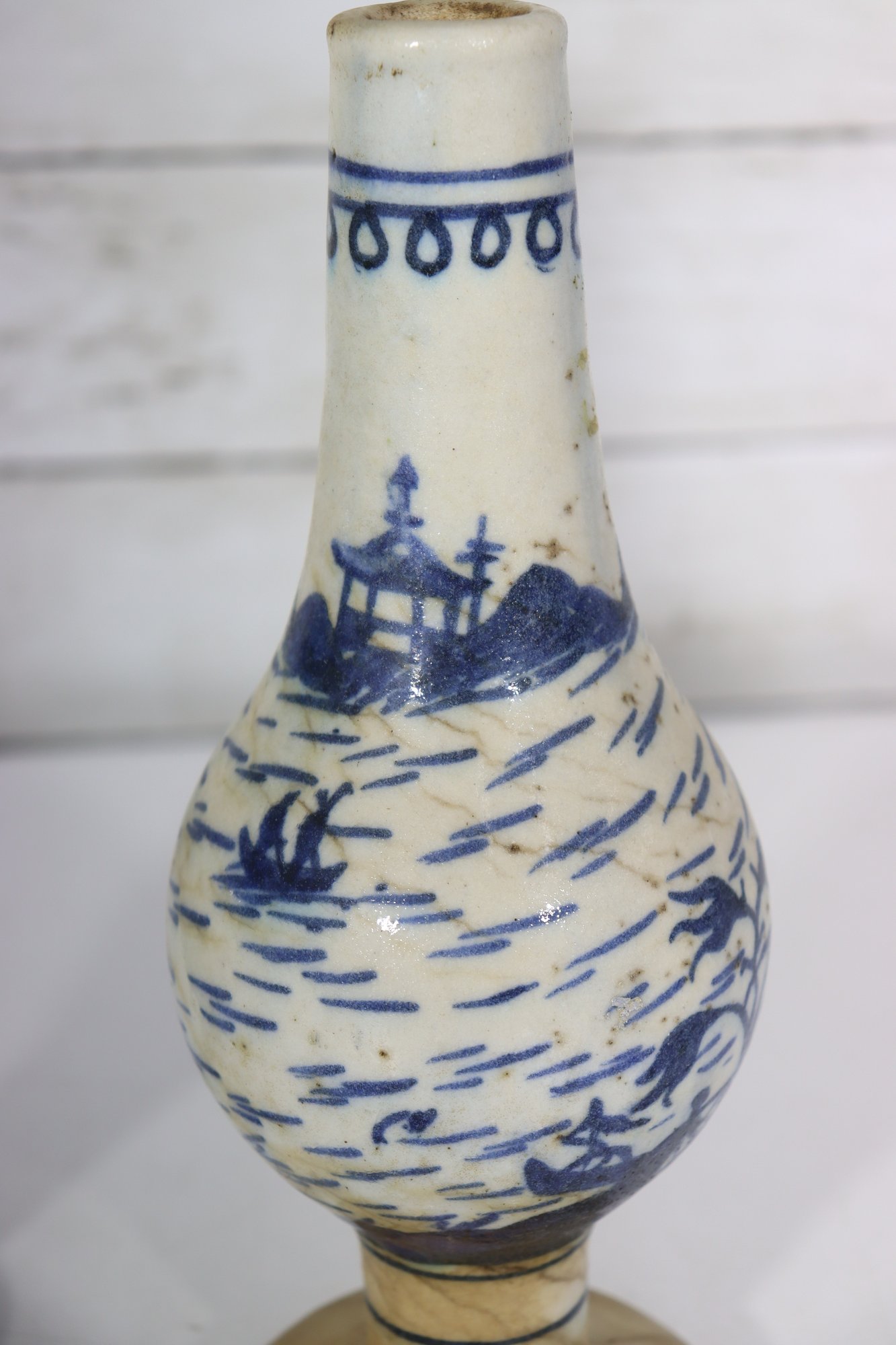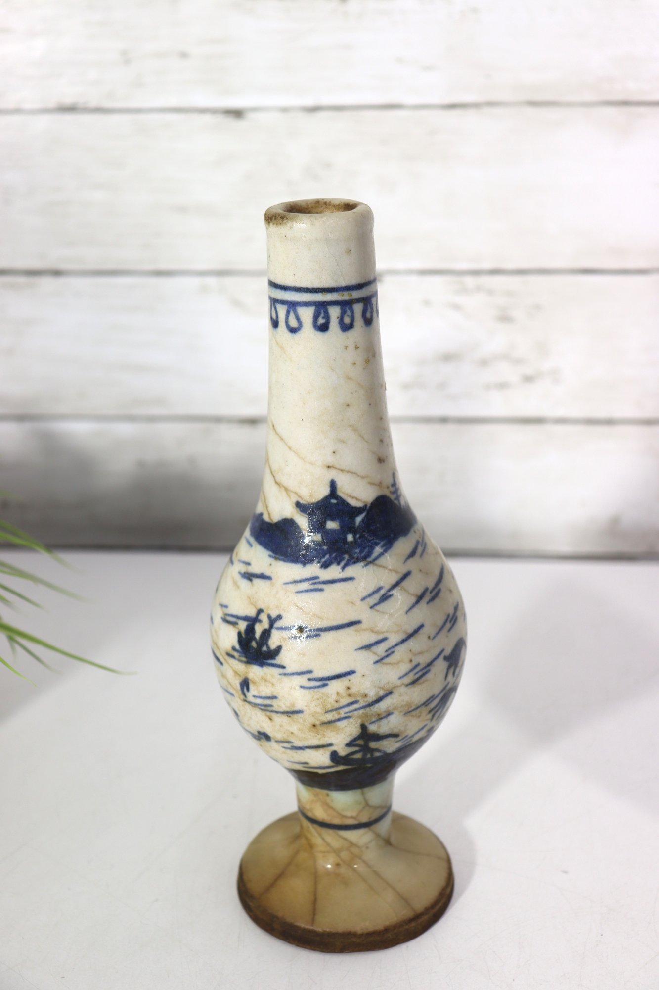 Attractive pair of antique decorative vases featuring a classic blue and white hand-painted scenic motif. Each vase displays stylized landscape imagery with figures, boats, and flowing brushwork, giving them a charming, traditional appearance.