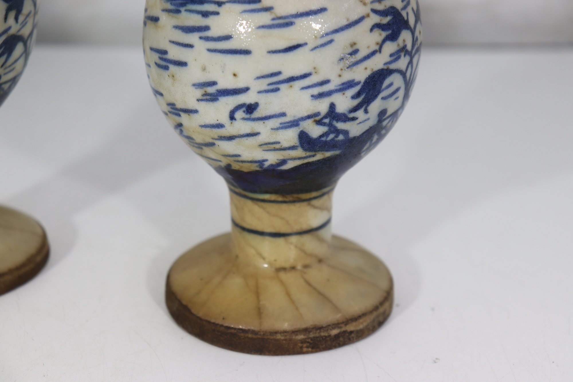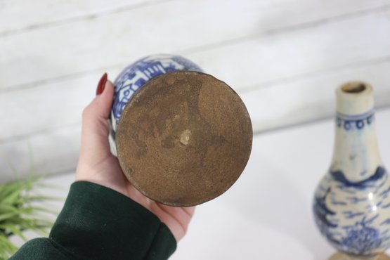 Both vases show age-related cracks and wear to the bases, consistent with older pottery and clearly visible in the photos. The cracks appear stable and do not detract from their decorative appeal when displayed.