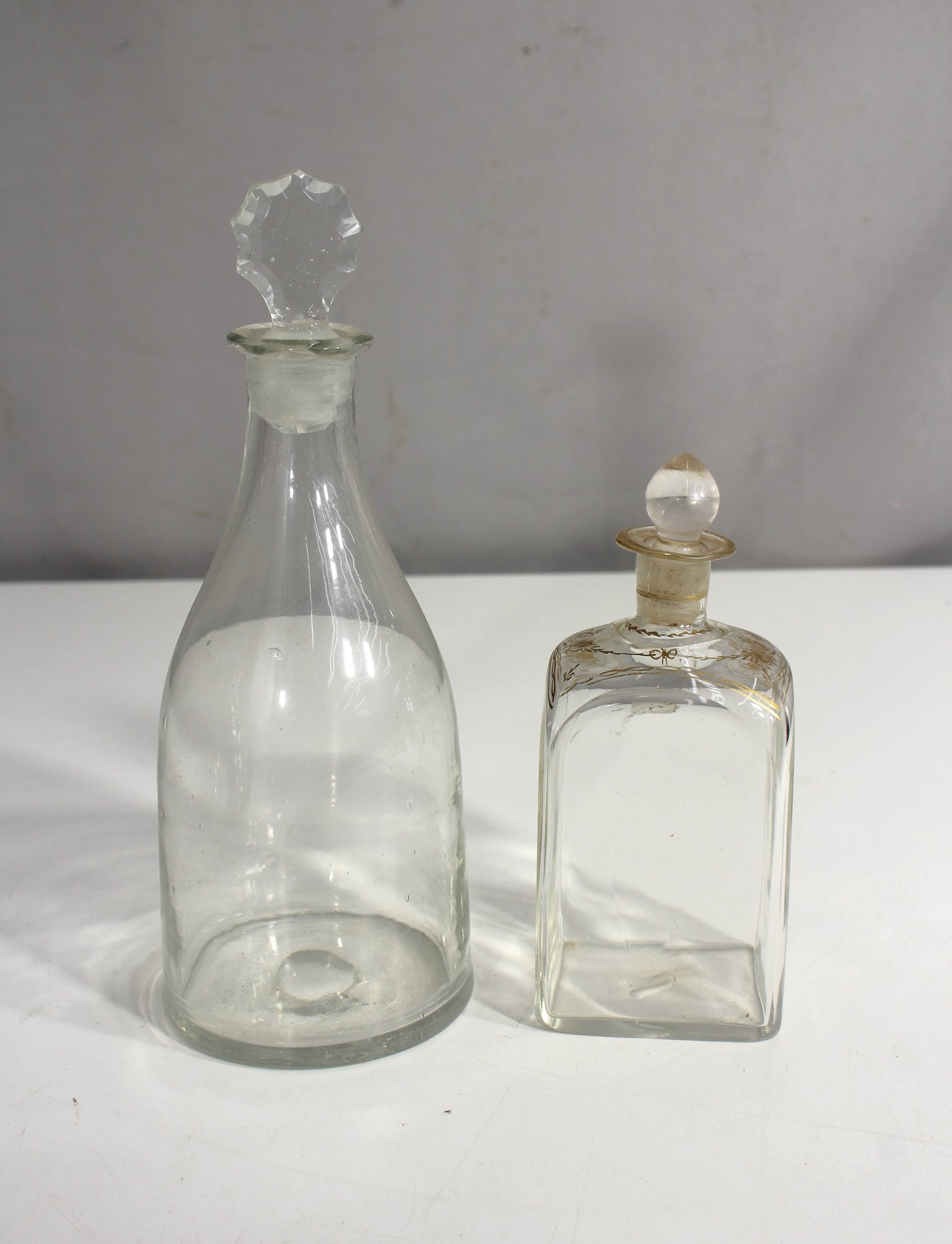pair of antique glass decanters, measuring 6.5 inches and 9.5 inches in height, each featuring elegant glass stoppers. These exquisite bottles showcase classic craftsmanship, with one featuring a delicate gold floral design and the other a sleek tapered shape with a uniquely cut stopper.