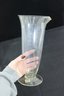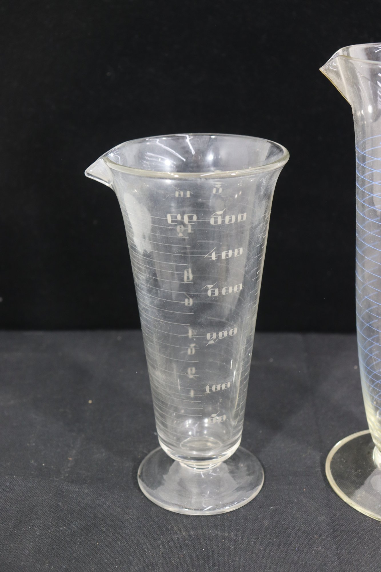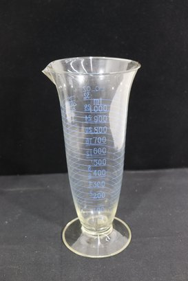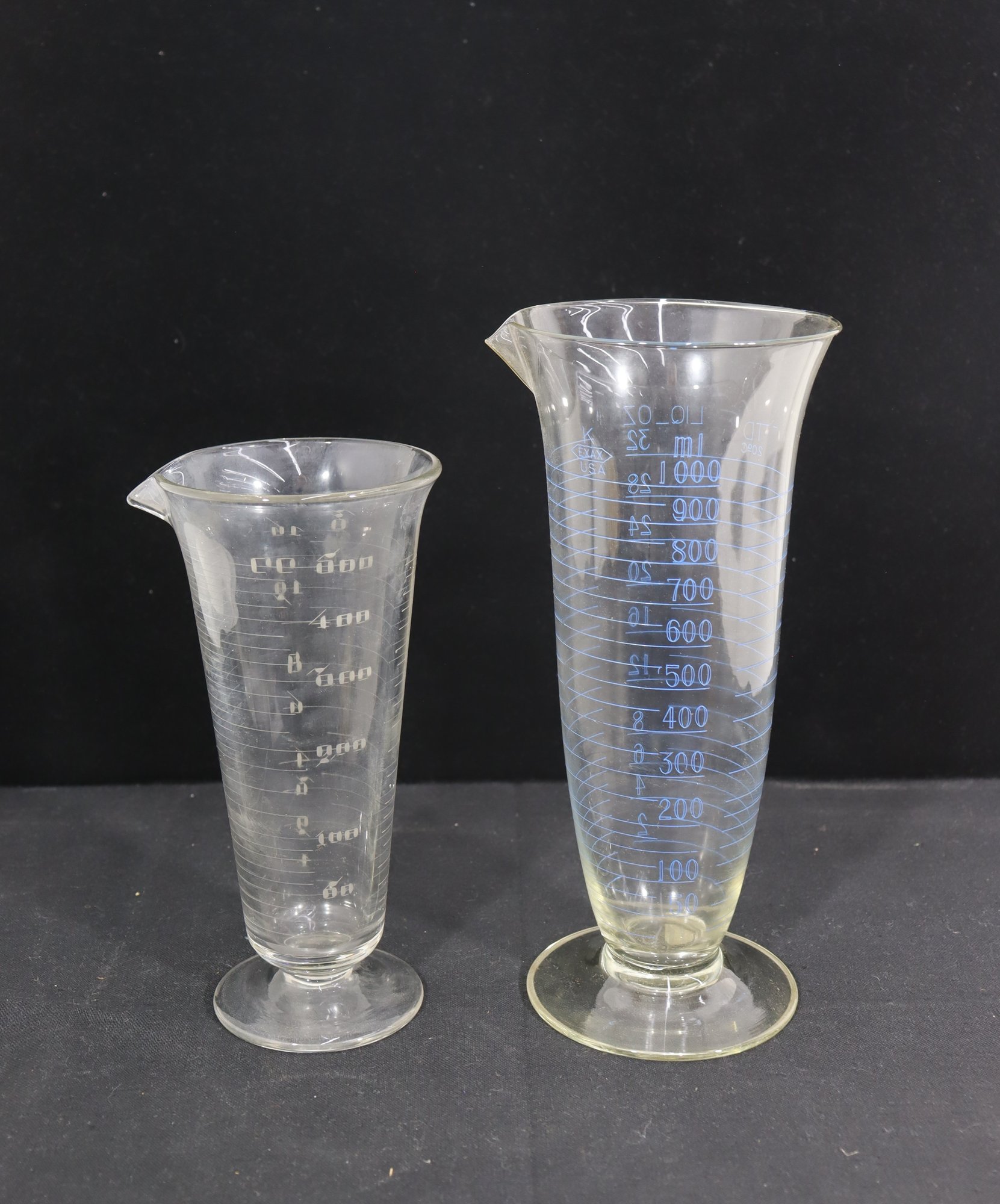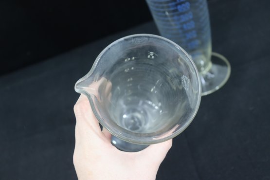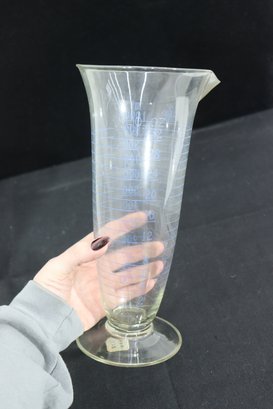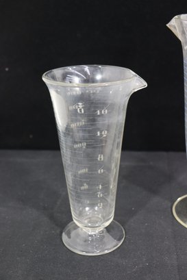 pair of graduated glass measuring vessels, standing approximately 9 inches and 11 inches tall. Each piece features a flared rim with a pouring spout, pedestal base, and clearly marked graduated measurements along the body.