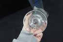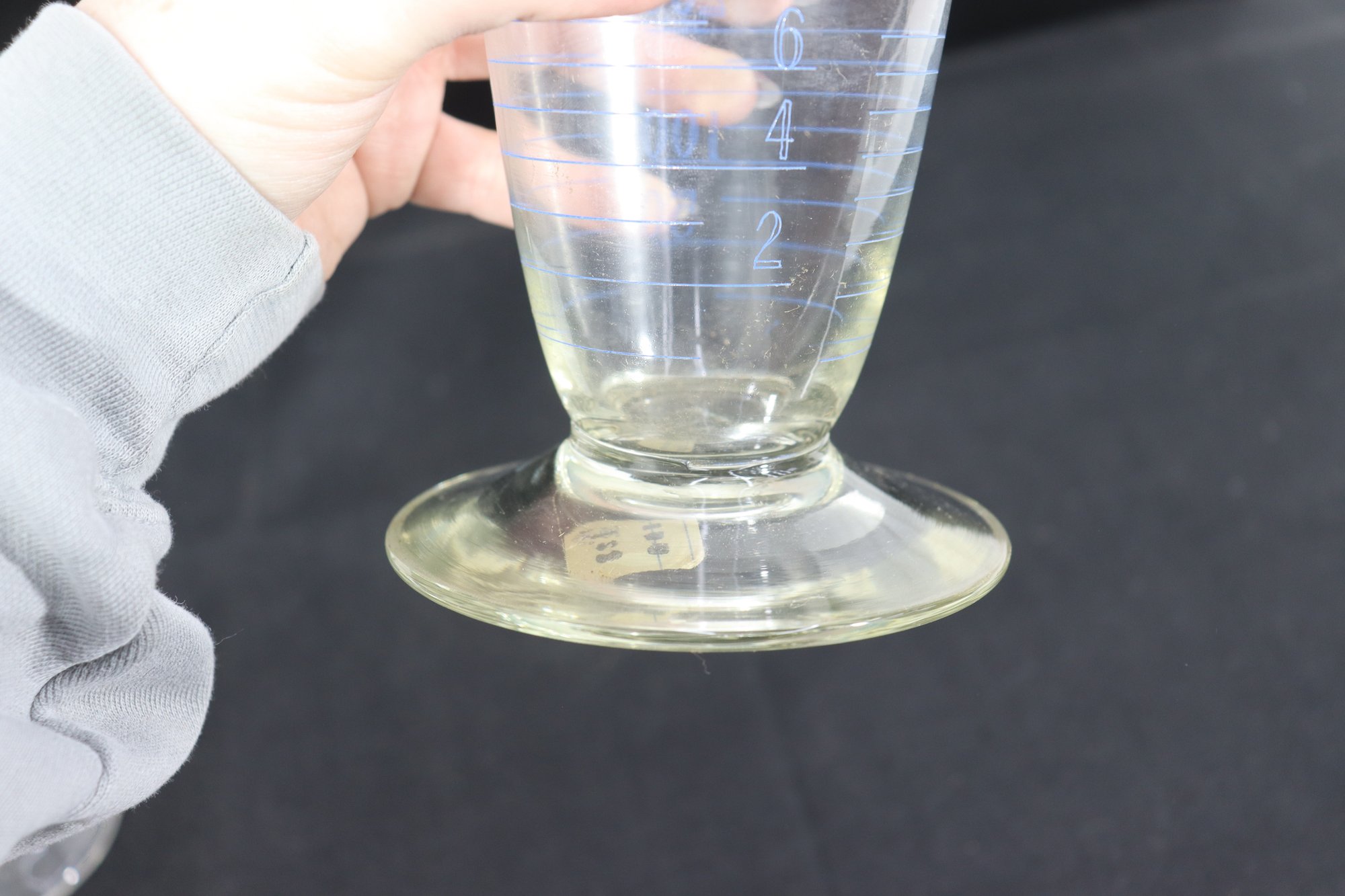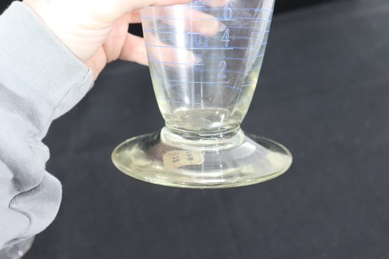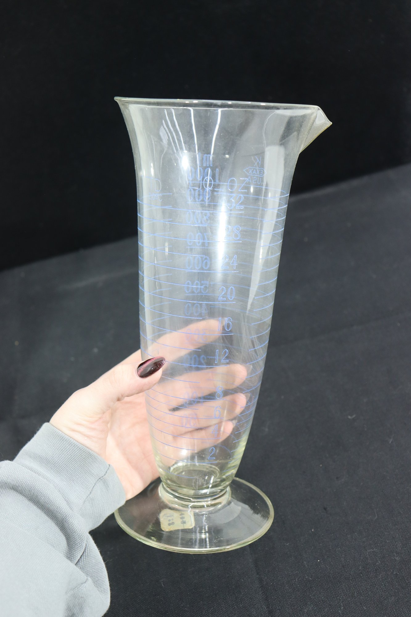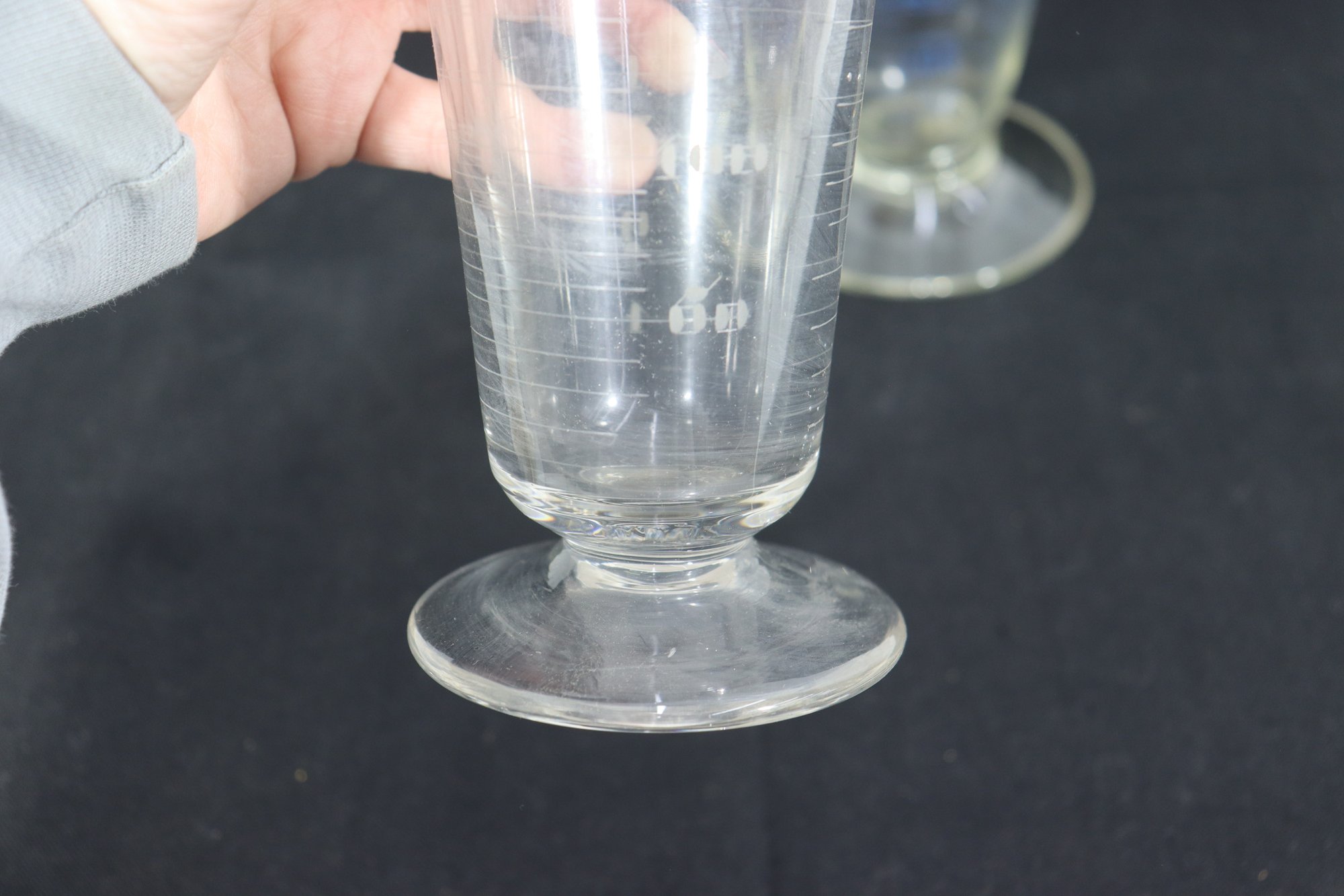 pair of graduated glass measuring vessels, standing approximately 9 inches and 11 inches tall. Each piece features a flared rim with a pouring spout, pedestal base, and clearly marked graduated measurements along the body.