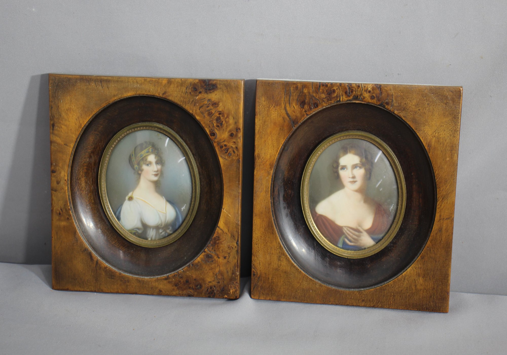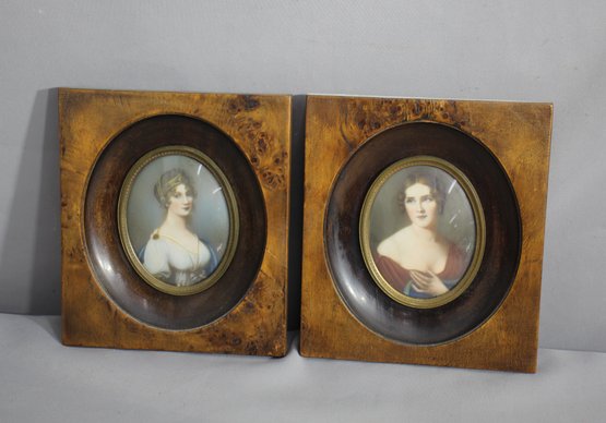 each encased in a magnificent burl wood frame with a classic circular window. These artworks capture the serene beauty of two women, portrayed with the finesse and grace characteristic of the bygone era. The subjects, adorned in attire that reflects their noble status, are rendered with soft yet precise brushstrokes, imbuing each piece with a life-like presence. The warm, rich patterns of the burl wood complement the delicacy of the portraits, while the protective glass covers have safeguarded the images for posterity.
