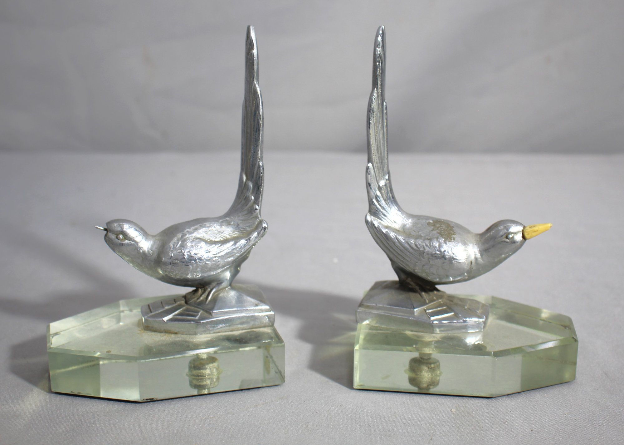 Enhance your bookshelf with this elegant pair of Art Deco bird bookends, each beautifully crafted to resemble a bird in mid-pose with its tail feathers elegantly raised. These bookends feature a sleek silver-tone finish on the birds, mounted on substantial octagonal crystal bases that ensure stability and add a touch of sophistication. Perfect for lovers of Art Deco style