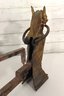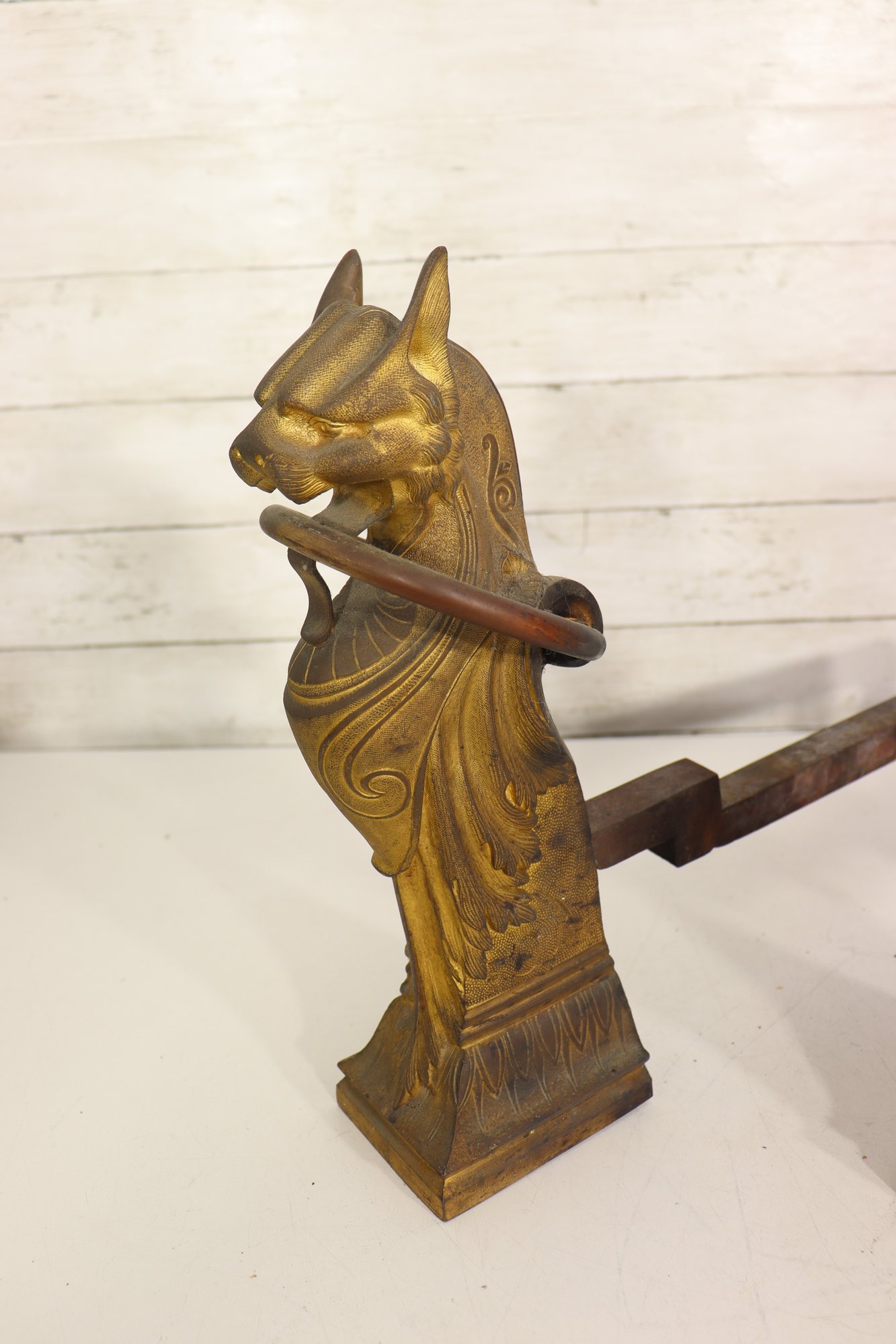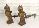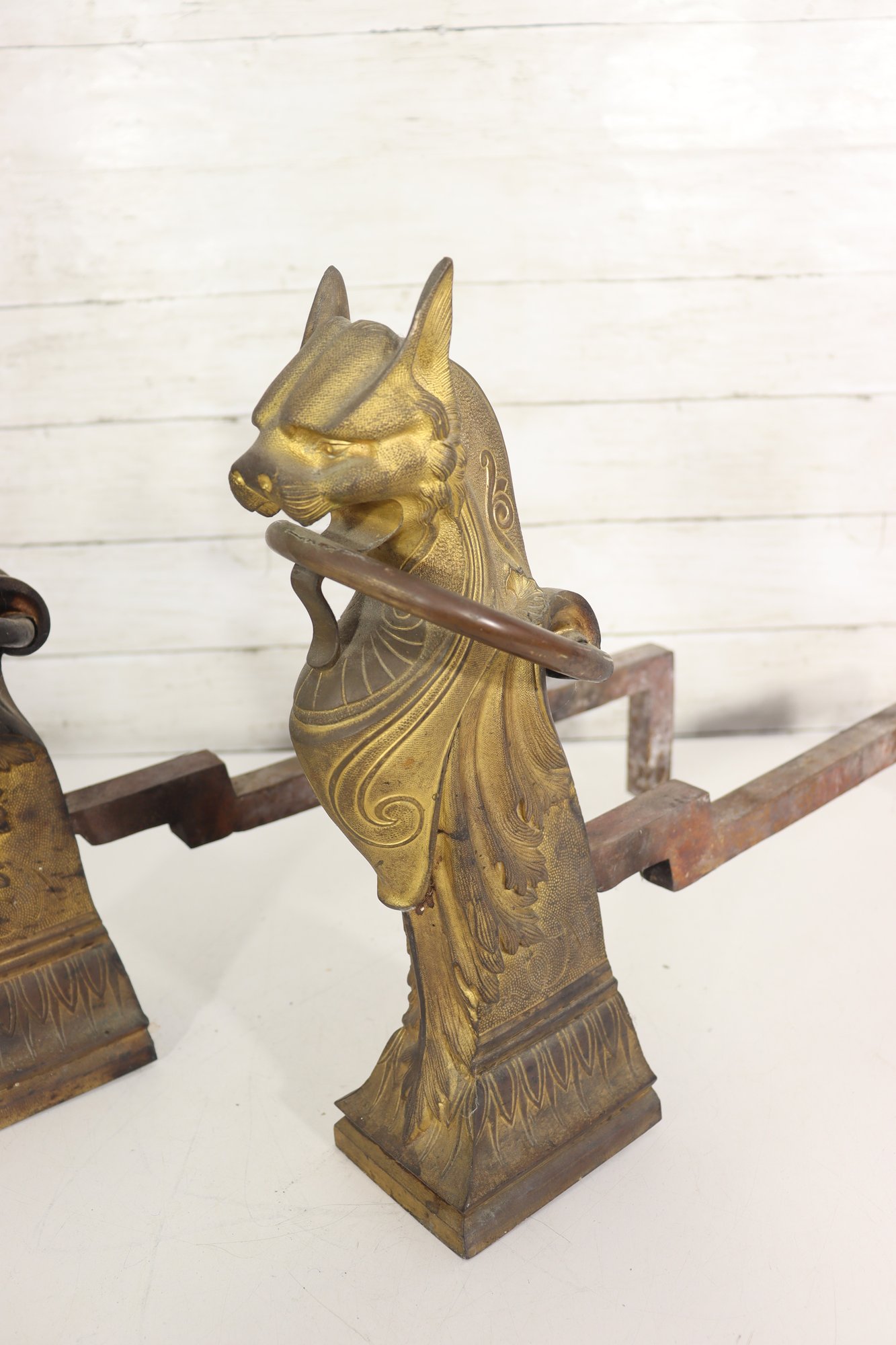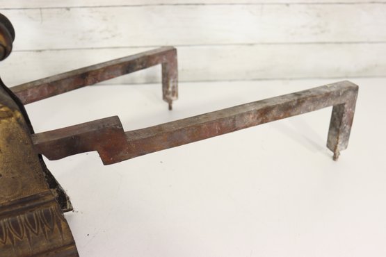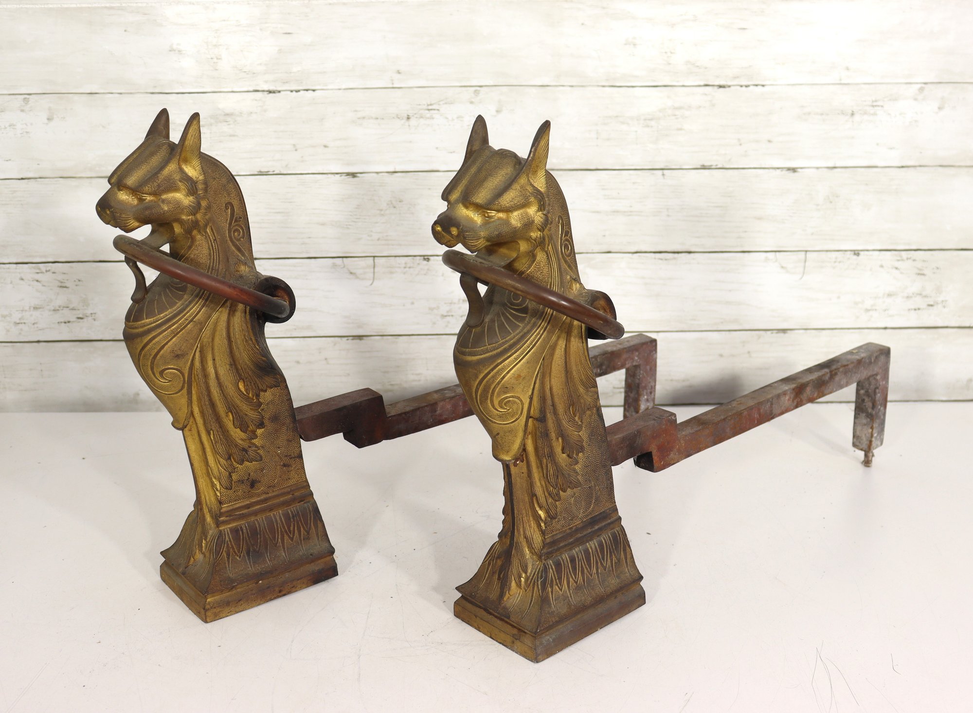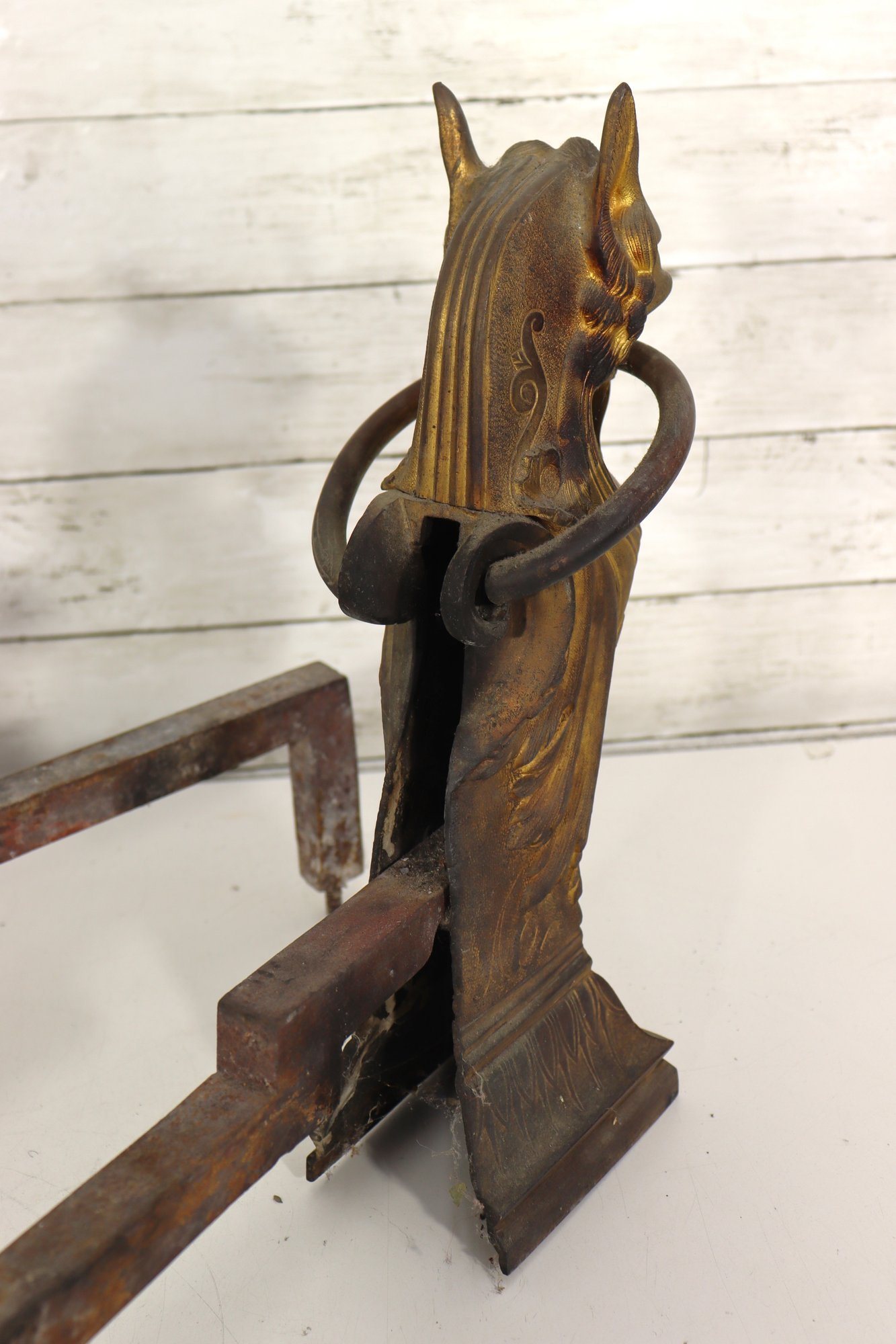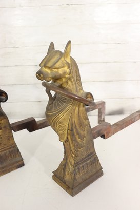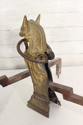 Pair of vintage cast brass fireplace andirons featuring highly detailed head finials with draped decorative styling. Each andiron is made with a brass front and iron support bars. These have great classic equestrian Victorian style character and will make a beautiful addition to a fireplace setting or hearth display.