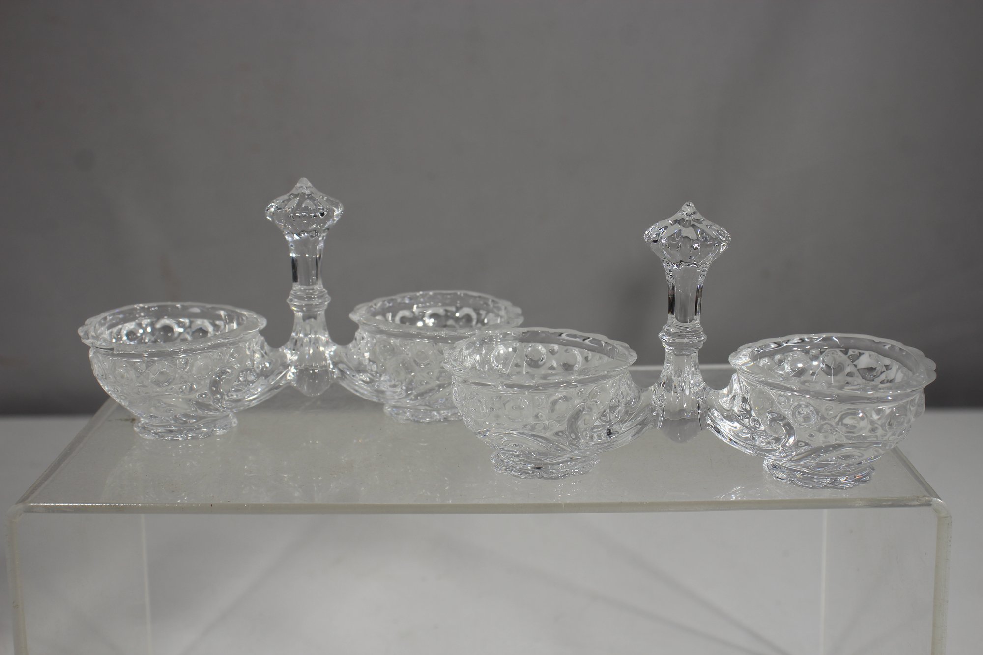 pair of Baccarat crystal double salt cellars features a stunning pressed glass design with intricate detailing and an elegant central handle. The craftsmanship showcases Baccarat's signature clarity and brilliance, making these perfect for serving salts, pepper, or spices in a sophisticated dining setting.