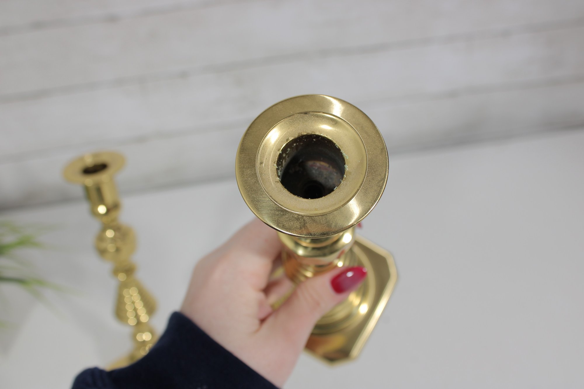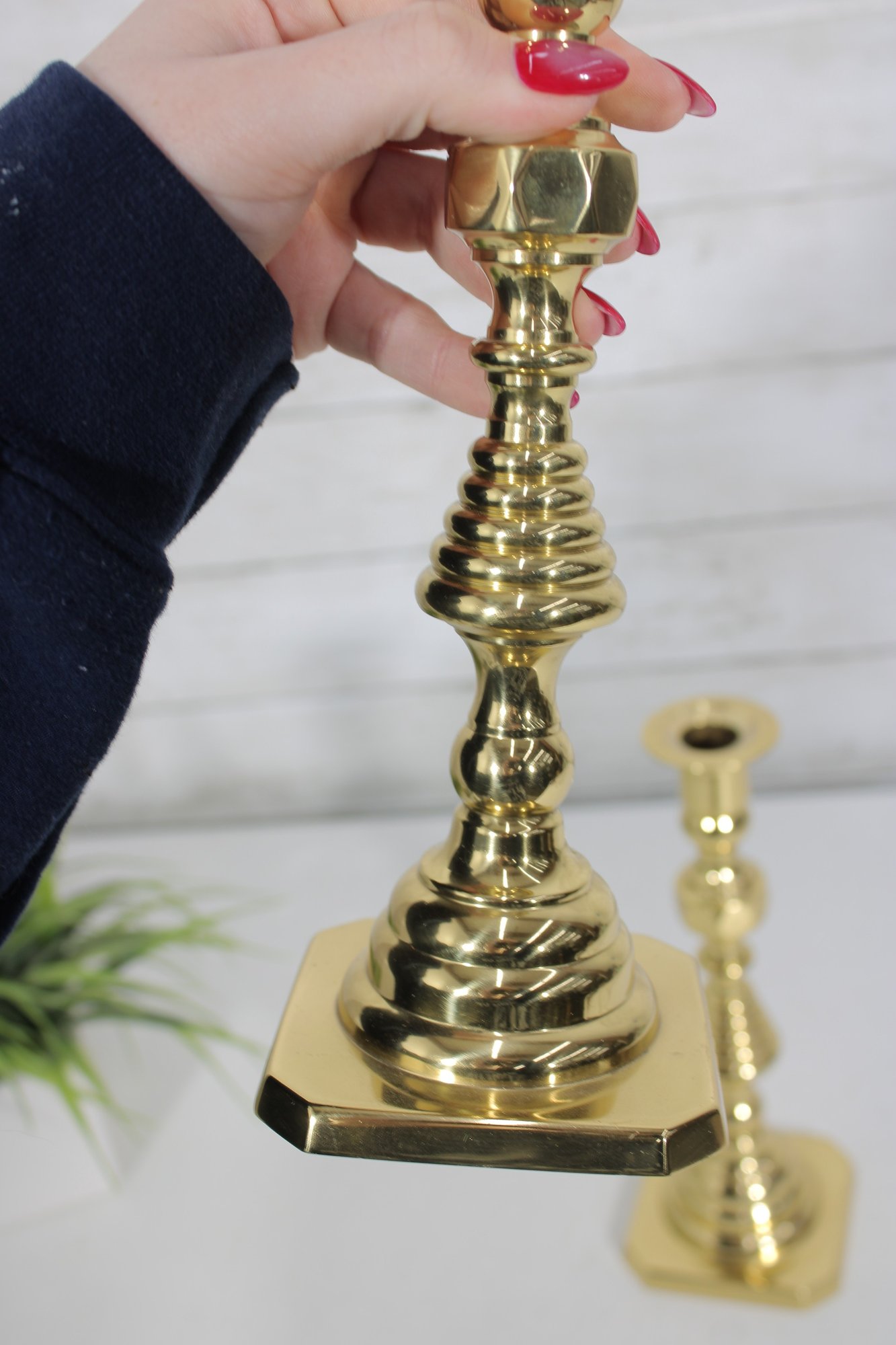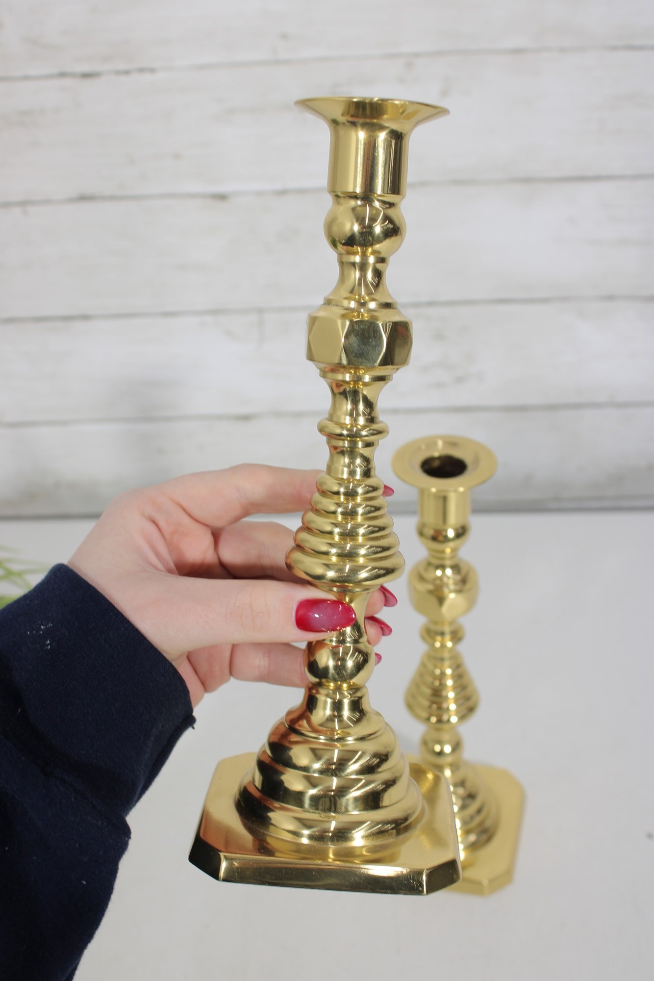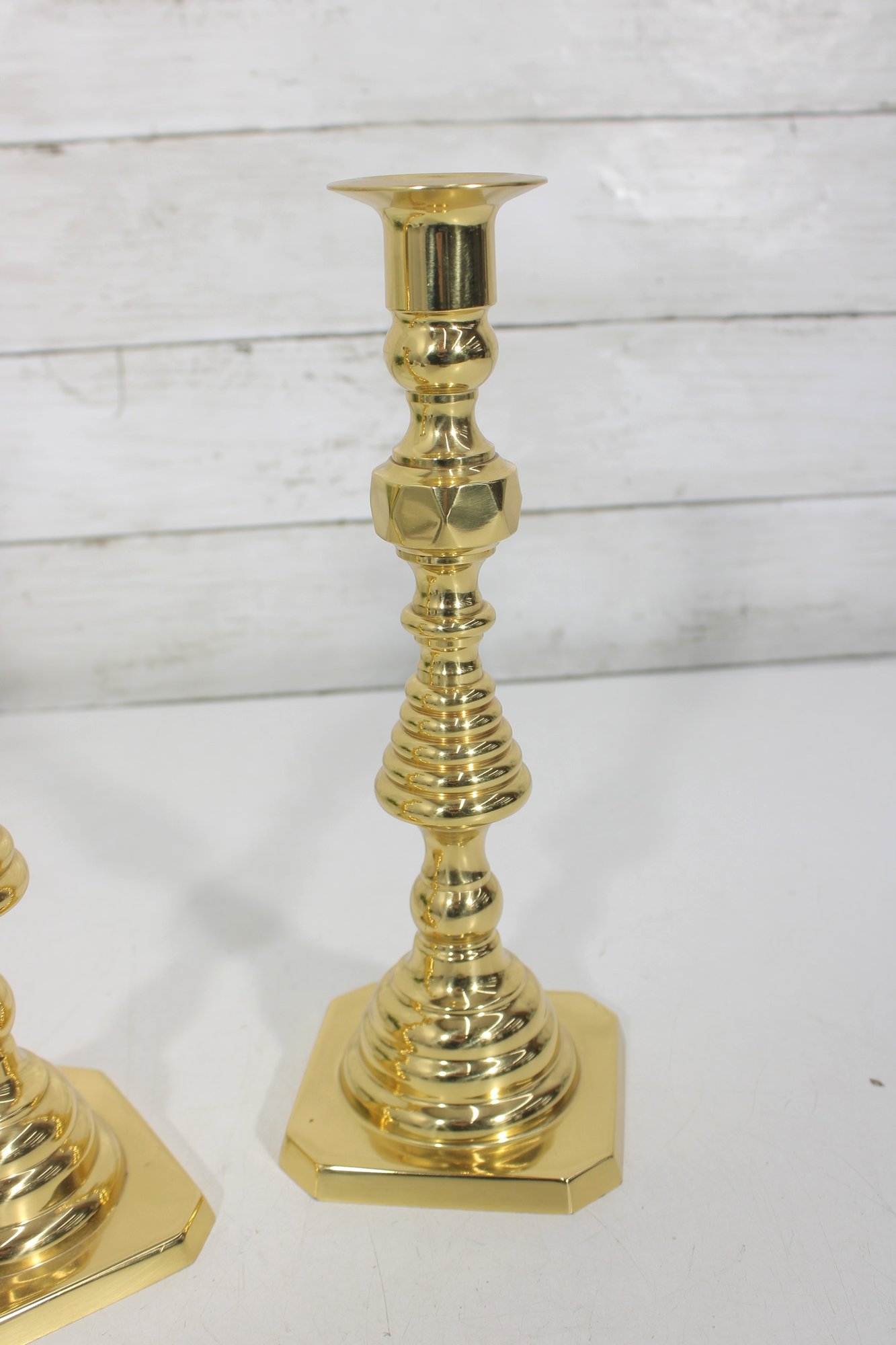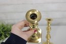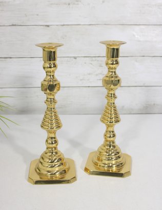 pair of solid brass candlesticks featuring a classic turned design with a polished golden finish. These timeless candle holders showcase a traditional silhouette with stepped and baluster-style elements, making them suitable for both traditional and modern décor.