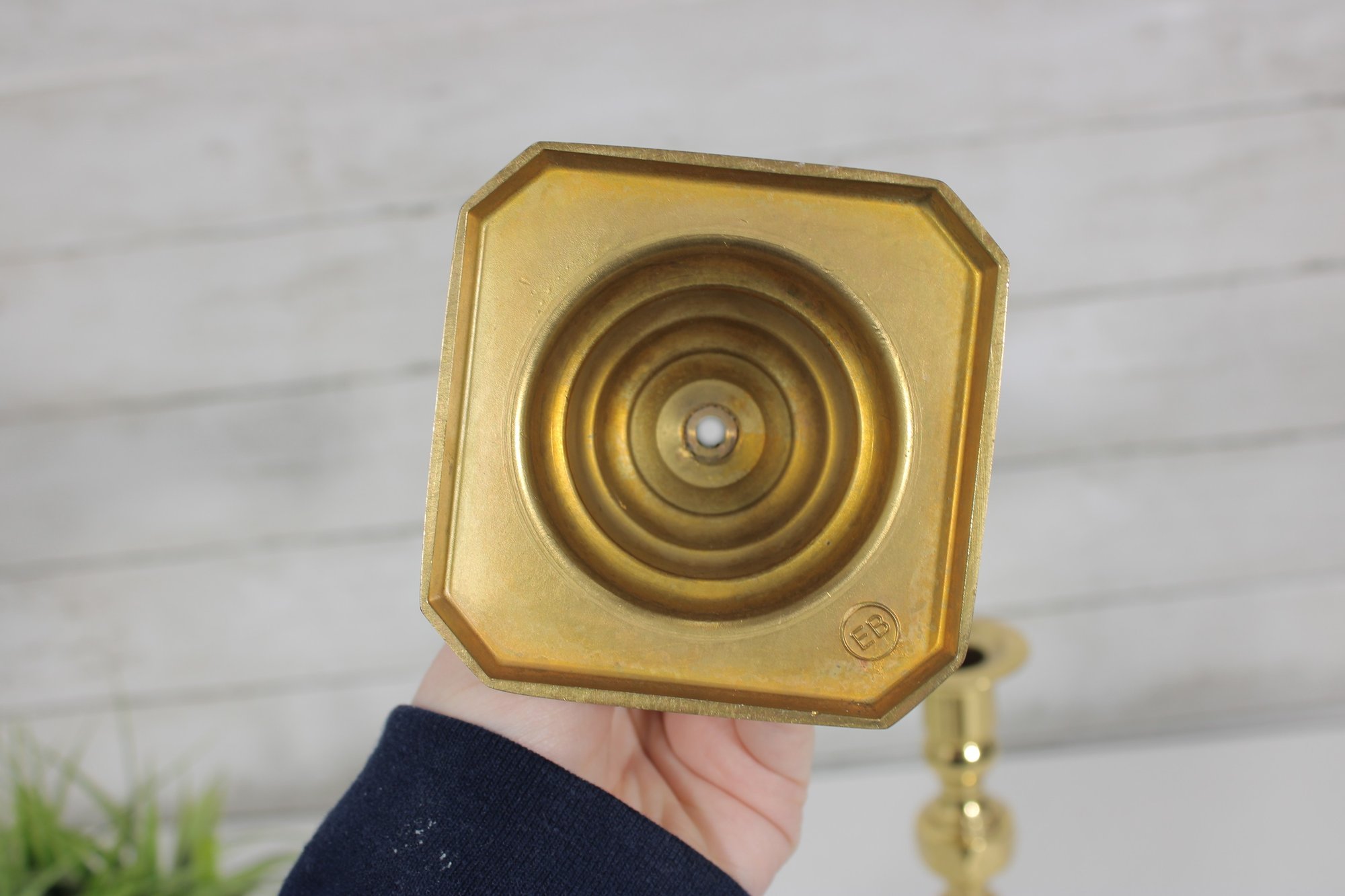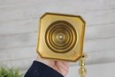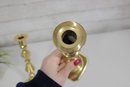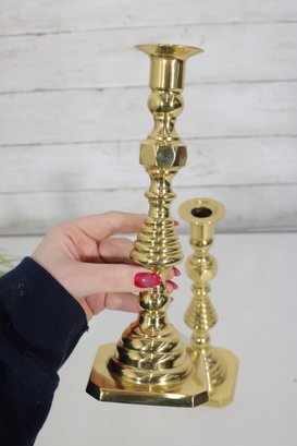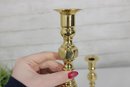 Each candlestick stands approximately 10 inches tall and is supported by a square base, providing stability and a refined look. The warm brass tone adds a touch of sophistication, perfect for dining tables, mantels, or decorative displays.