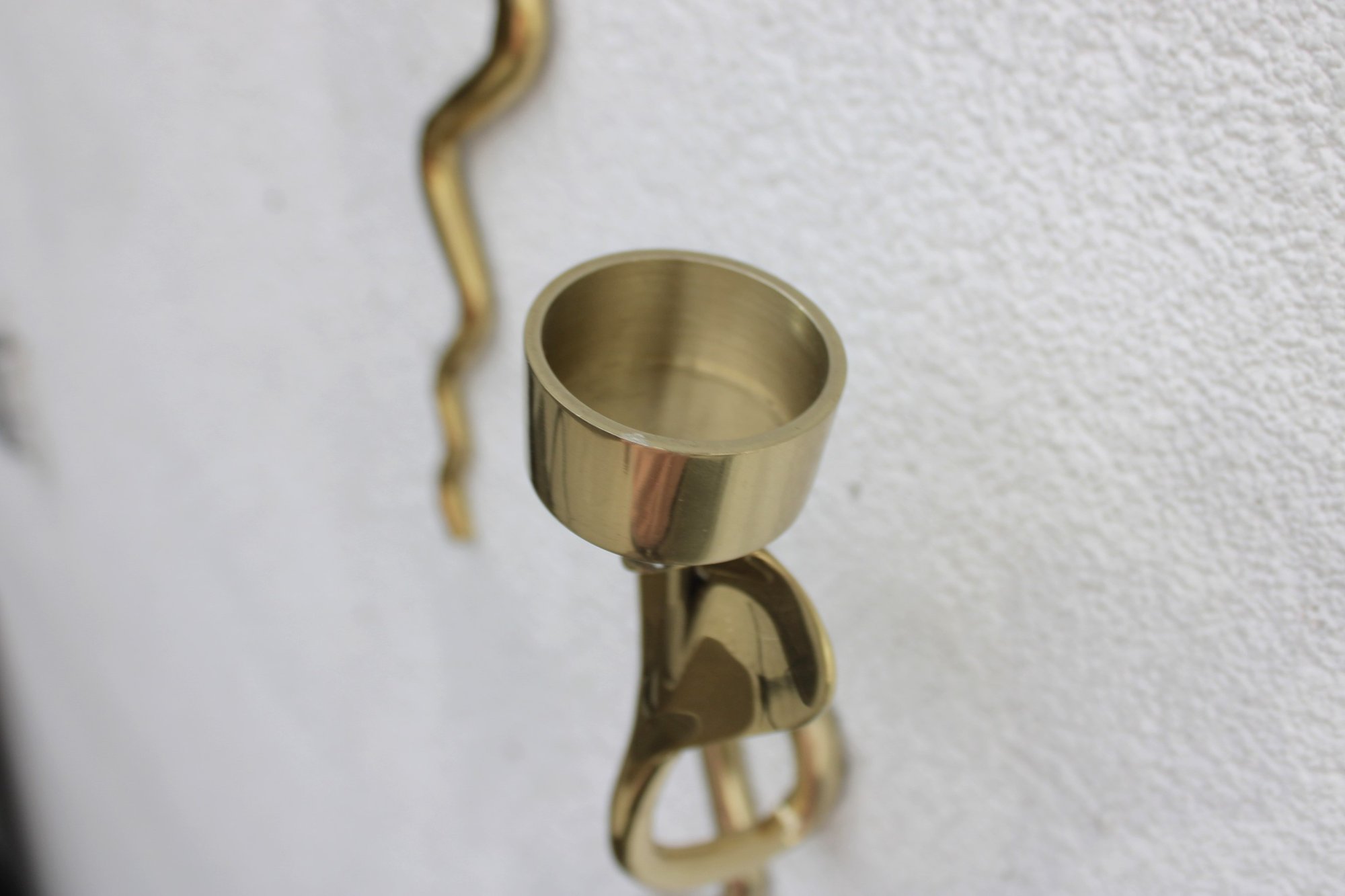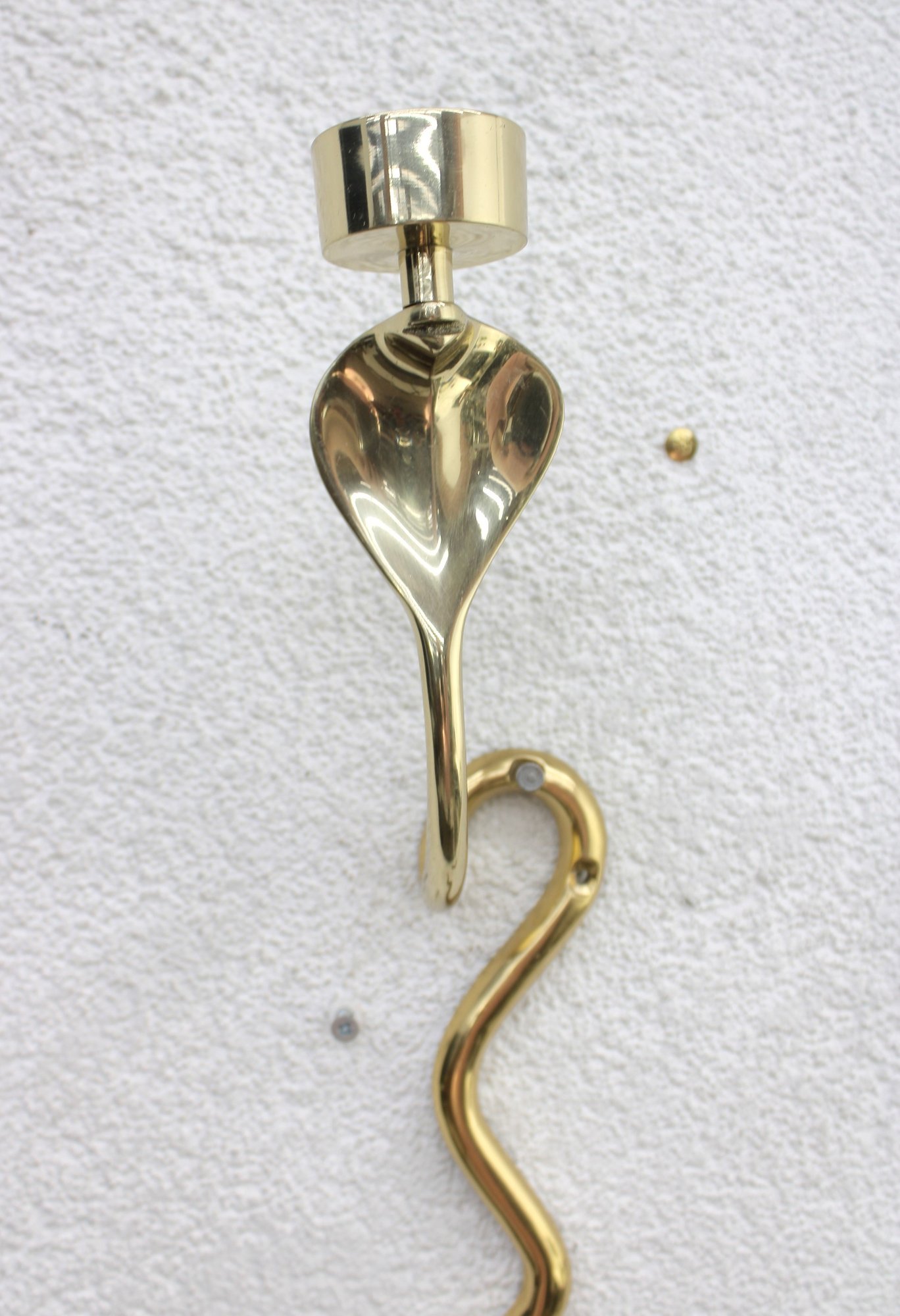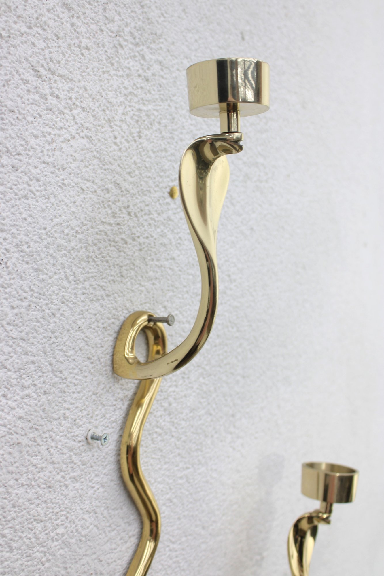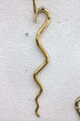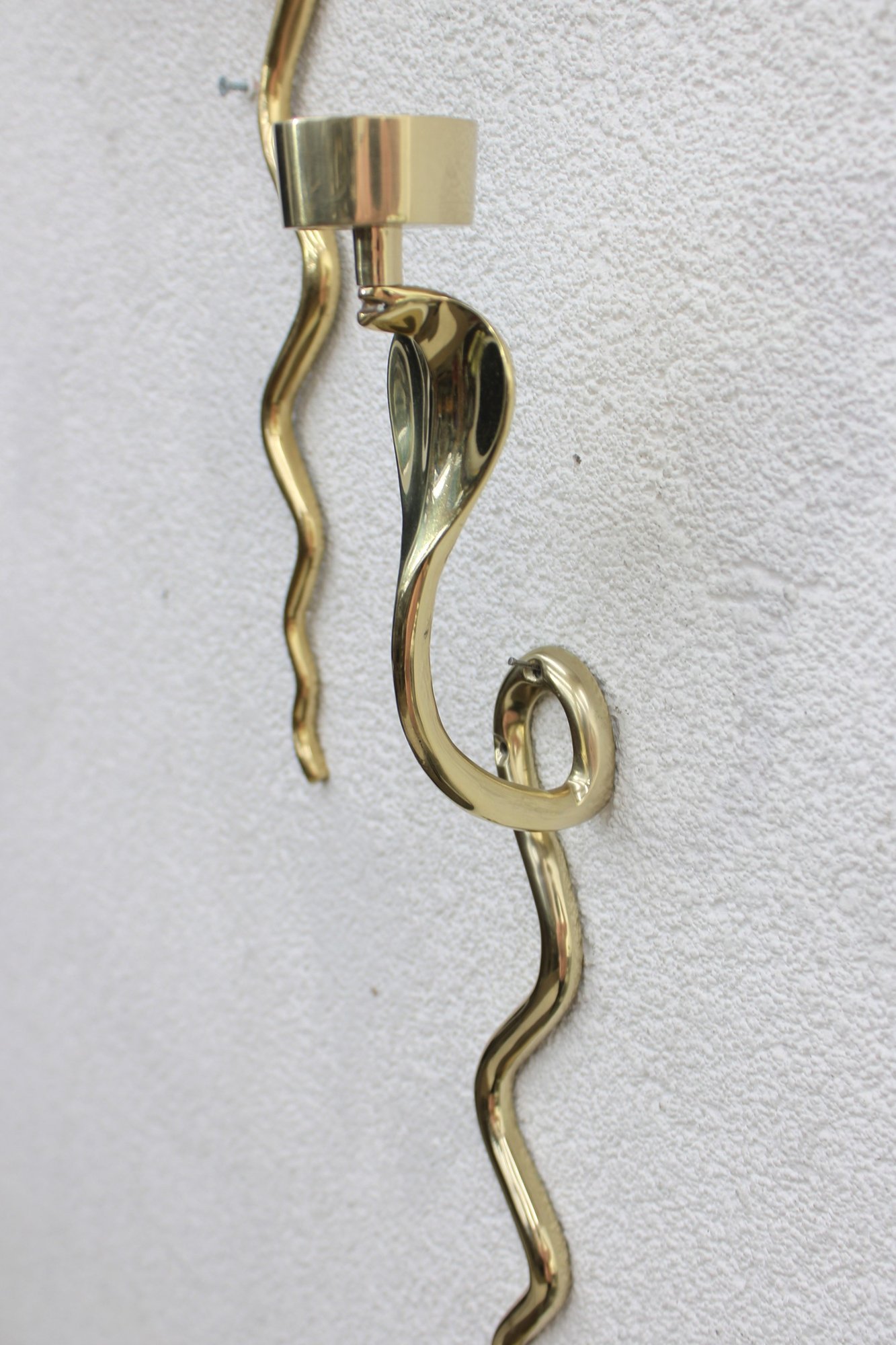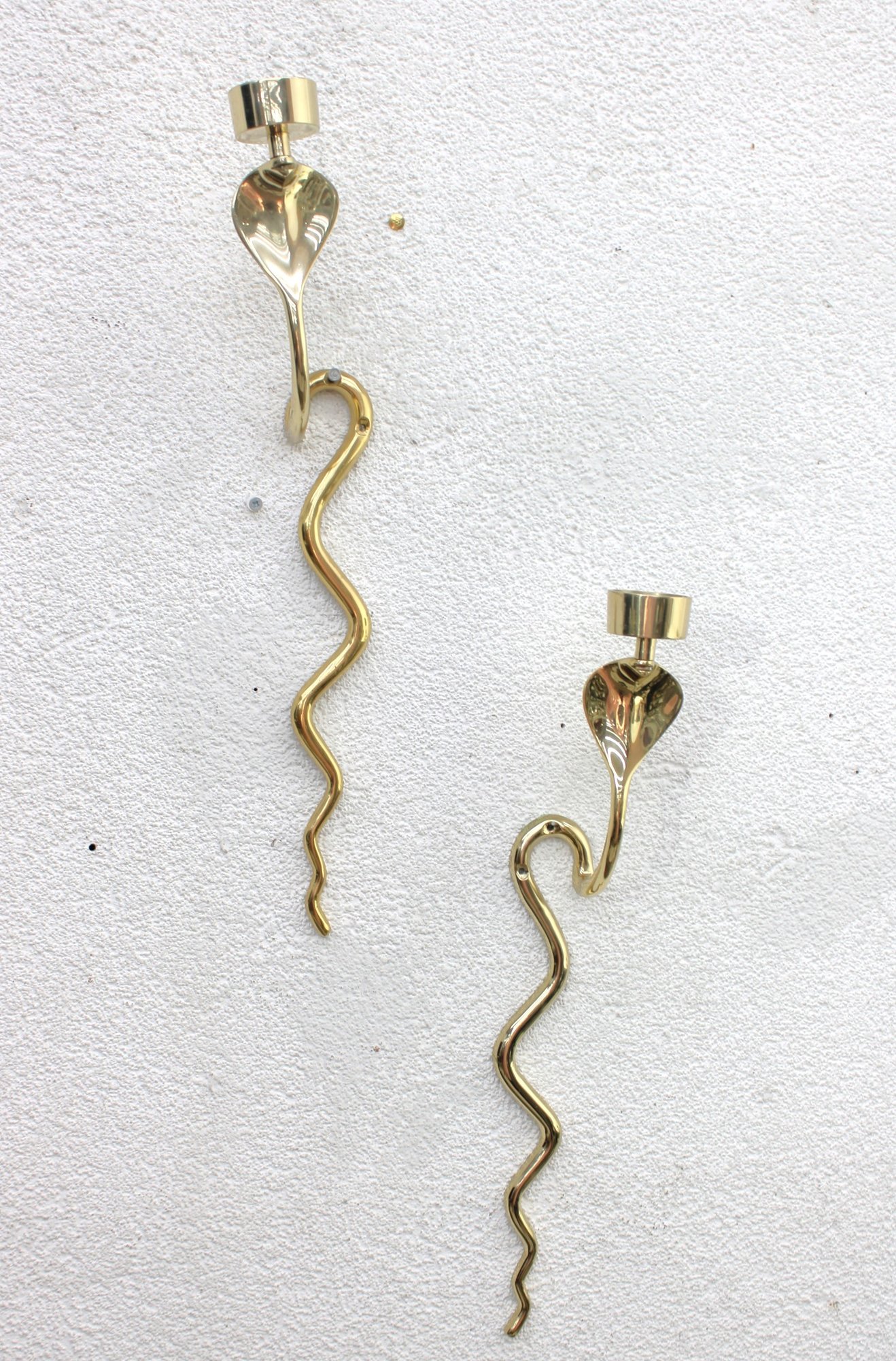 Unique and eye-catching pair of brass wall-mounted candle sconces designed in the form of stylized cobras. Each sconce features a sleek, sinuous body with an elegant hooded cobra motif supporting a single candle cup at the top.