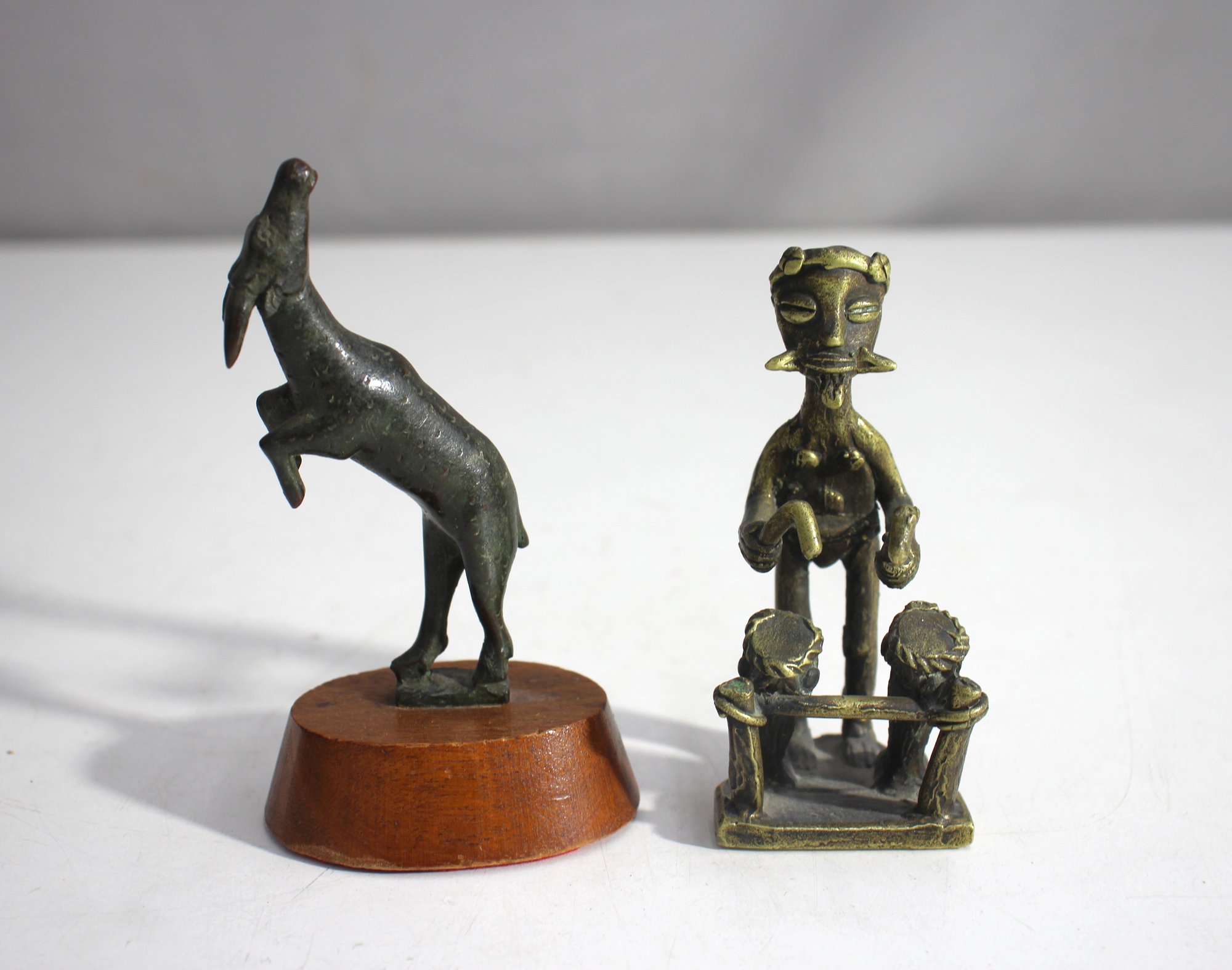 This unique set features two brass figurines, each with intricate details and individual character. The set includes a standing goat mounted on a wooden base and a drum player at work, capturing the craftsmanship and charm of traditional brass art.