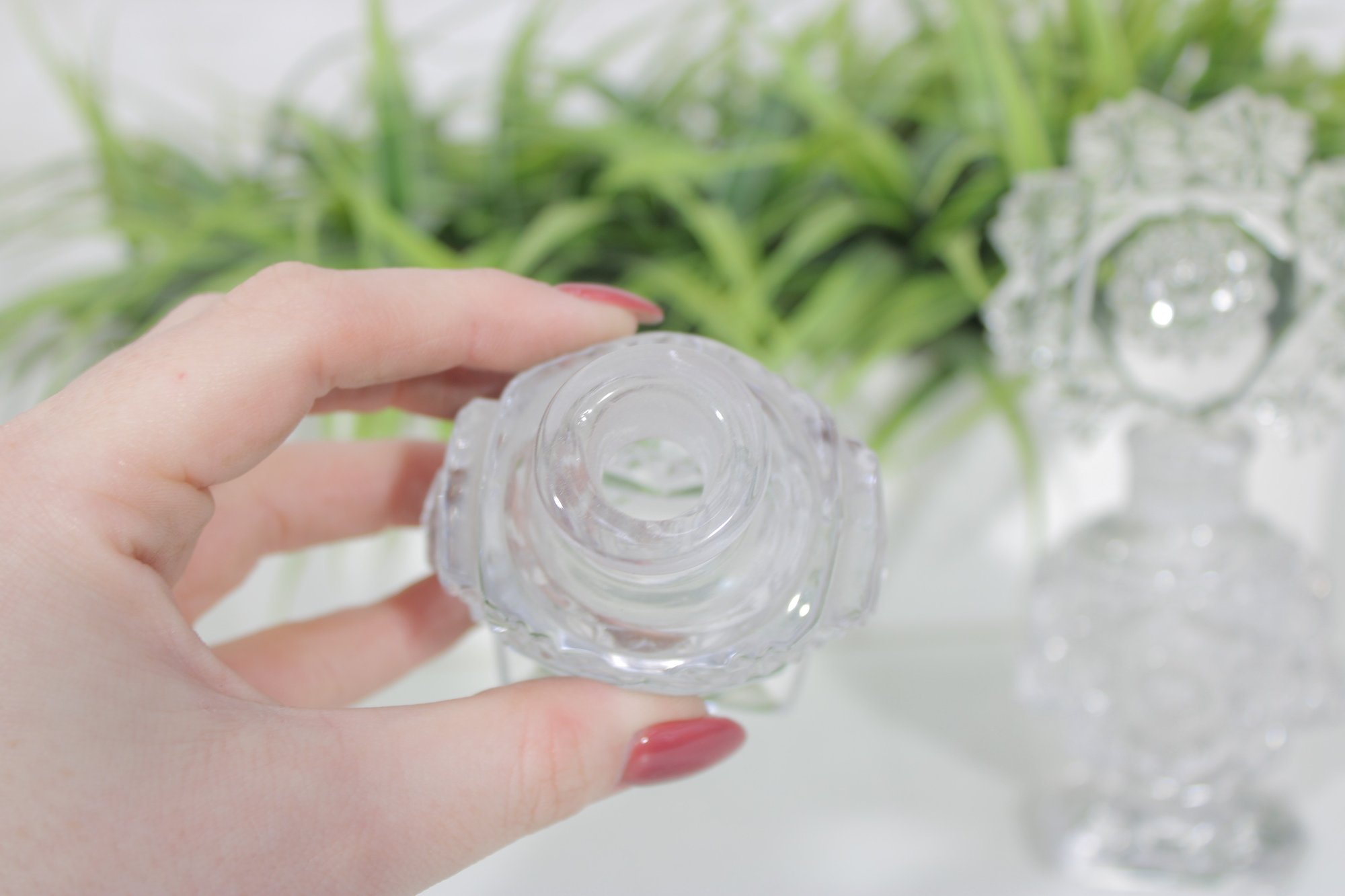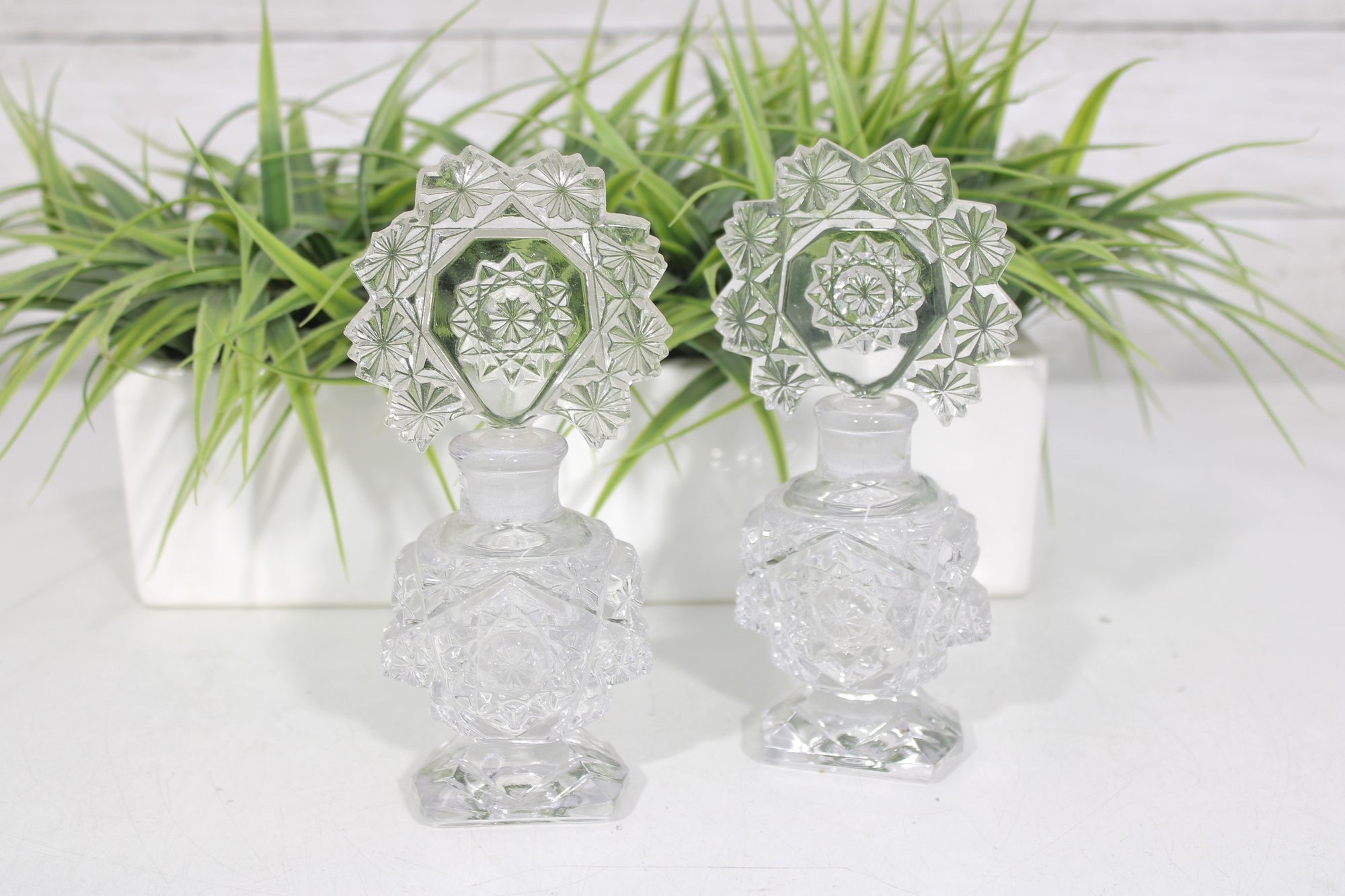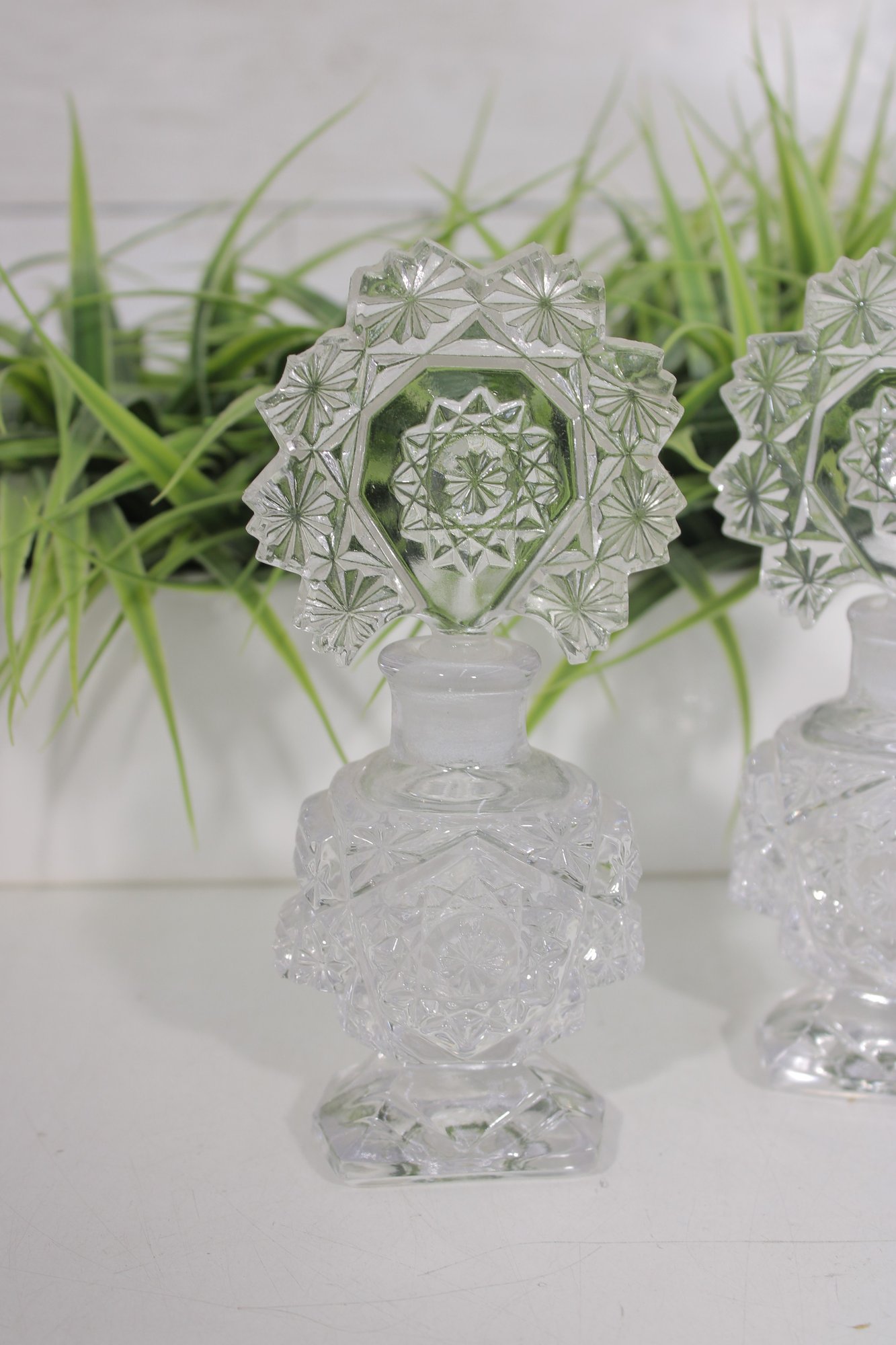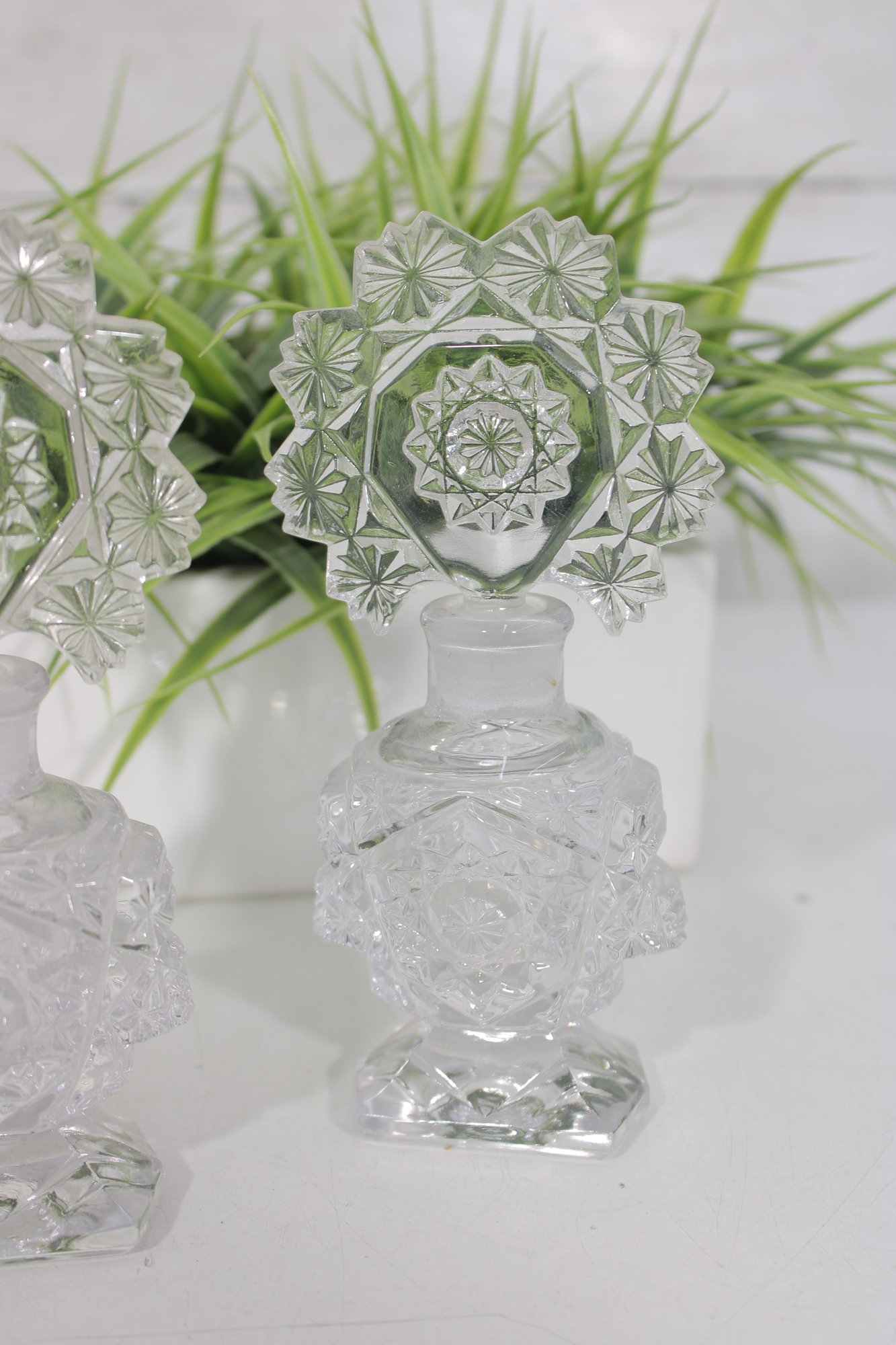 pair of vintage cut crystal perfume bottles, each measuring approximately 6.5 inches tall (including stoppers).