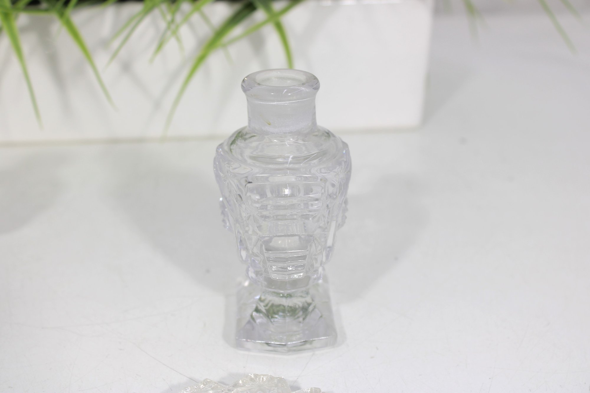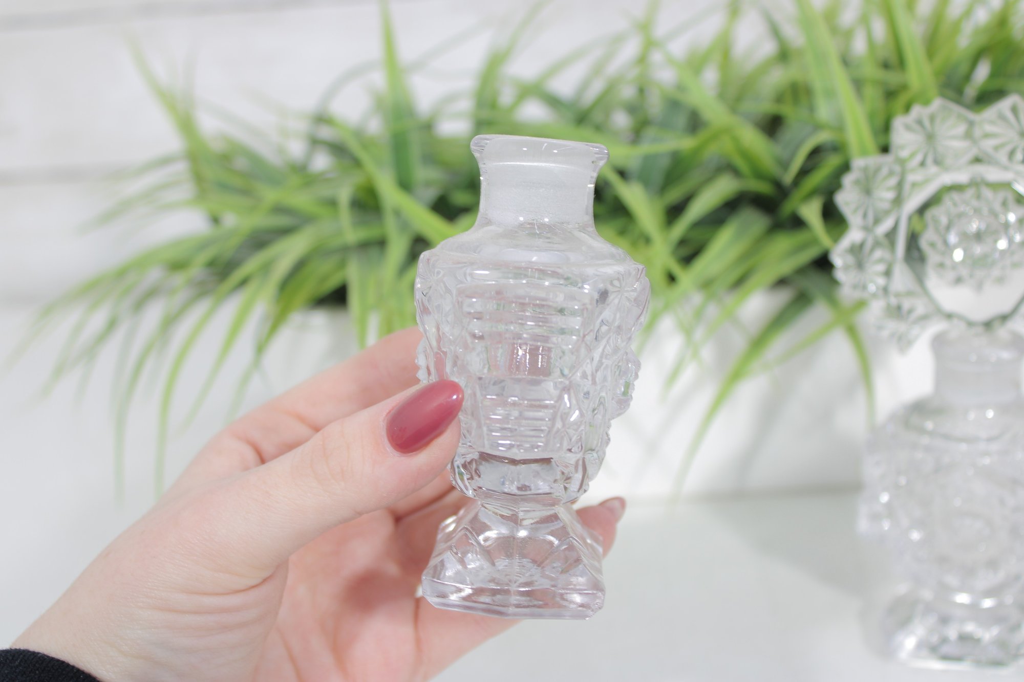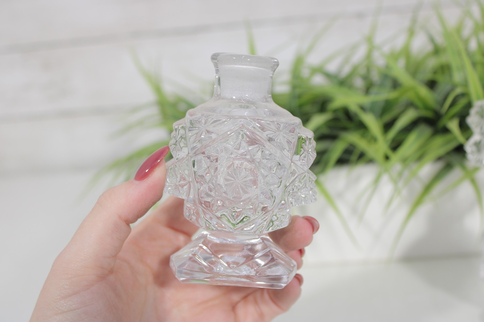 pair of vintage cut crystal perfume bottles, each measuring approximately 6.5 inches tall (including stoppers).