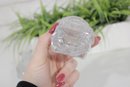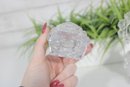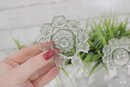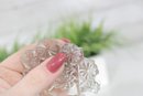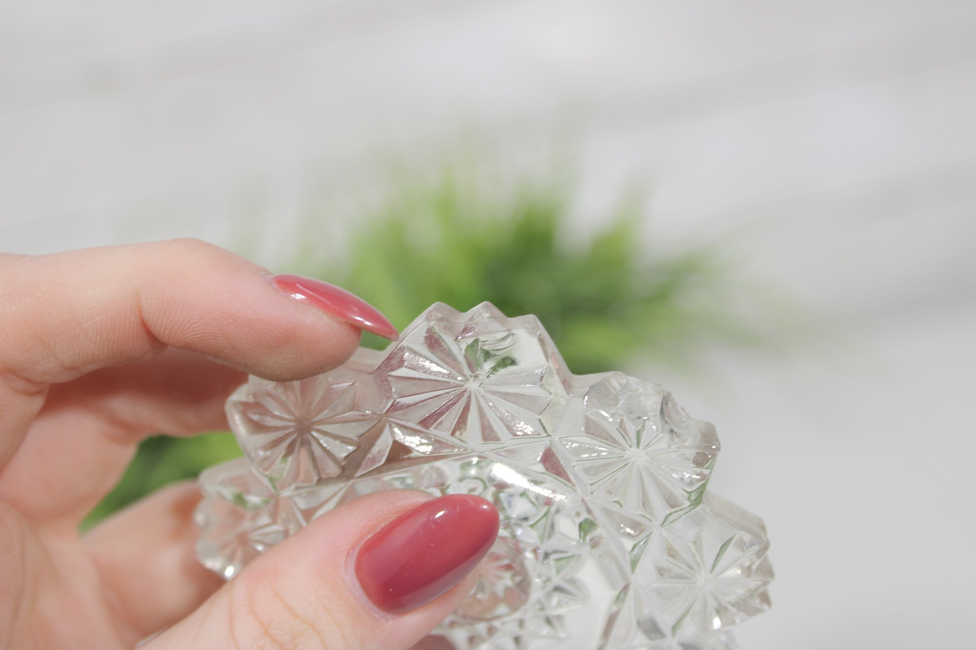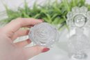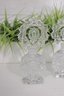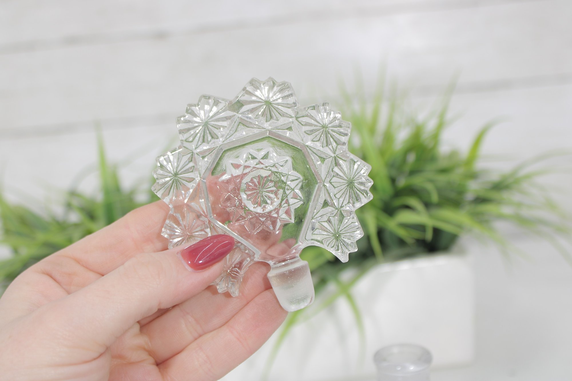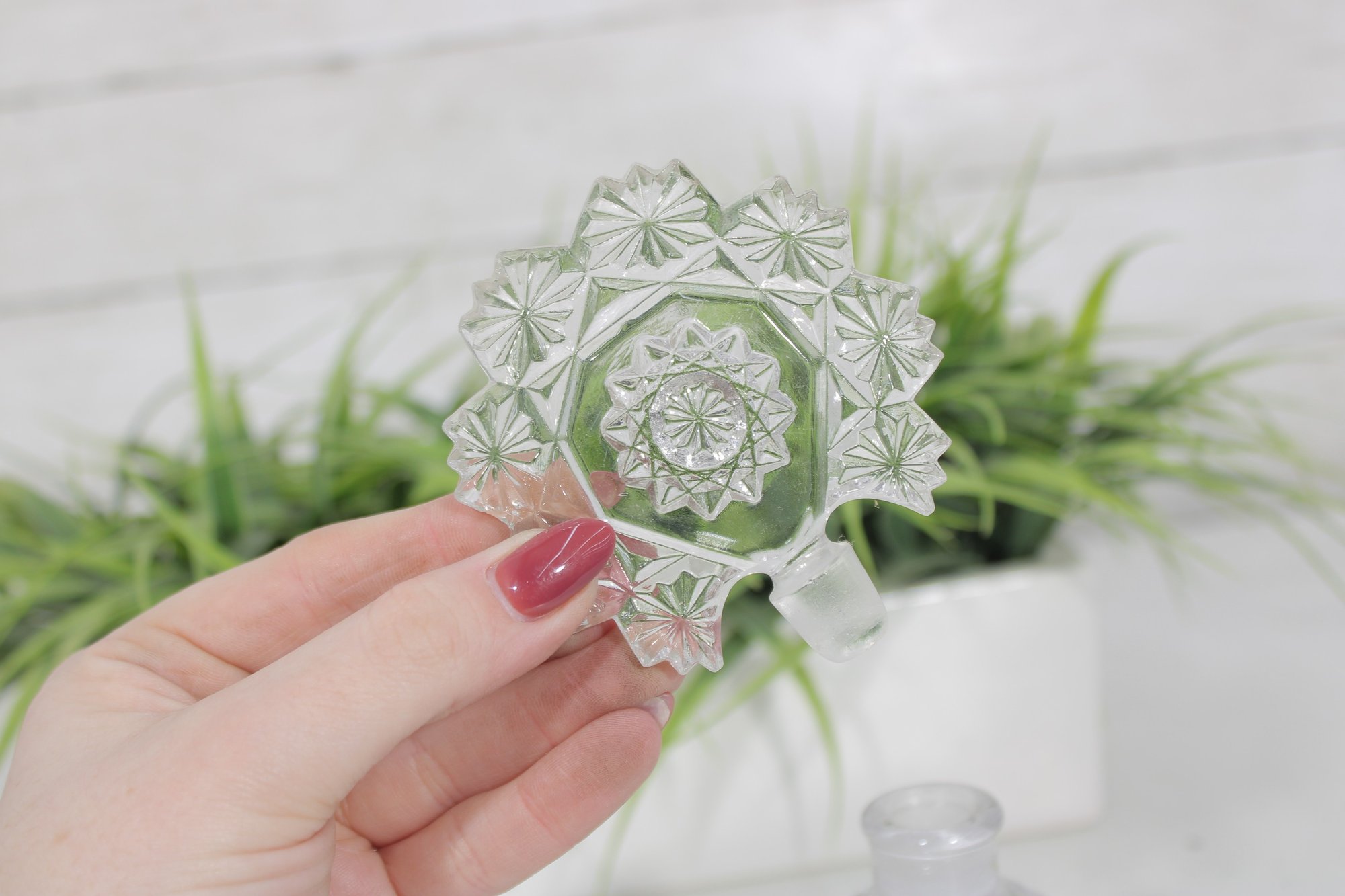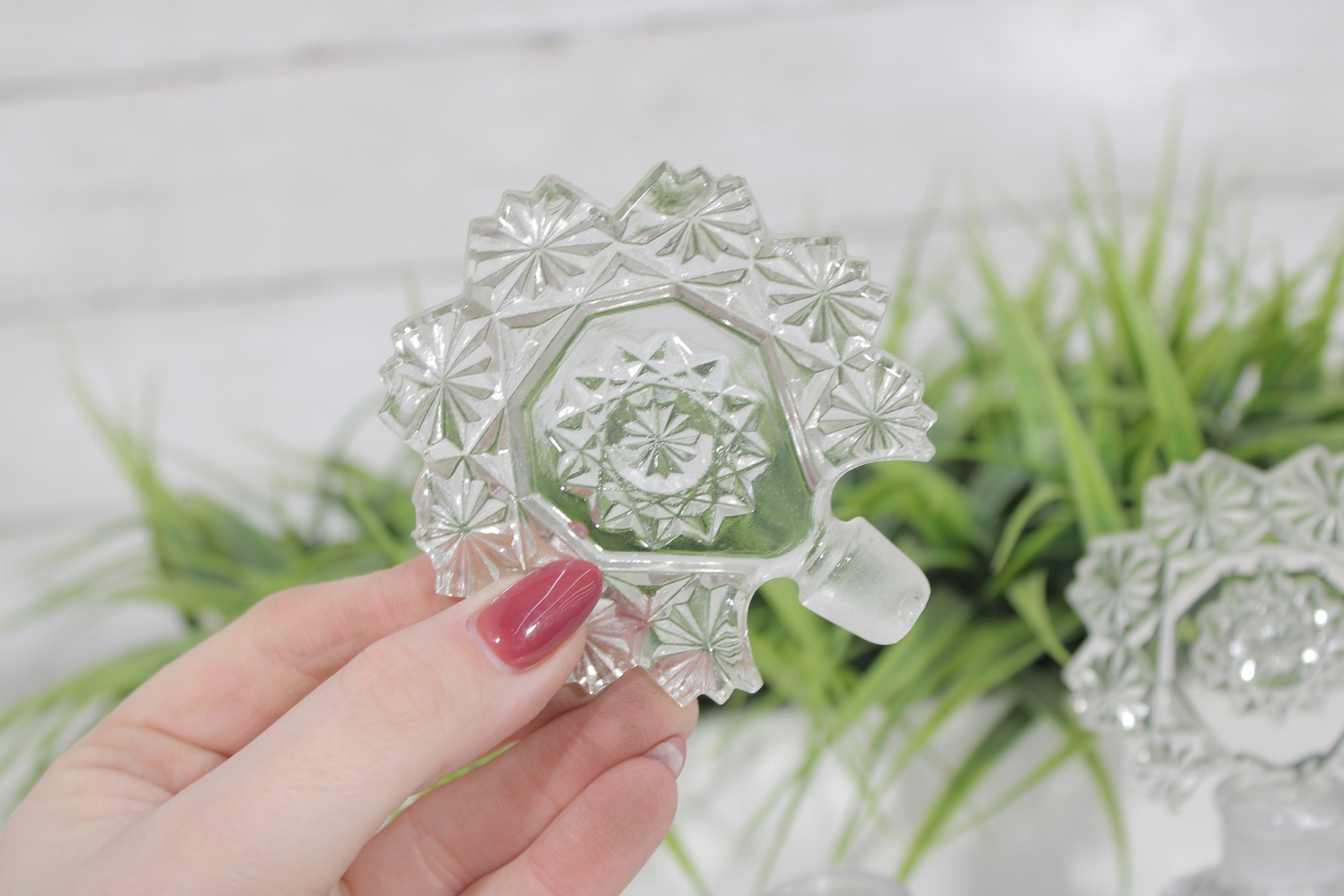 These elegant bottles feature deeply cut geometric and starburst patterns throughout the body, resting on faceted pedestal bases. The standout feature is the large, ornate starburst-style stopper tops, creating a dramatic and eye-catching vanity display.