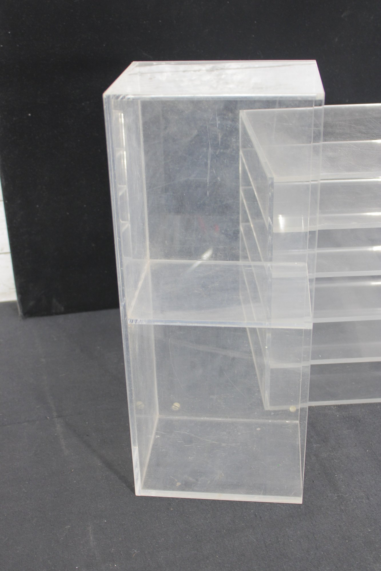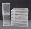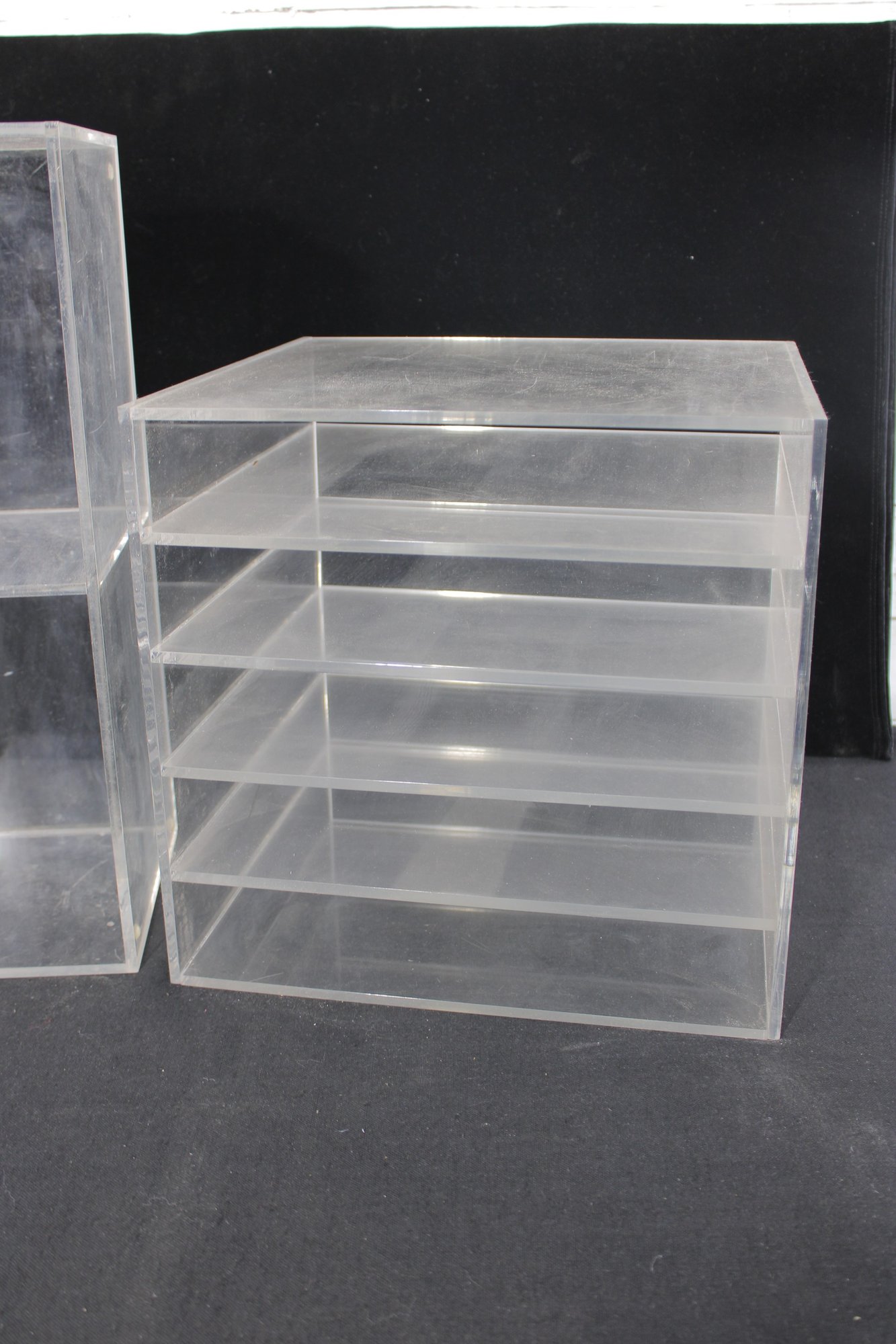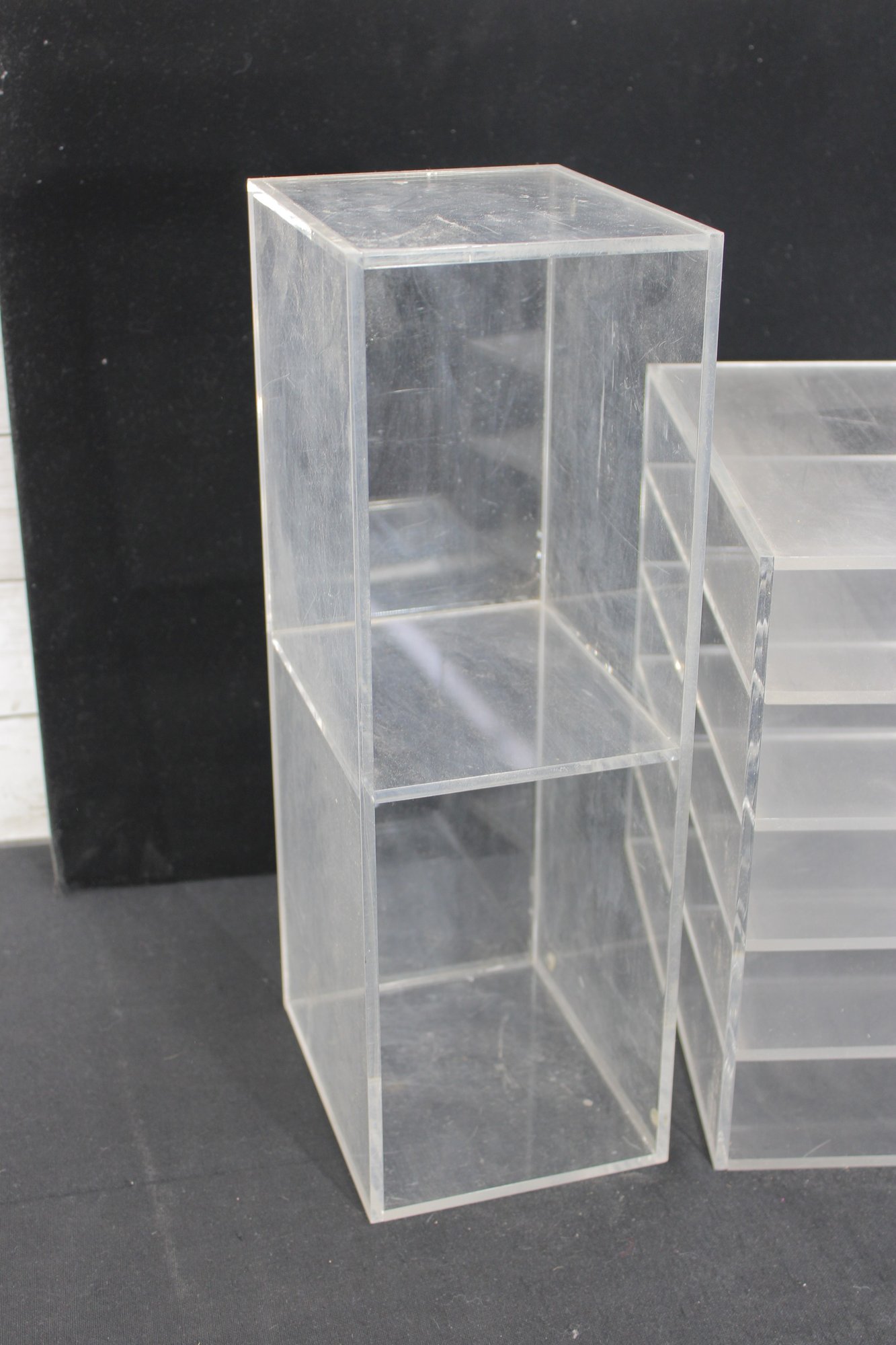 Set of two clear acrylic display/storage units featuring clean modern lines and versatile functionality. These transparent cases are perfect for organizing and showcasing collectibles, cosmetics, jewelry, small merchandise, or desk accessories.