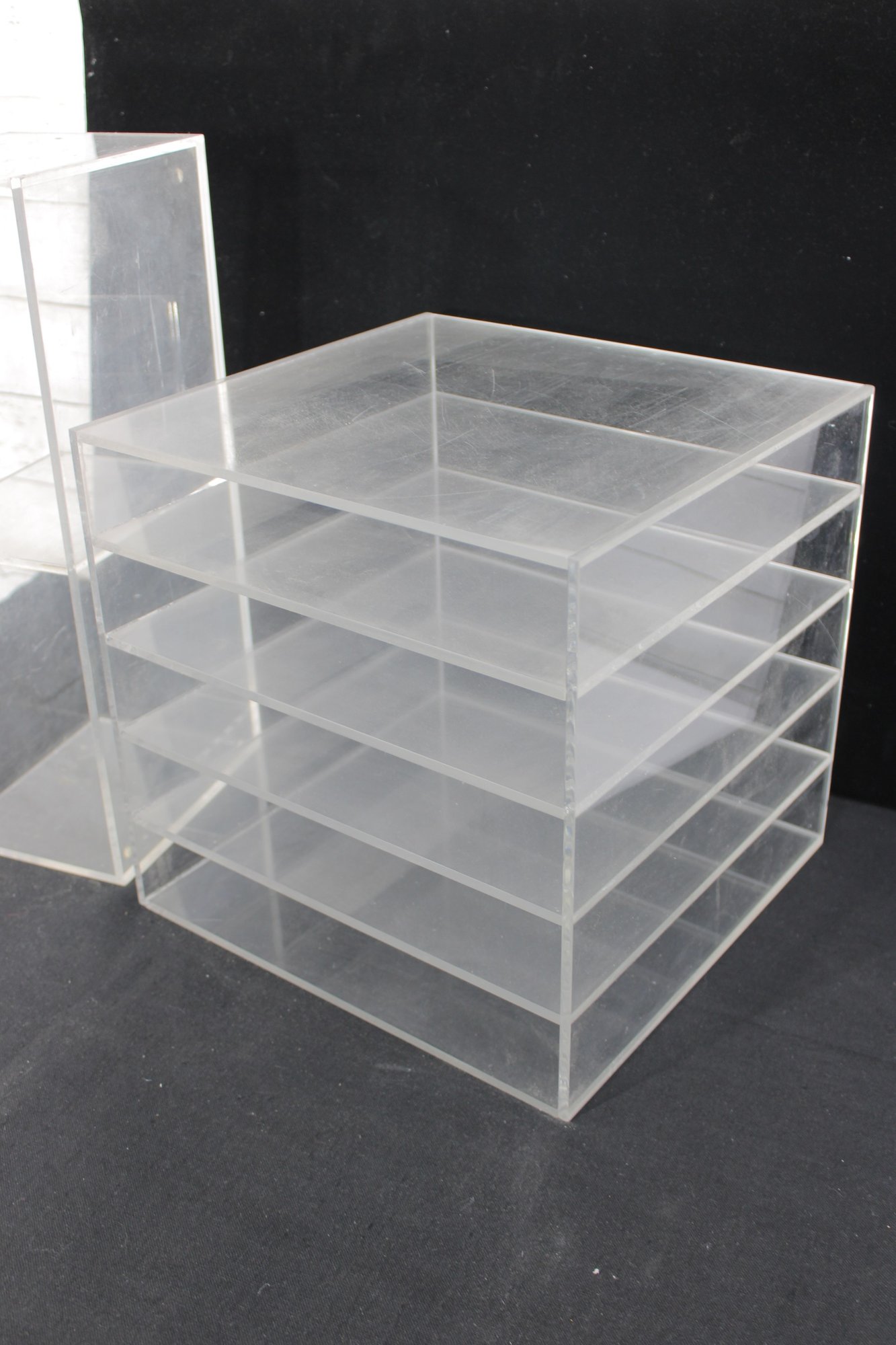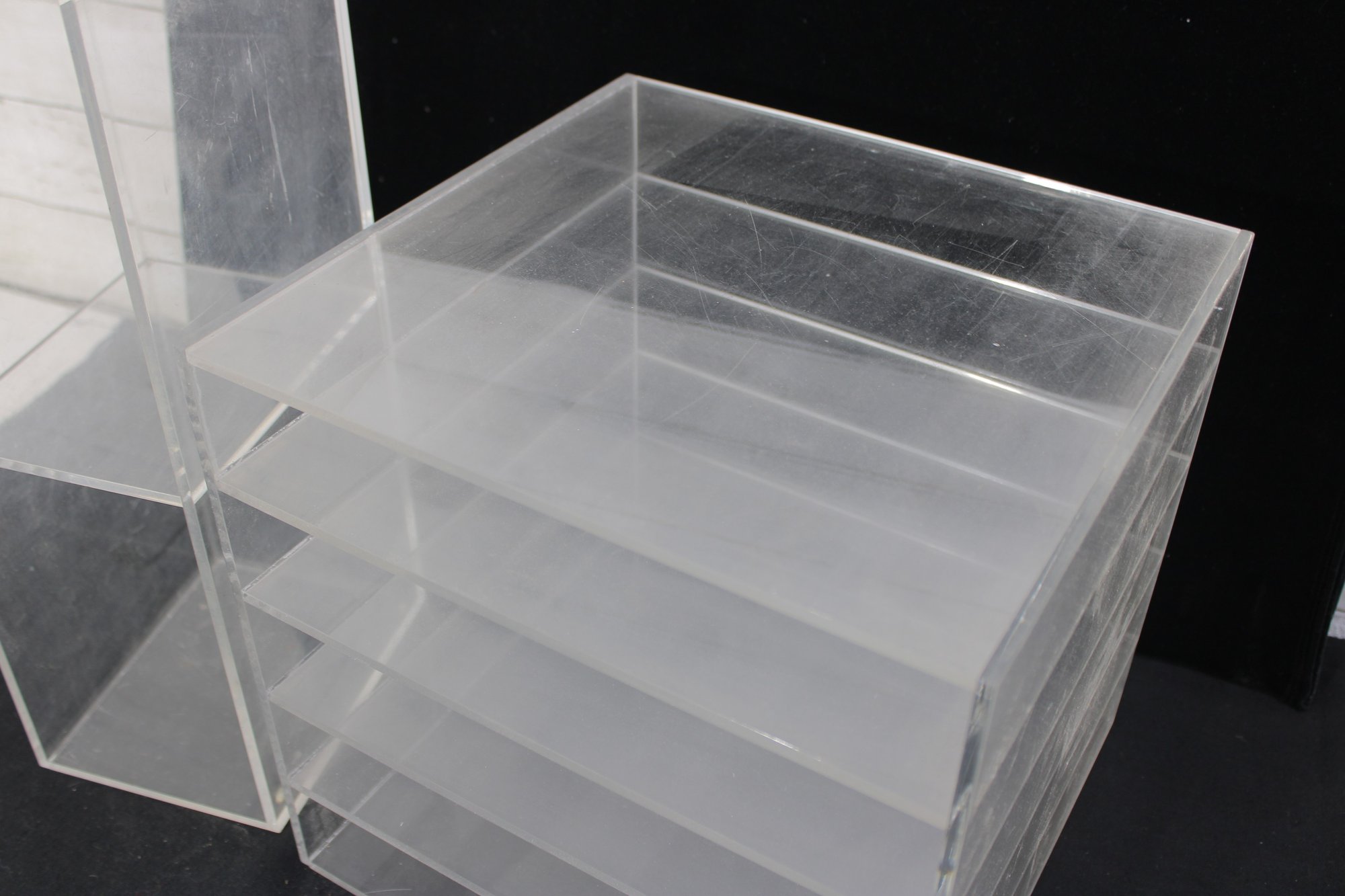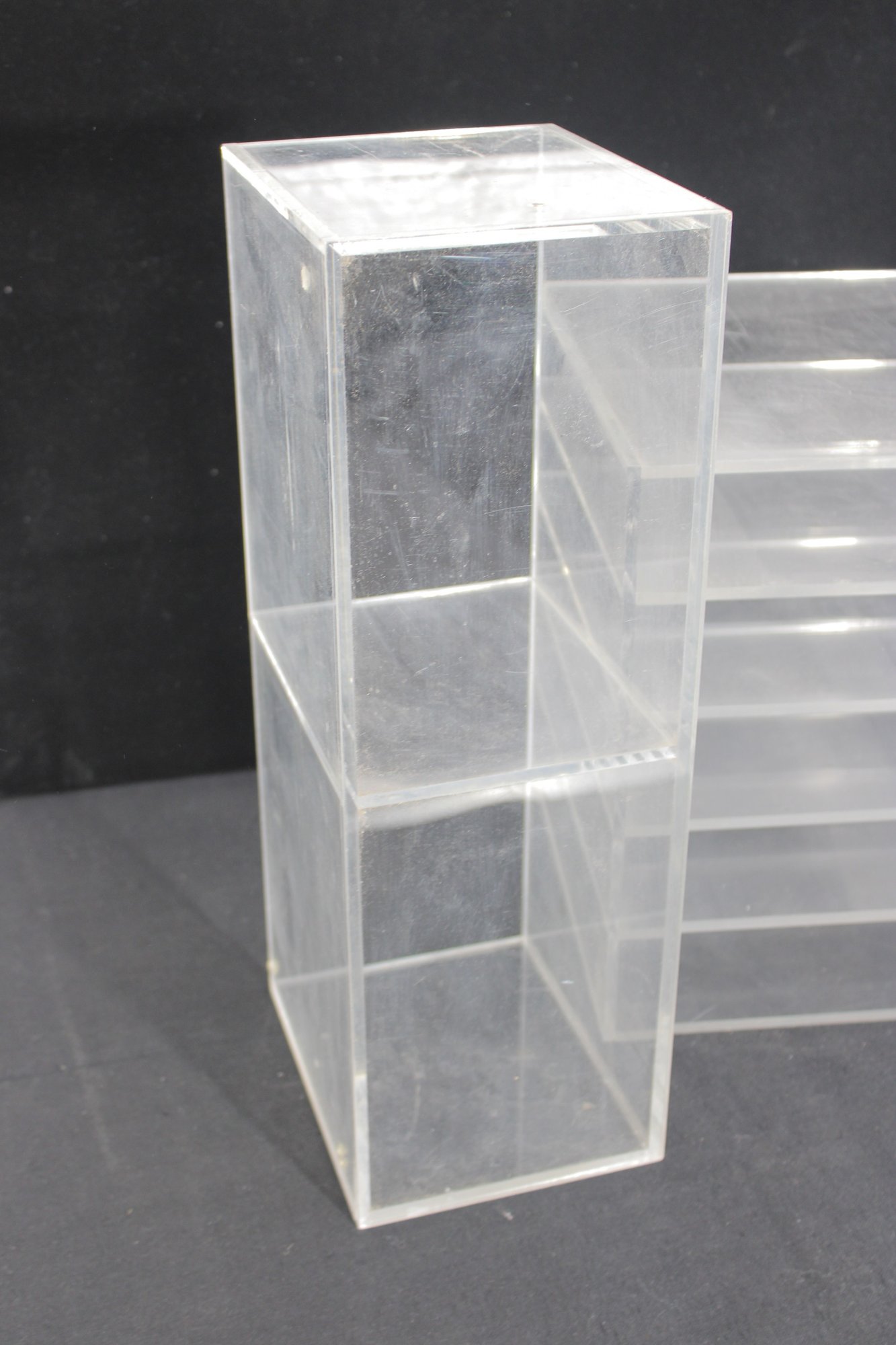 Set of two clear acrylic display/storage units featuring clean modern lines and versatile functionality. These transparent cases are perfect for organizing and showcasing collectibles, cosmetics, jewelry, small merchandise, or desk accessories.