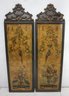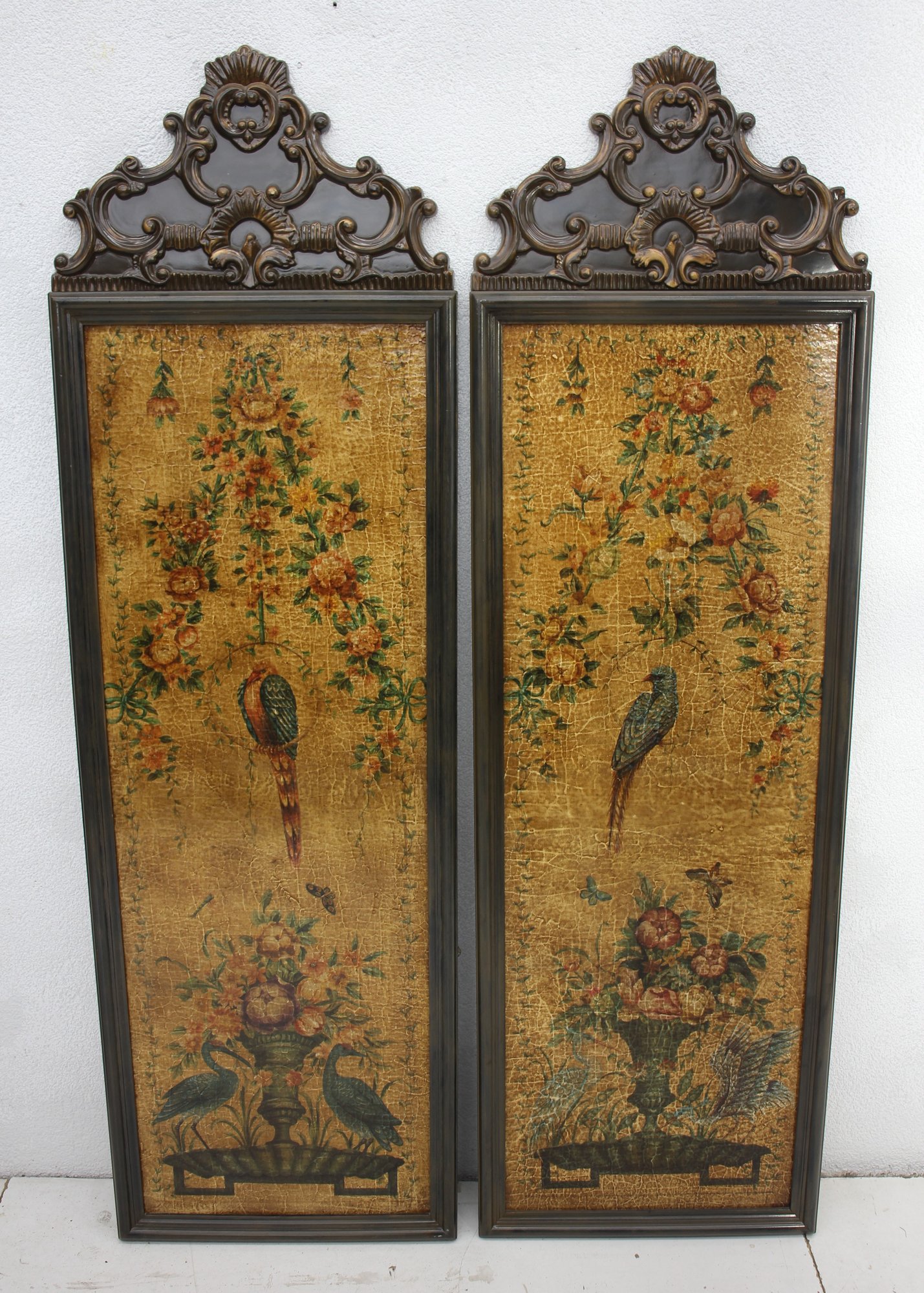 This exquisite pair o decorative panels features vibrant,floral motifs and exotic birds on a crackled golden background, exuding timeless elegance and sophistication. Measuring 65.5 inches in height and 20 inches in width, these pieces are framed with intricately carved wood, showcasing ornate baroque-style details at the top. The craftsmanship highlights a harmonious blend of artistry and design, perfect for collectors or interior enthusiasts seeking unique statement décor. Condition shows natural aging and patina, adding character and authenticity. A stunning addition to any classic or vintage-inspired space!