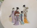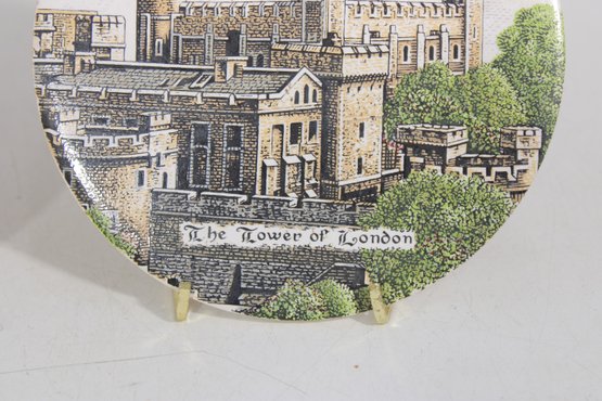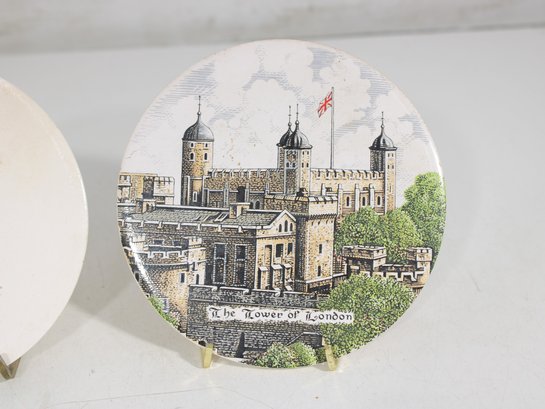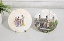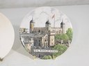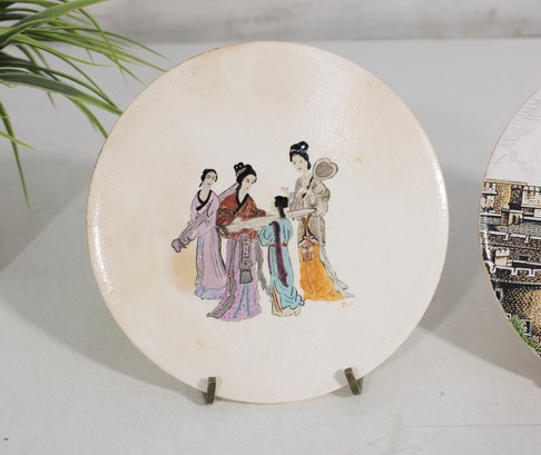 Charming pair of decorative collector plates featuring two distinct and eye-catching designs. One plate showcases an elegant Asian-inspired figural scene with three women in traditional attire, rendered in soft, hand-painted style colors. The second plate depicts a detailed illustration of the historic Tower of London, complete with architectural detail and scenic surroundings.