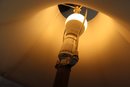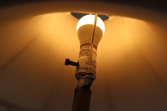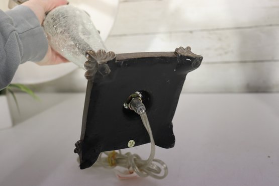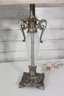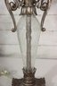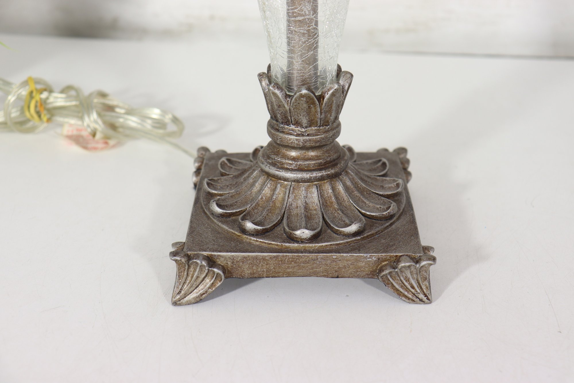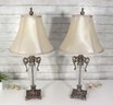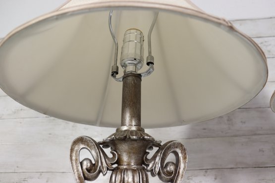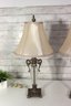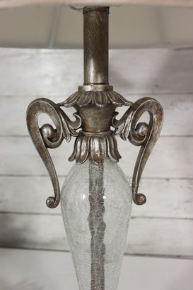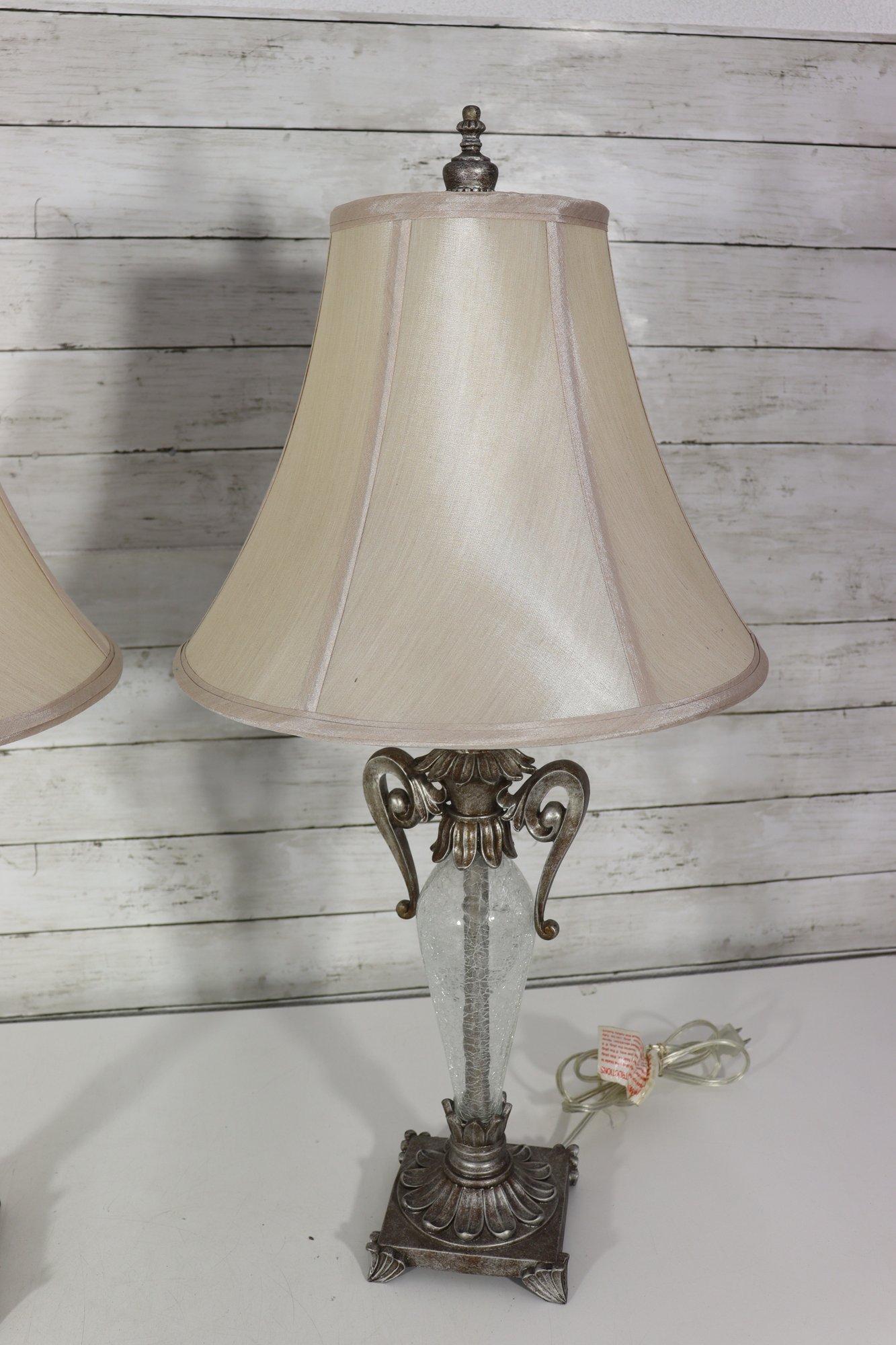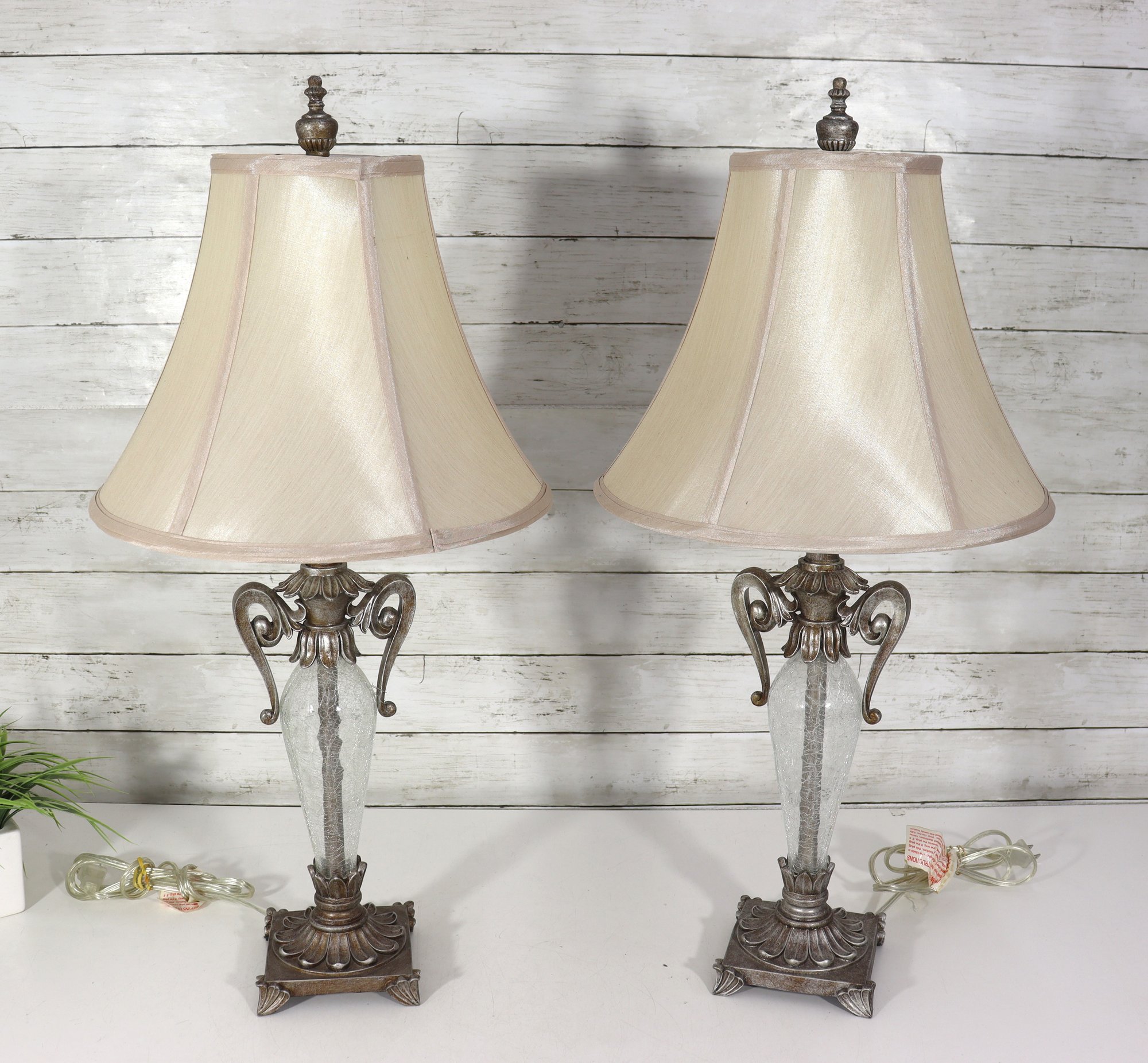 Each lamp features a sculpted metal base with scroll accents, a faceted glass center column, and a neutral fabric shade that softly diffuses light. The lamps are sturdy, well-balanced, and make excellent statement pieces for end tables, nightstands, or a formal living space.