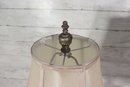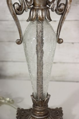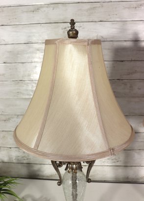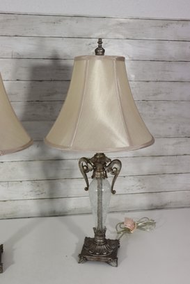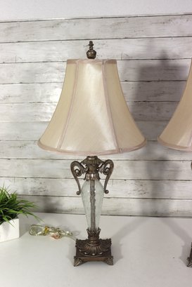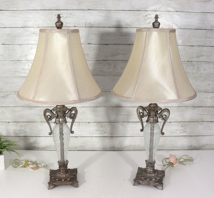 a beautiful matching pair of decorative table lamps featuring ornate metal detailing, textured glass columns, and classic fabric shades. These lamps have a timeless, elegant look that works beautifully in traditional, vintage, or transitional interiors.